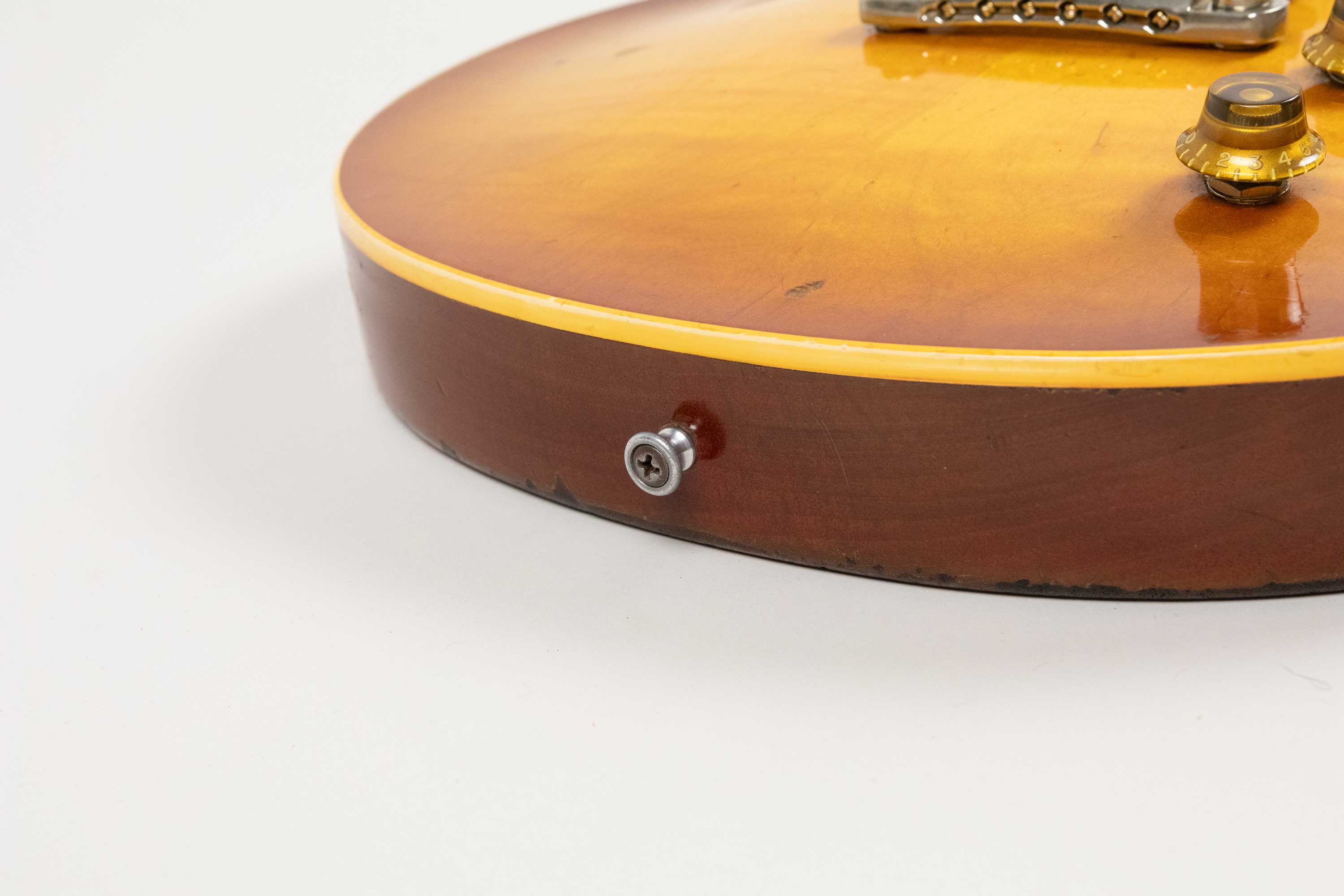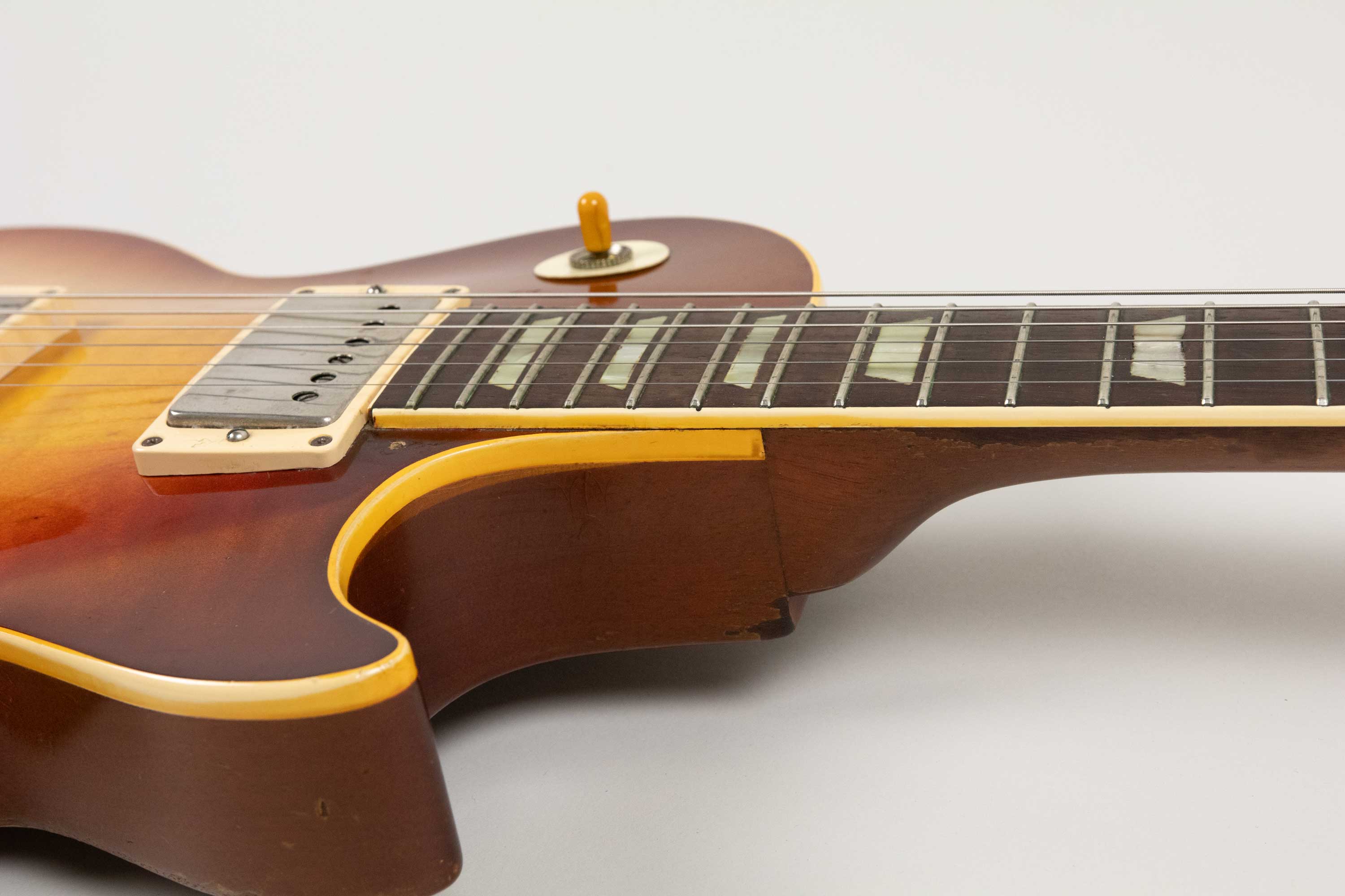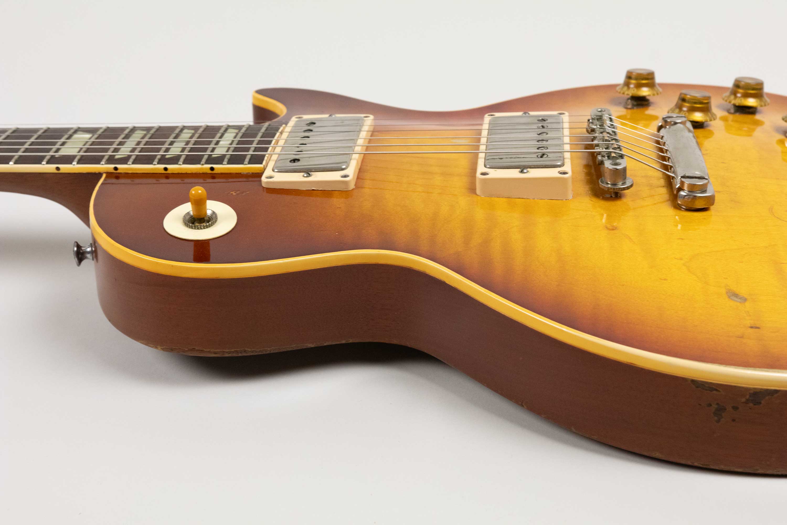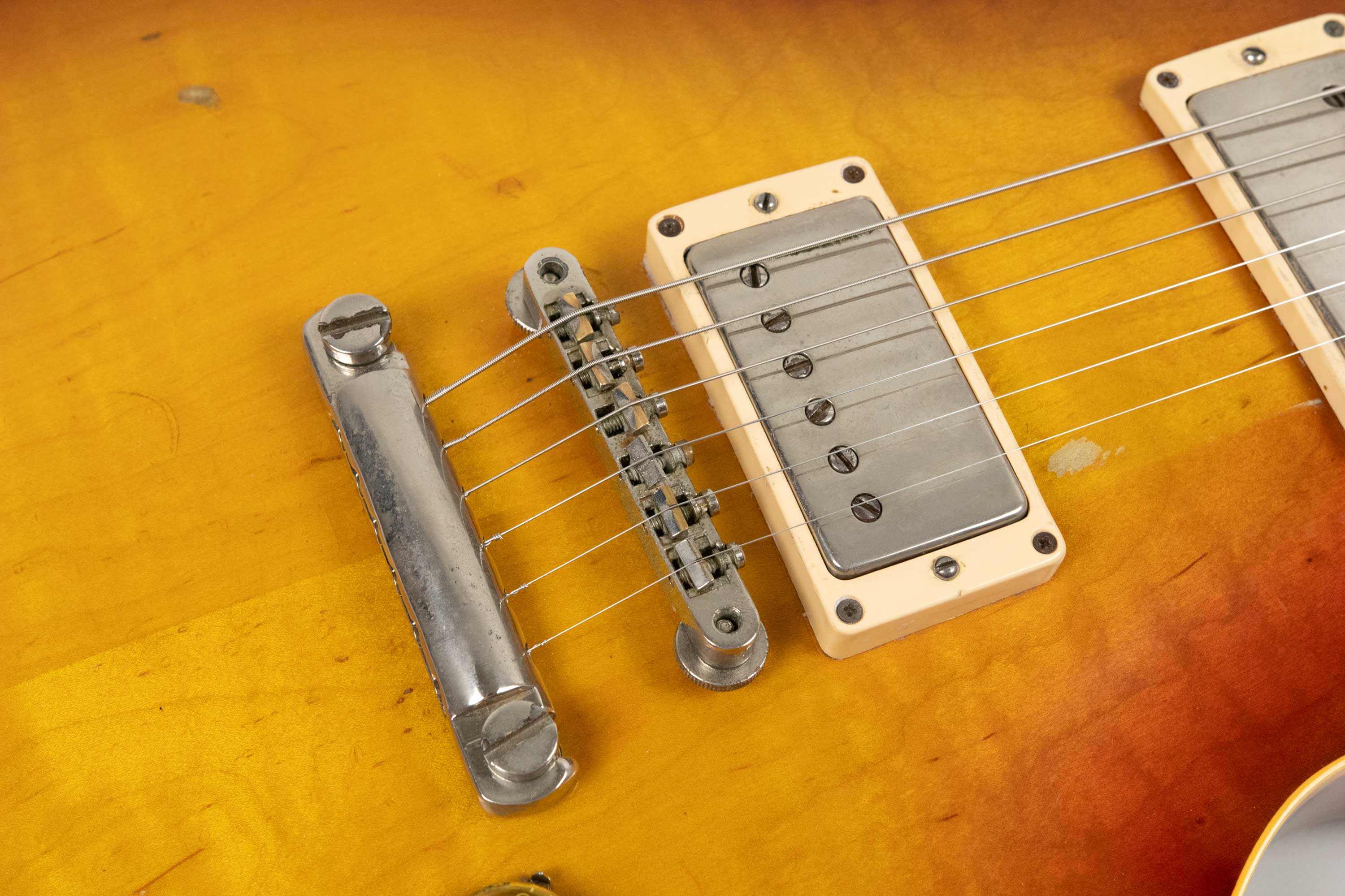 It retains its original PAF humbuckers, both have had their covers off and the neck has had new tape fitted so we must assume it has either been rewound or repaired at some point in it's life. The outputs are 8.92k at the neck and 8.37k at the bridge. It is a superb sounding example that really lives up to the legend. A real player's tone machine resulting in a wonderfully dynamic, harmonically rich Burst voice with airy highs, piano-like lows, and that unmistakable bloom and sustain that made these models famous. Acoustically, the guitar is loud, resonant, and alive - a testament to the quality of woods, hardware and craftsmanship during this period of Gibson production. The neck is everything you hope for in a ’59: a perfectly balanced medium chunky C profile with that silky broken-in feel only decades of play can create.