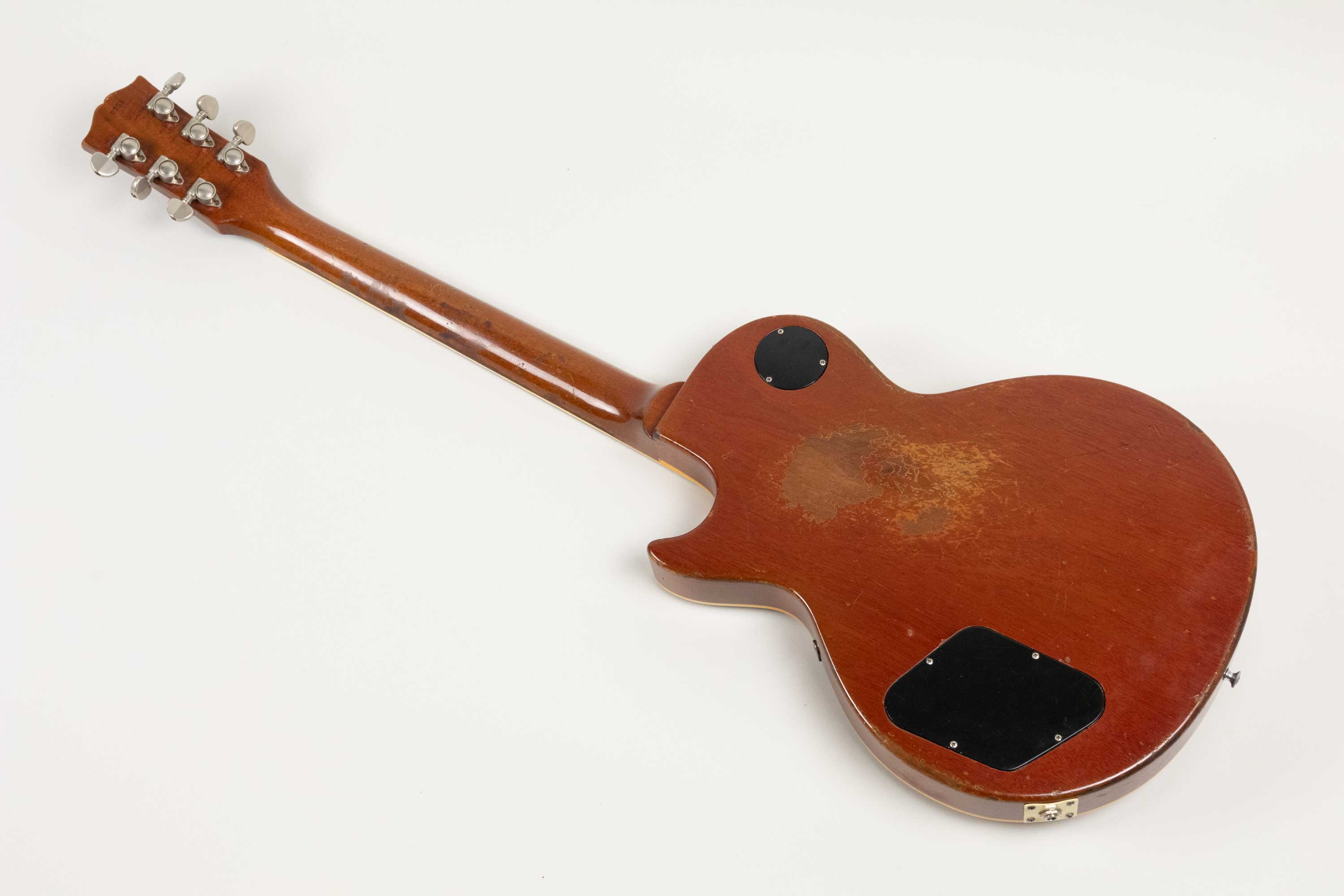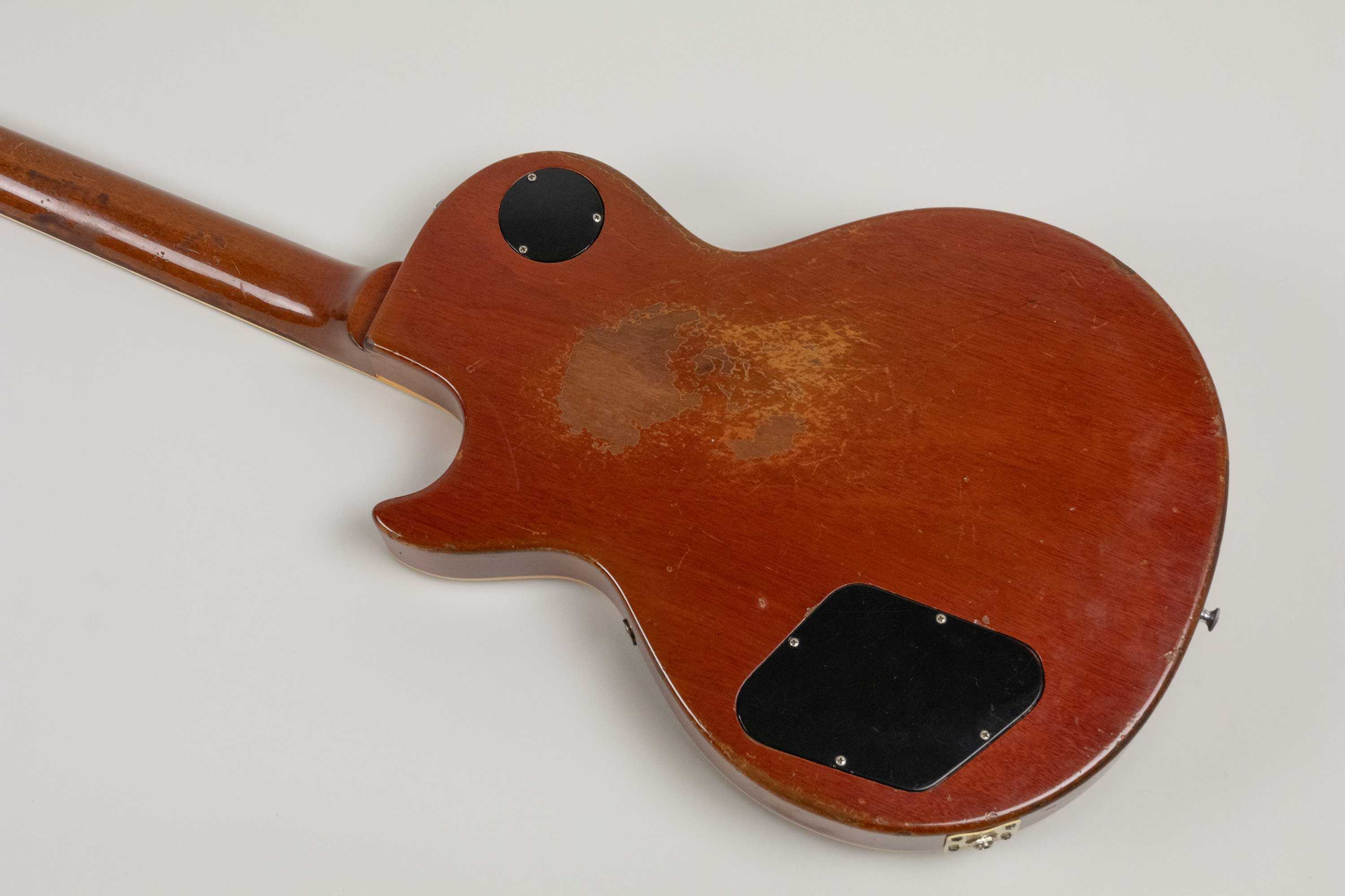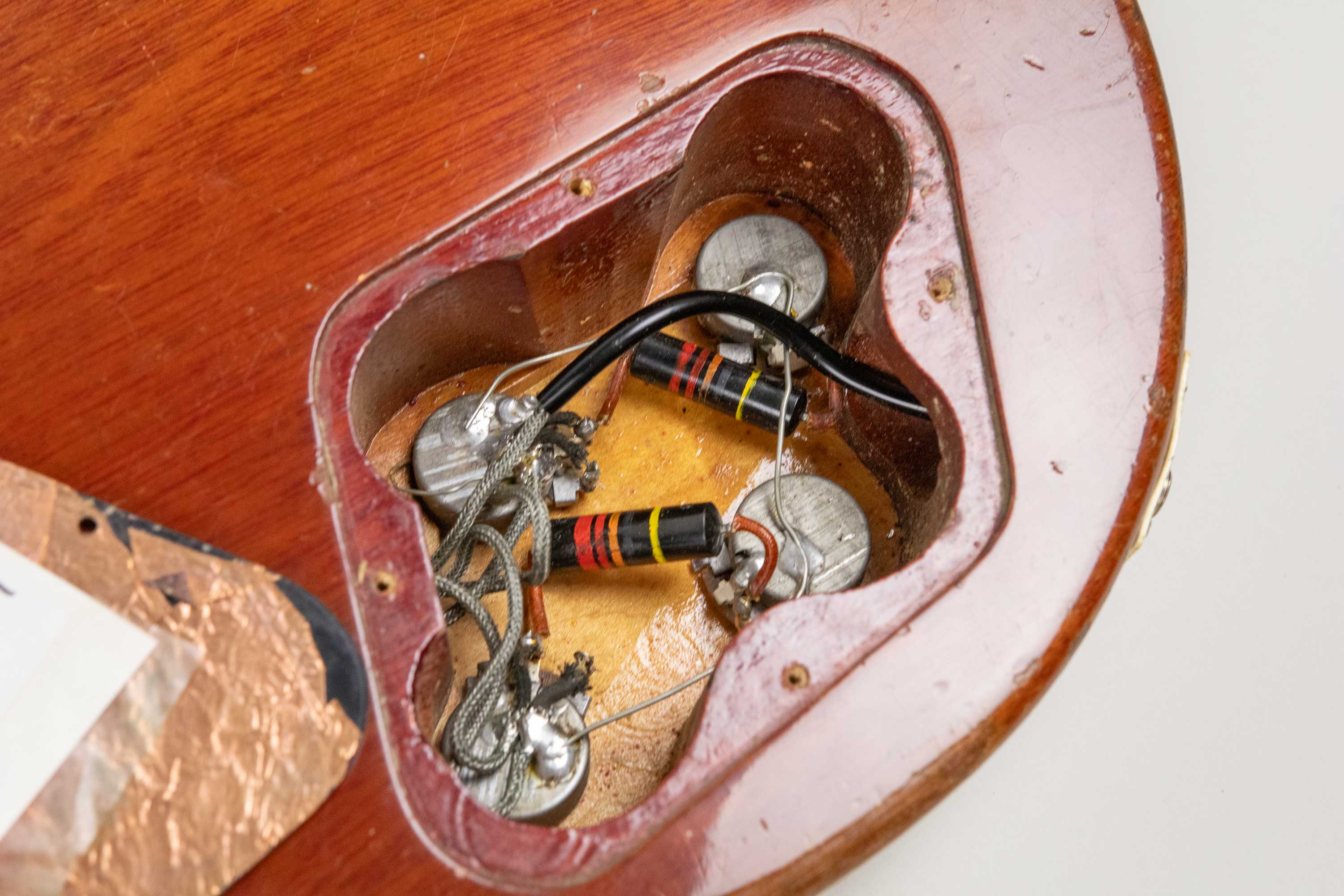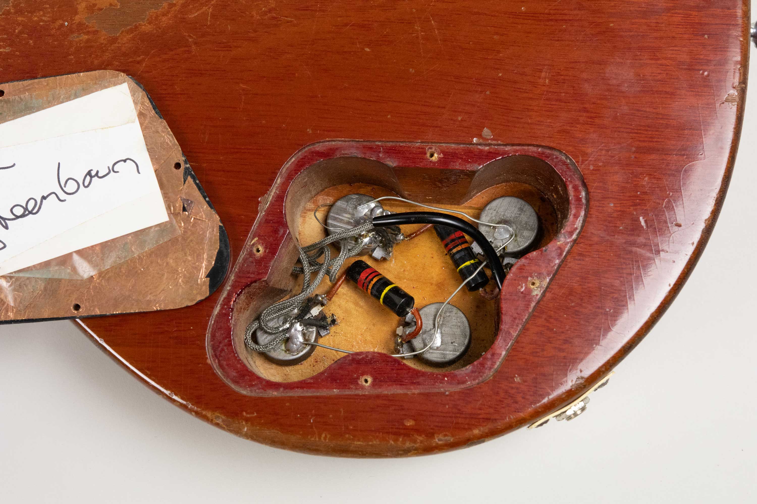 In terms of changes it has a repro tailpiece fitted, 2 x replaced saddles on the original ABR-1, 3 x neck pickup ring screws replaced, 1 x bridge pickup ring screw replaced, Grover tuners fitted and copper shielding foil added to inside of cavity cover. Interestingly, taped to the underside of the cavity cover is Peter Green's signature which appears to be authentic, likely placed their by a fan prior to the current owner.