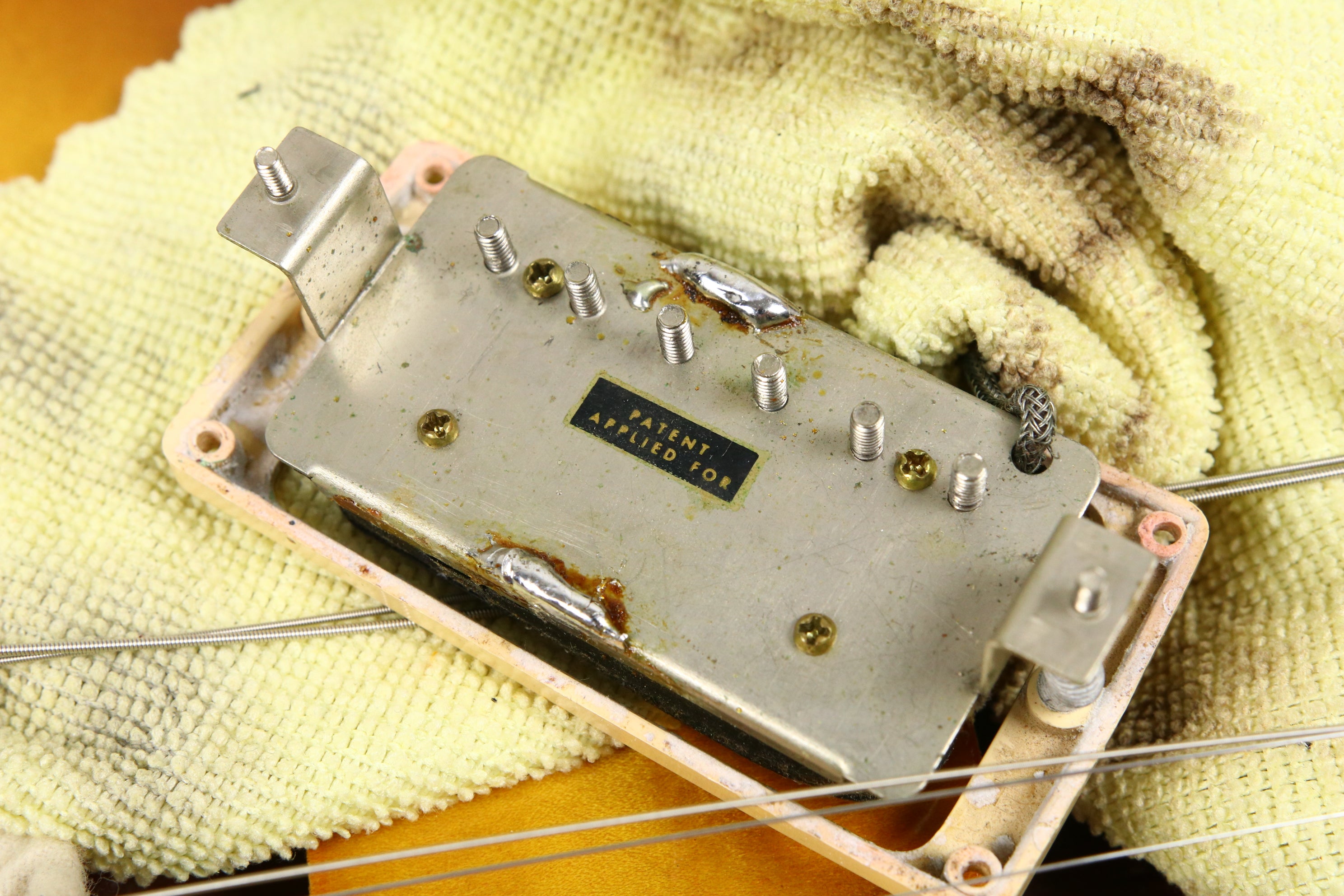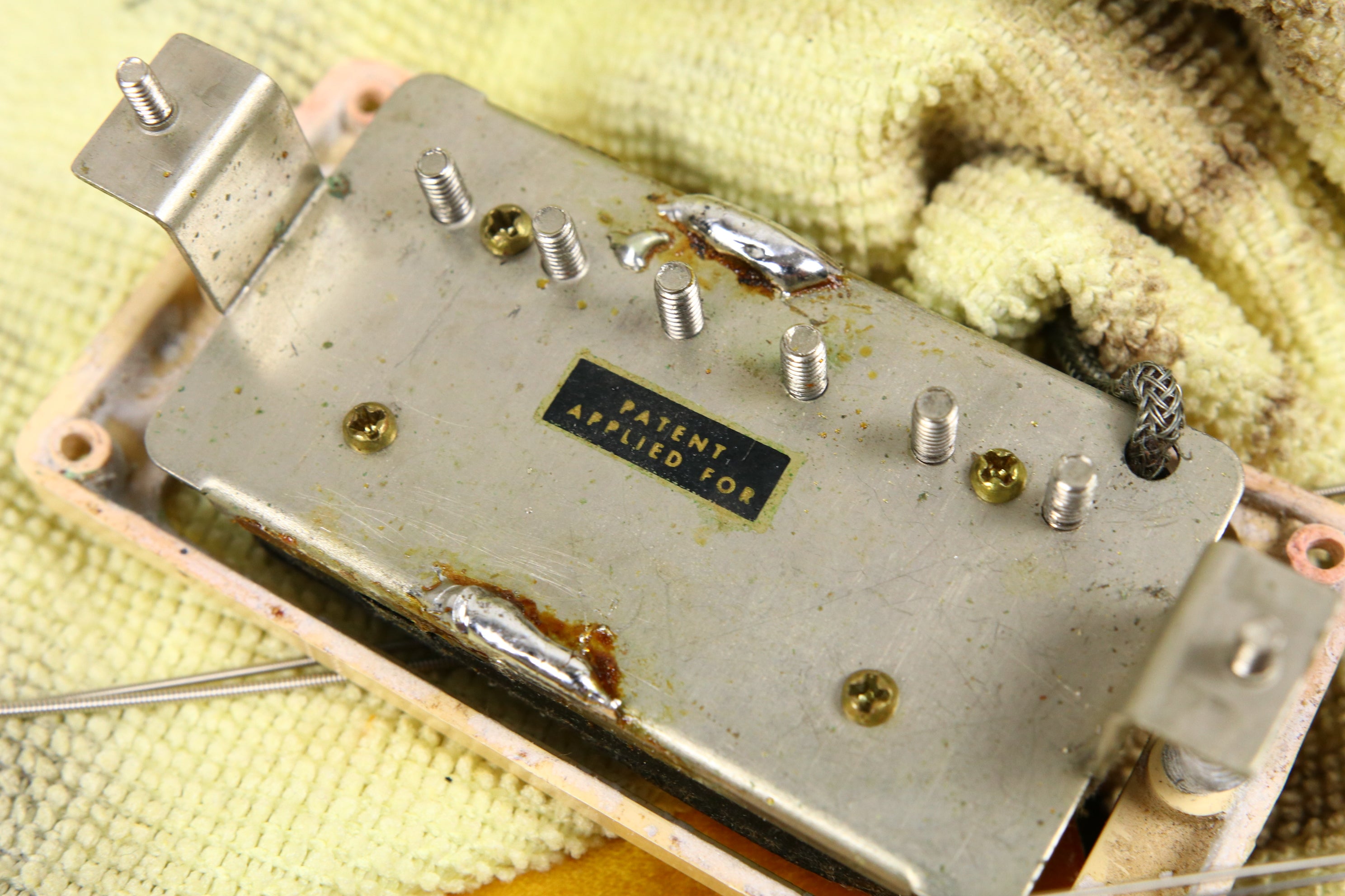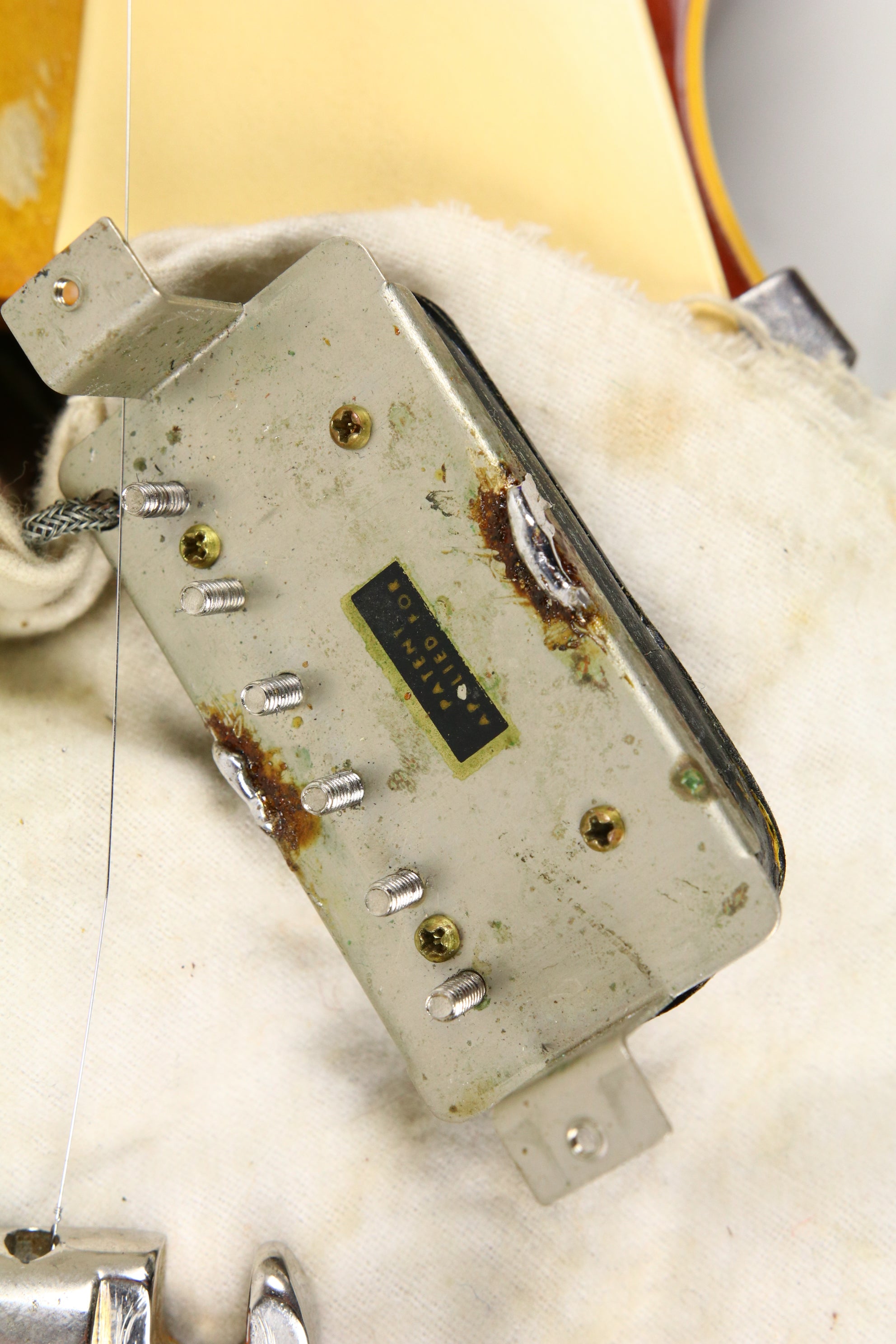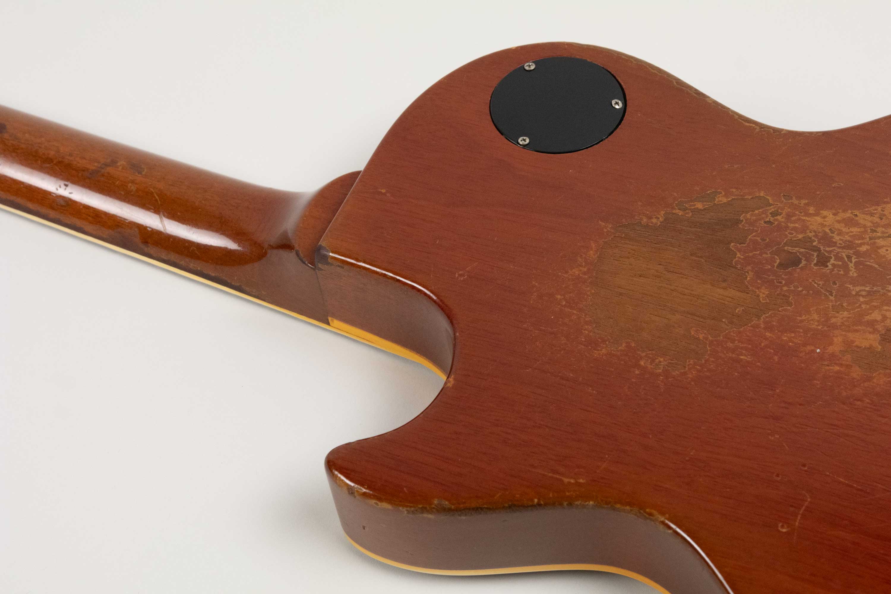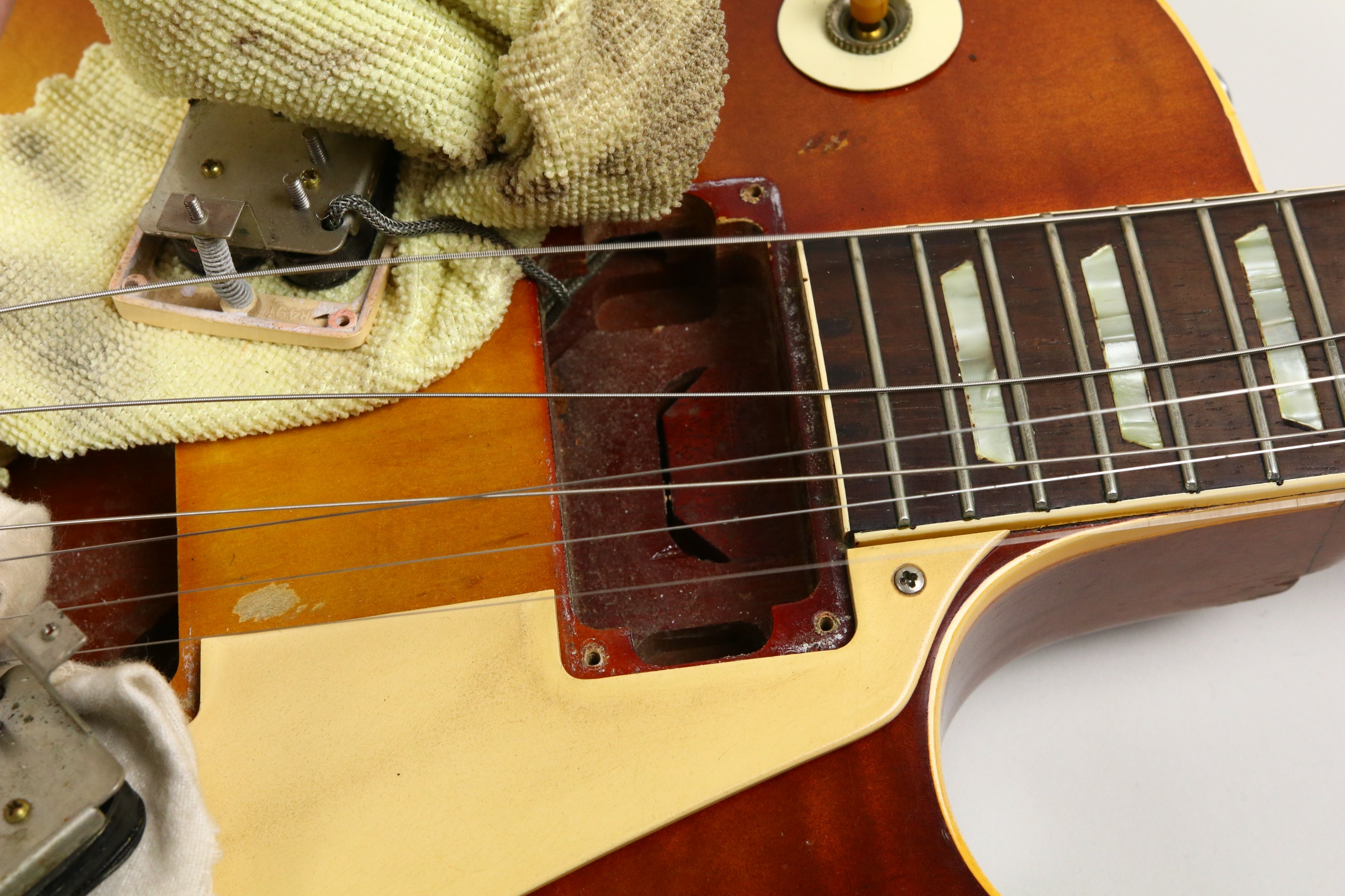 In terms of changes it has a repro tailpiece fitted, 2 x replaced saddles on the original ABR-1, 3 x neck pickup ring screws replaced, 1 x bridge pickup ring screw replaced, Grover tuners fitted and copper shielding foil added to inside of cavity cover. Interestingly, taped to the underside of the cavity cover is Peter Green's signature which appears to be authentic, likely placed their by a fan prior to the current owner.