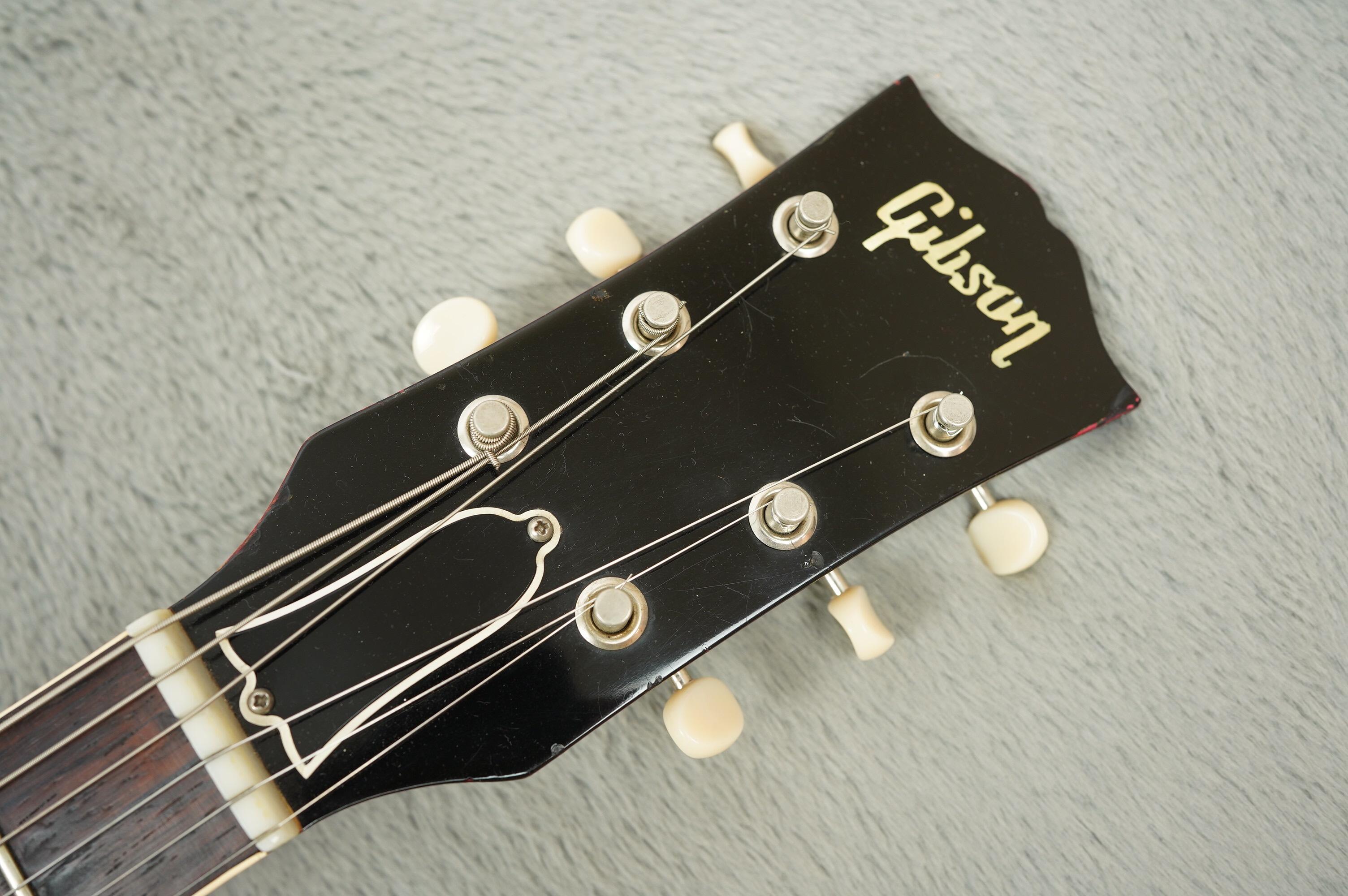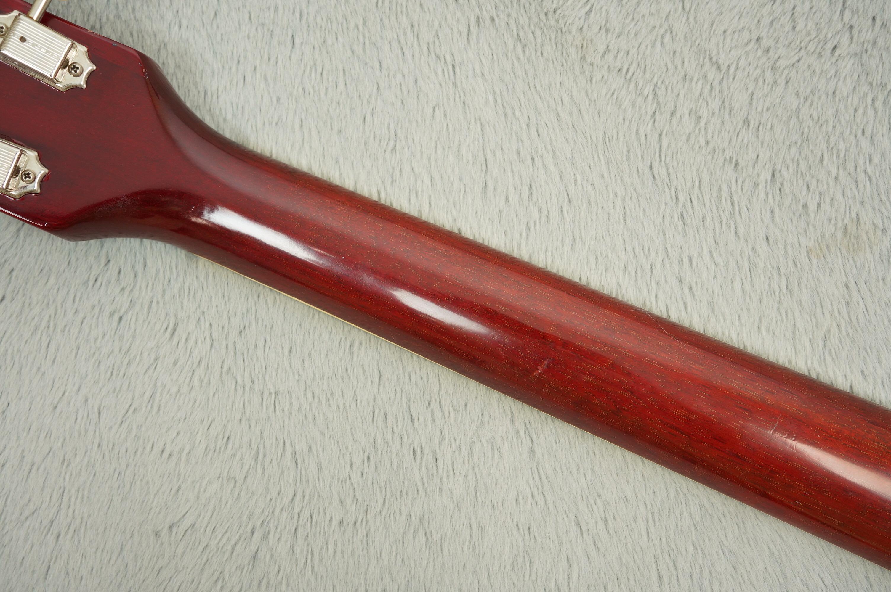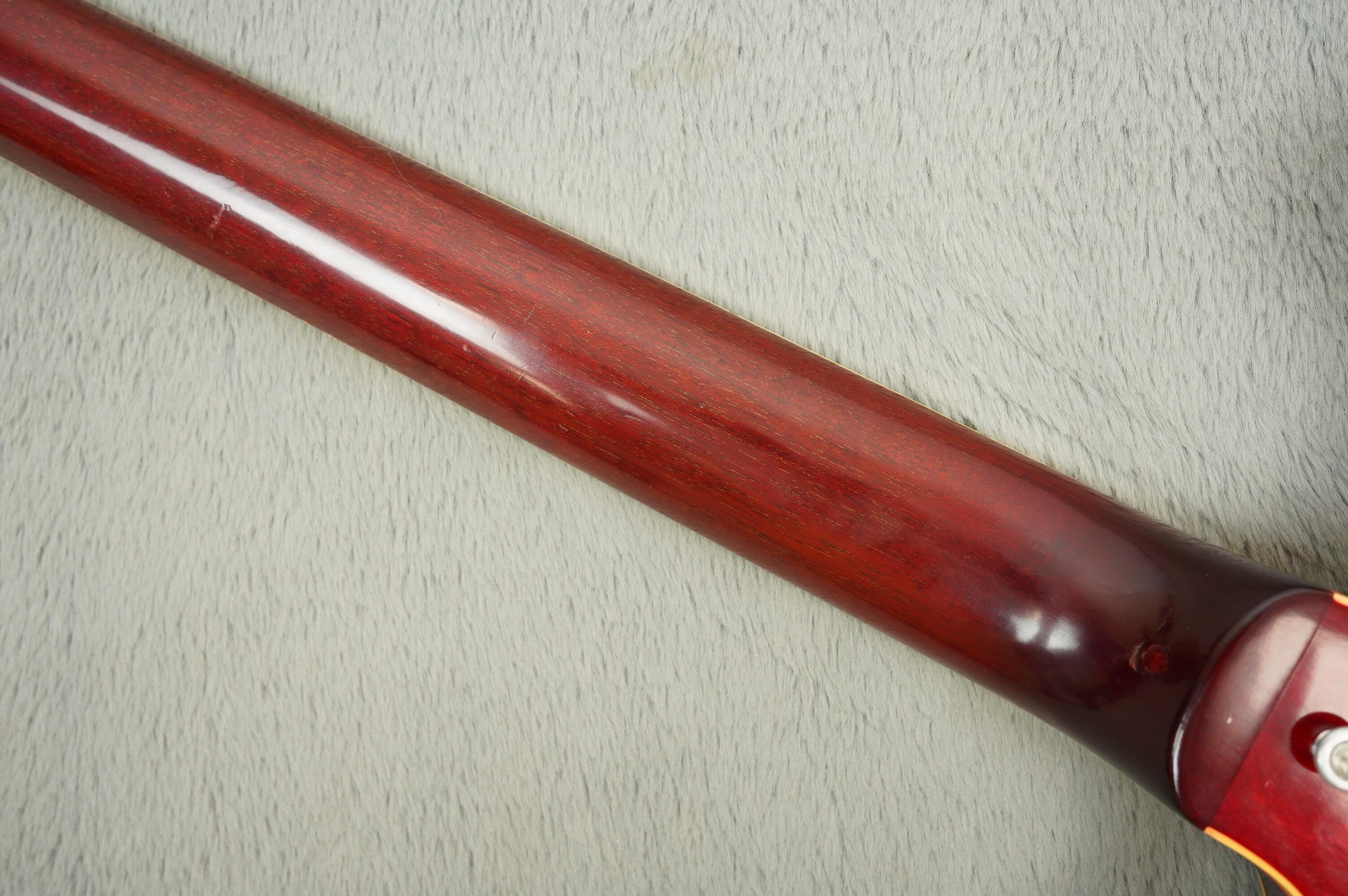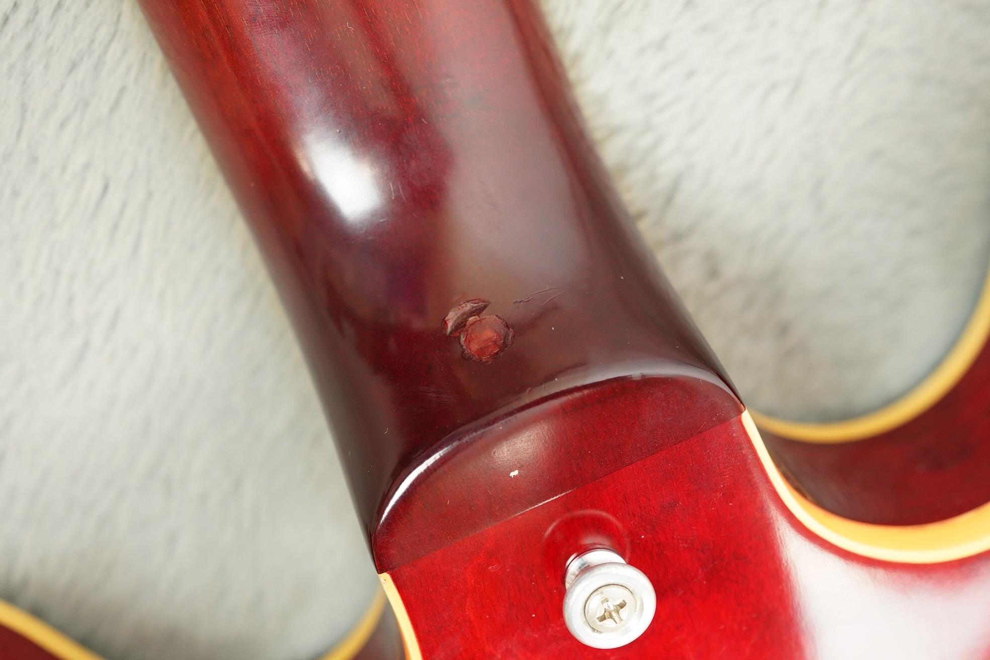 The finish is vibrant and beautifully preserved, and overall it's a superb looking example! The original tuners are retained in the case while some like for like repro's have been brought in for stability with no extra holes drilled. There's a plugged strap button hold on the heel but the rest is nicely stock, including the Nickel trapeze tailpiece, reflector knobs, and electrics.