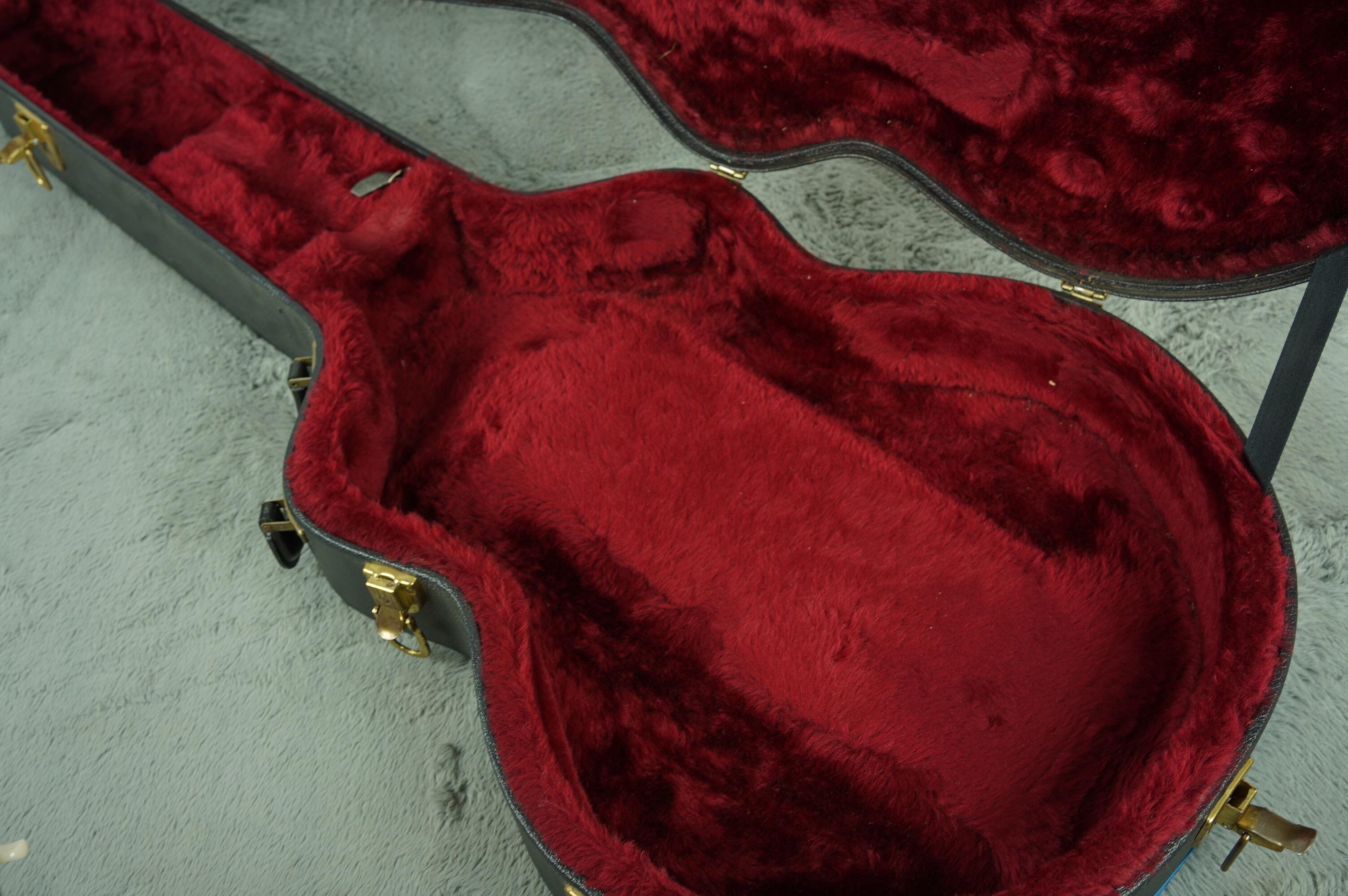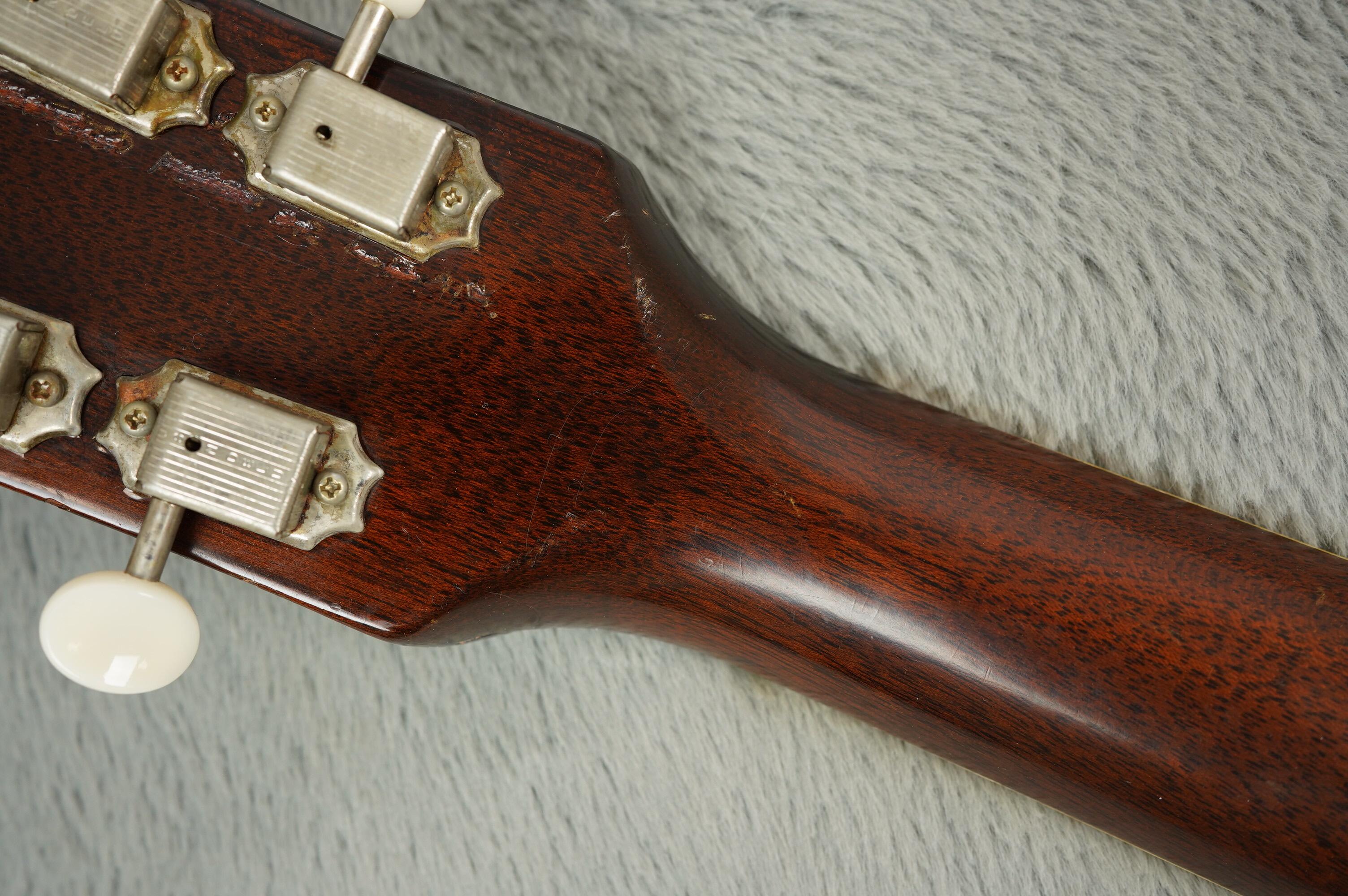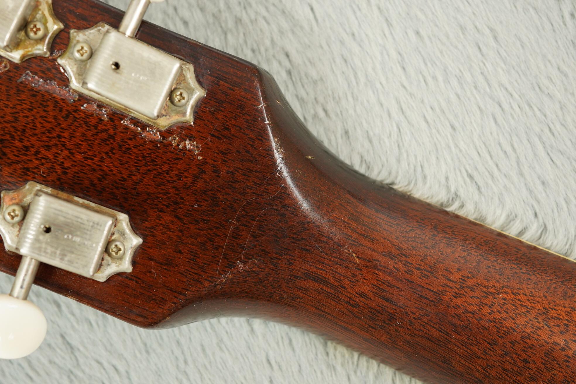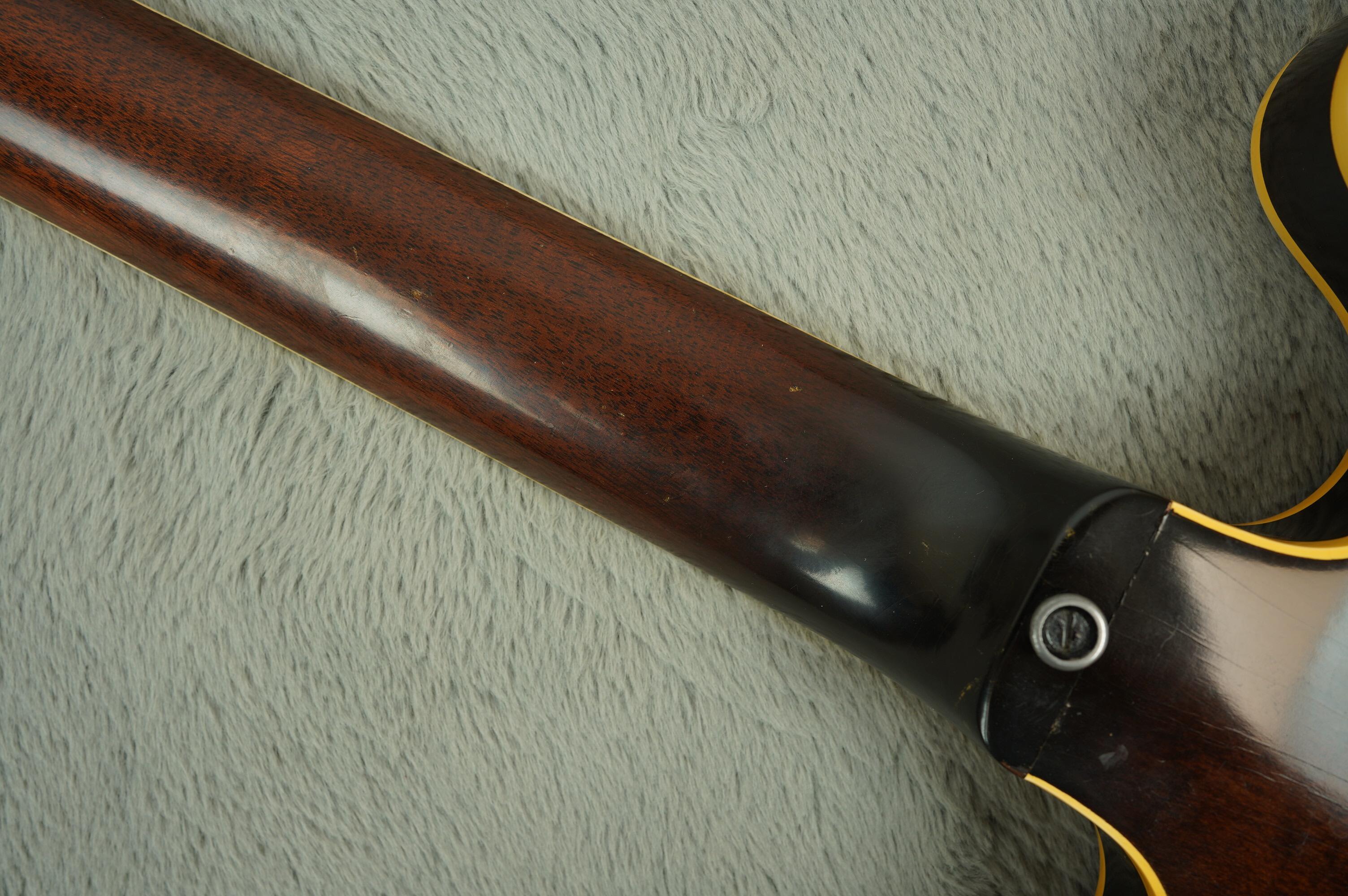This one has had a couple of hardware changes - the bridge is a later Chrome/wired repro with brass saddles, the raised diamond tailpiece has been replaced with a different style trapeze, and the tuners are aged repros. The sunburst finish has aged nicely and shows some very fine delicate lacquer checking. The binding has yellowed as expected and the headstock has had some minor touchup around the edges and face.