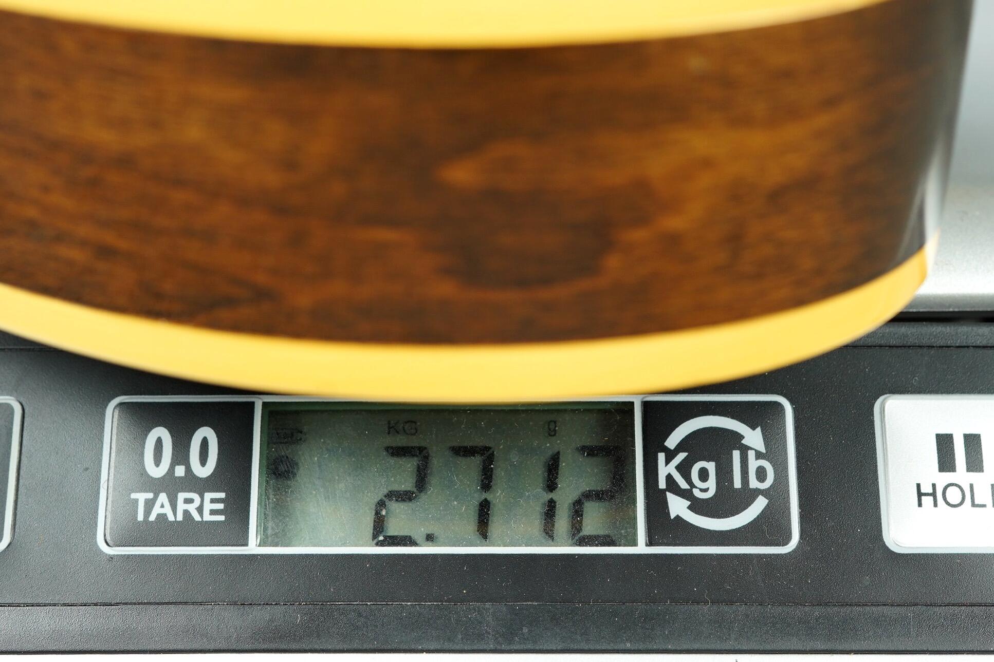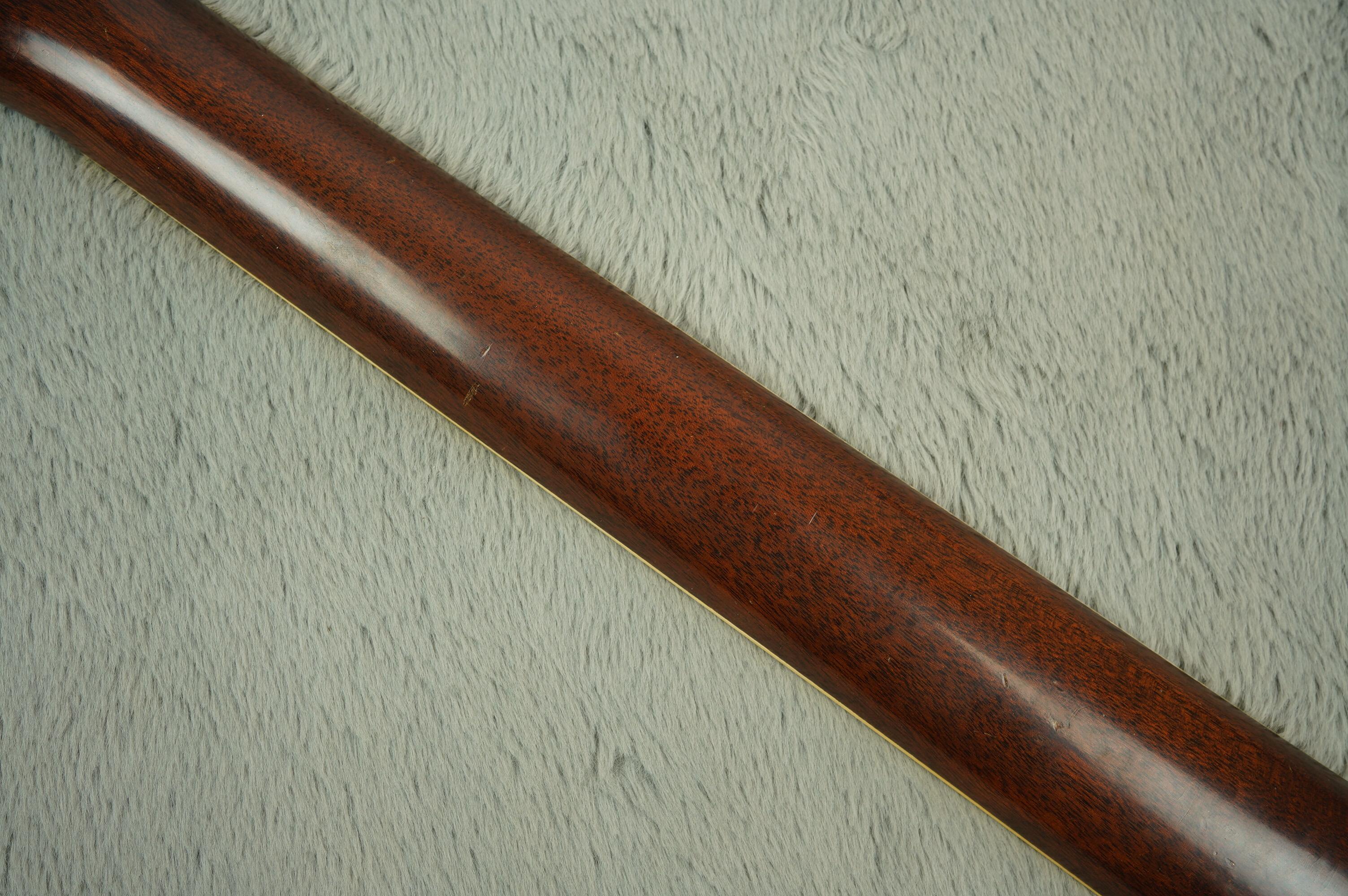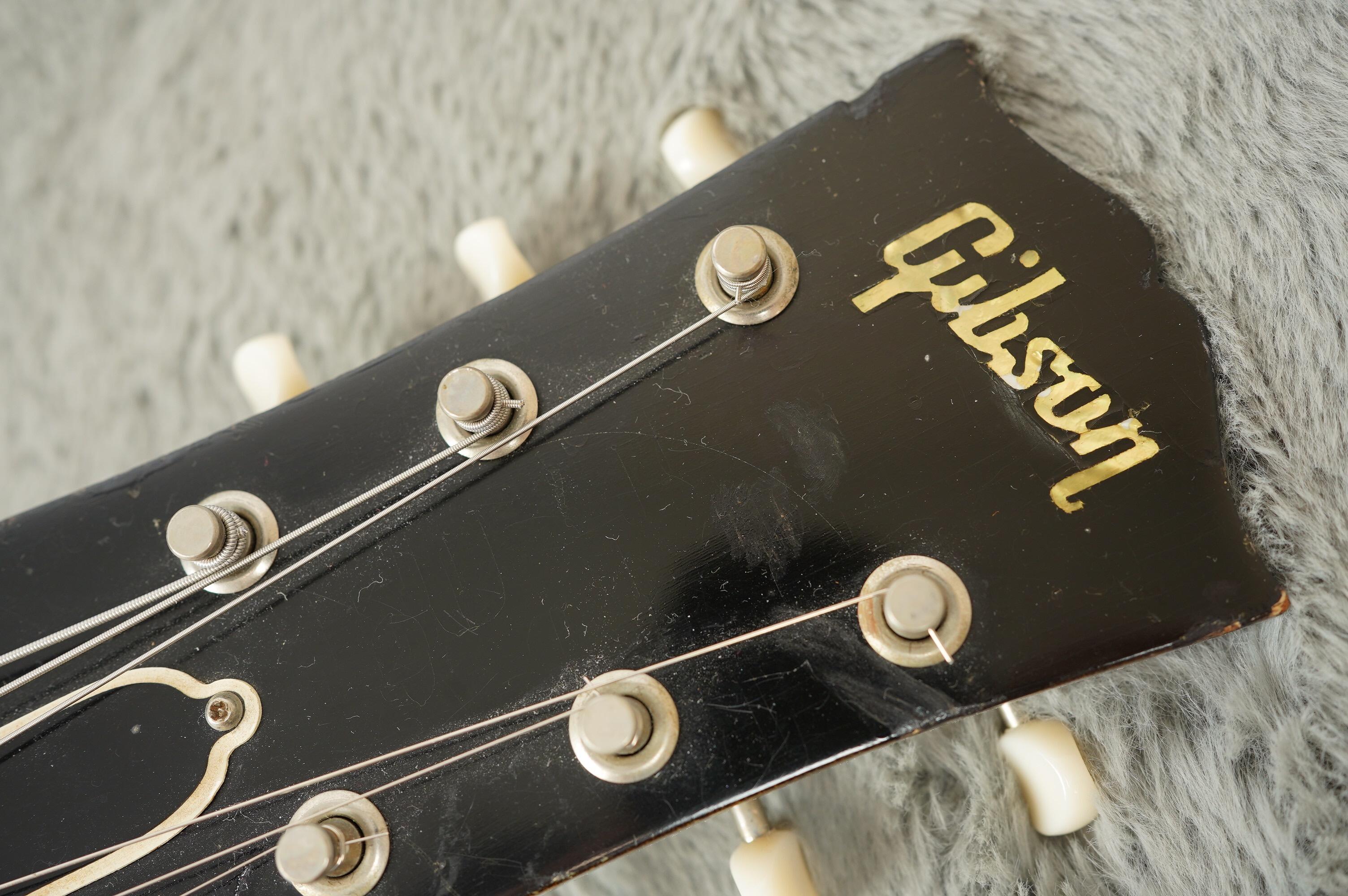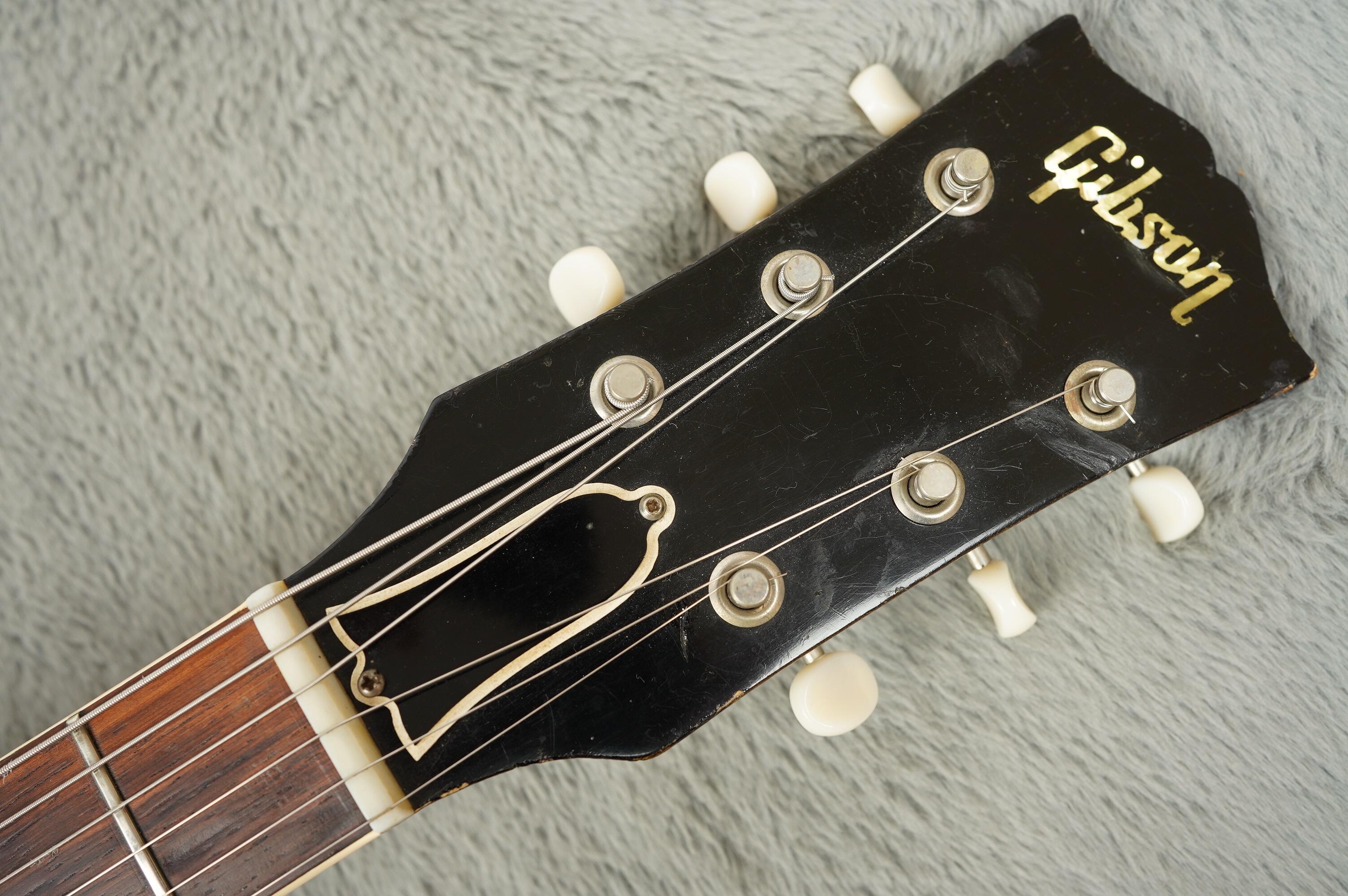 This one has had a couple of hardware changes - the bridge is a later Chrome/wired repro with brass saddles, the raised diamond tailpiece has been replaced with a different style trapeze, and the tuners are aged repros. The sunburst finish has aged nicely and shows some very fine delicate lacquer checking. The binding has yellowed as expected and the headstock has had some minor touchup around the edges and face.