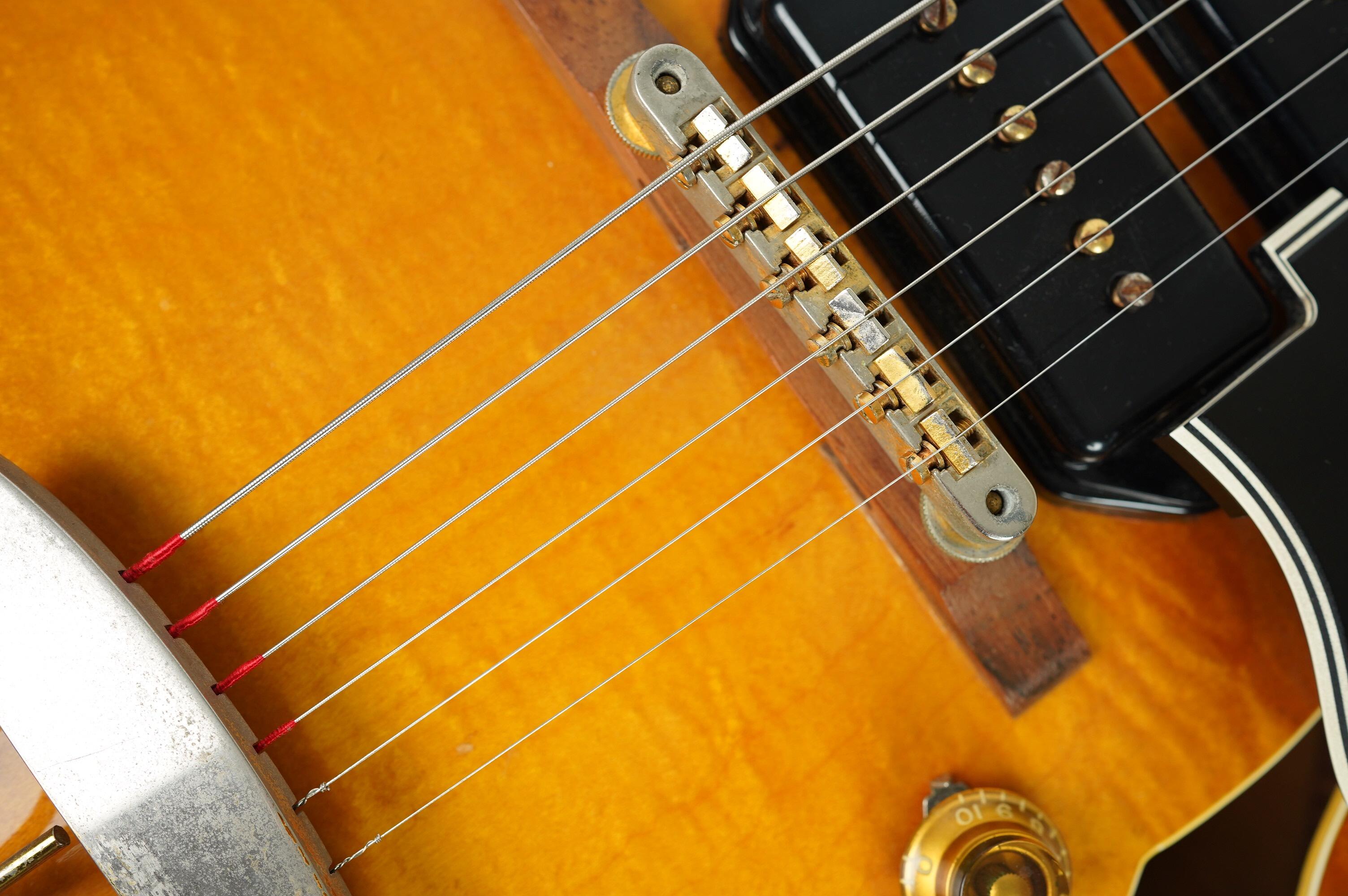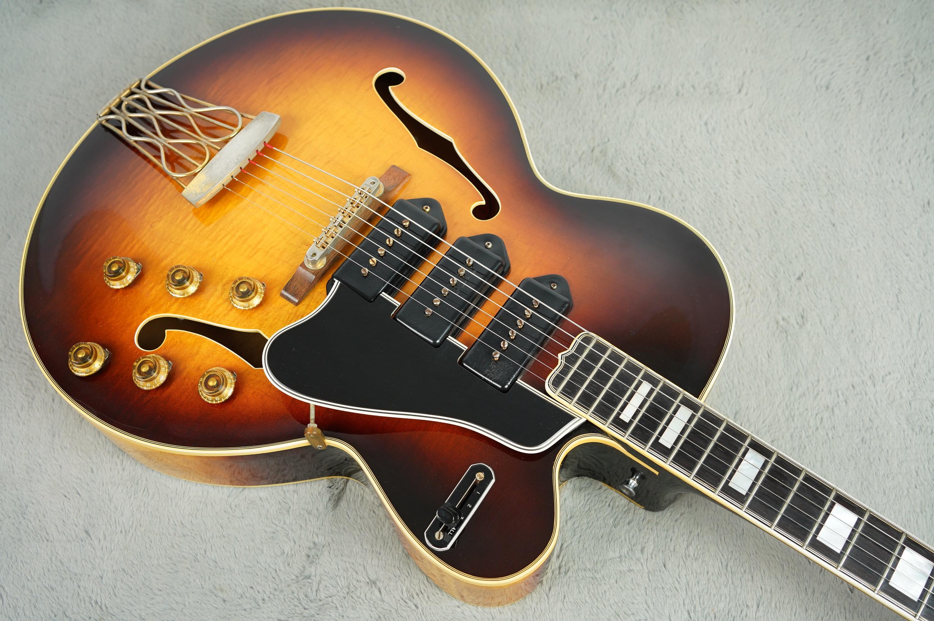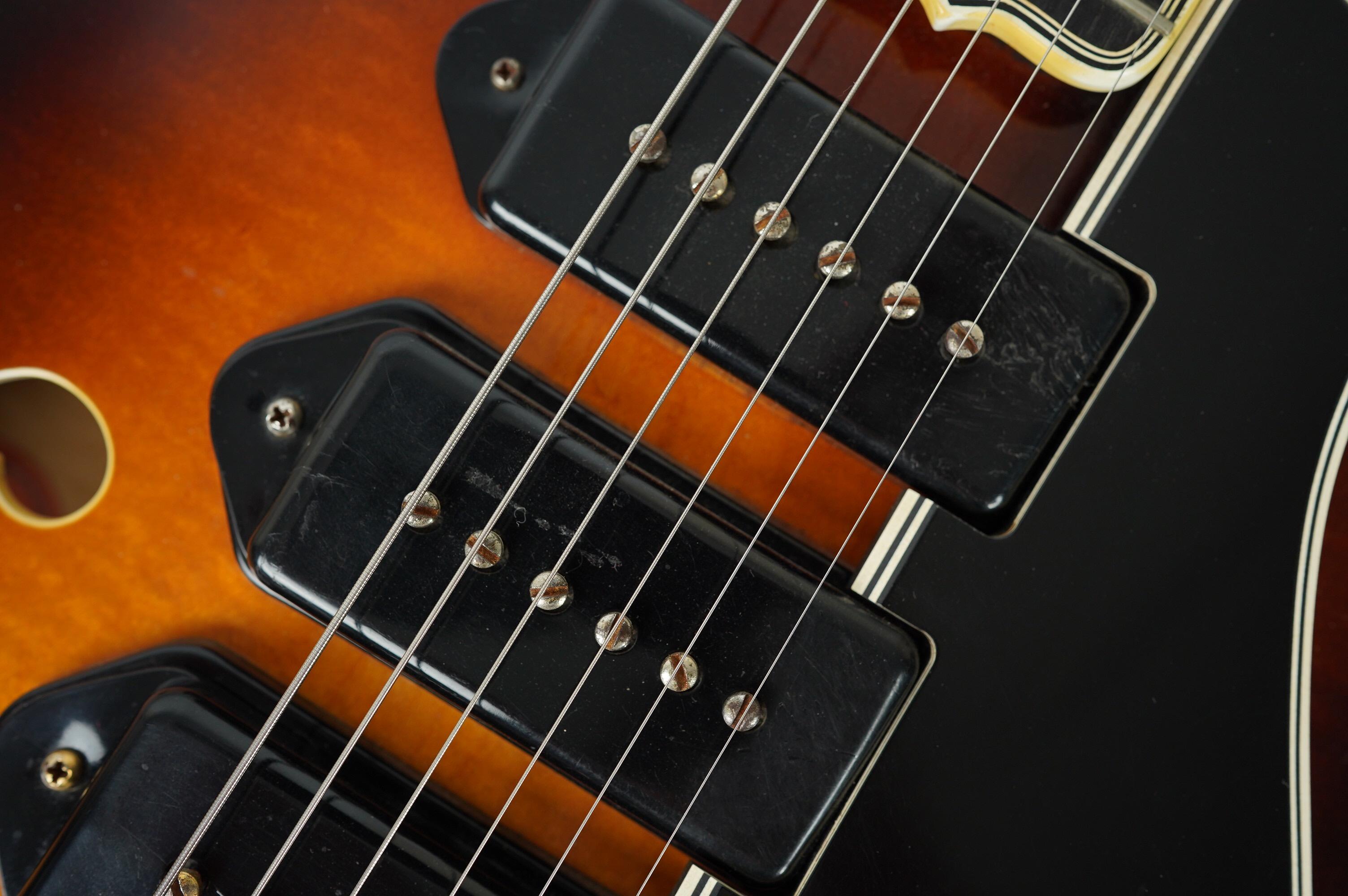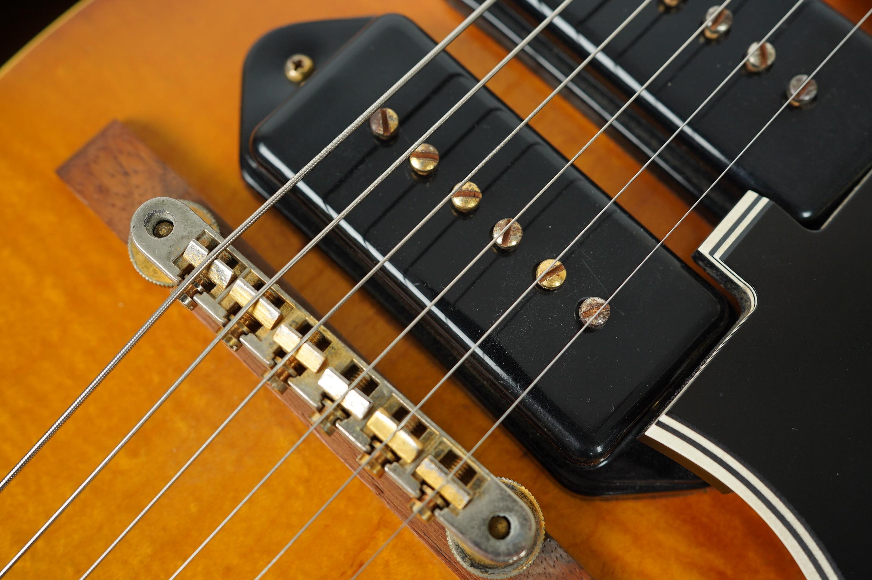 Beautiful, almost un-faded tobacco sunburst finish has some mild flame on it, especially on the back and neck. All three P-90’s are real strong and sound great.. Basically, with the combination of a volume and tone control for each pickup and with the 4 way Tele type switch in ‘ALL’ position you can get any tone you like and mix it to your heart's content on the 6 knobs that adorn this lovely ES-5.
