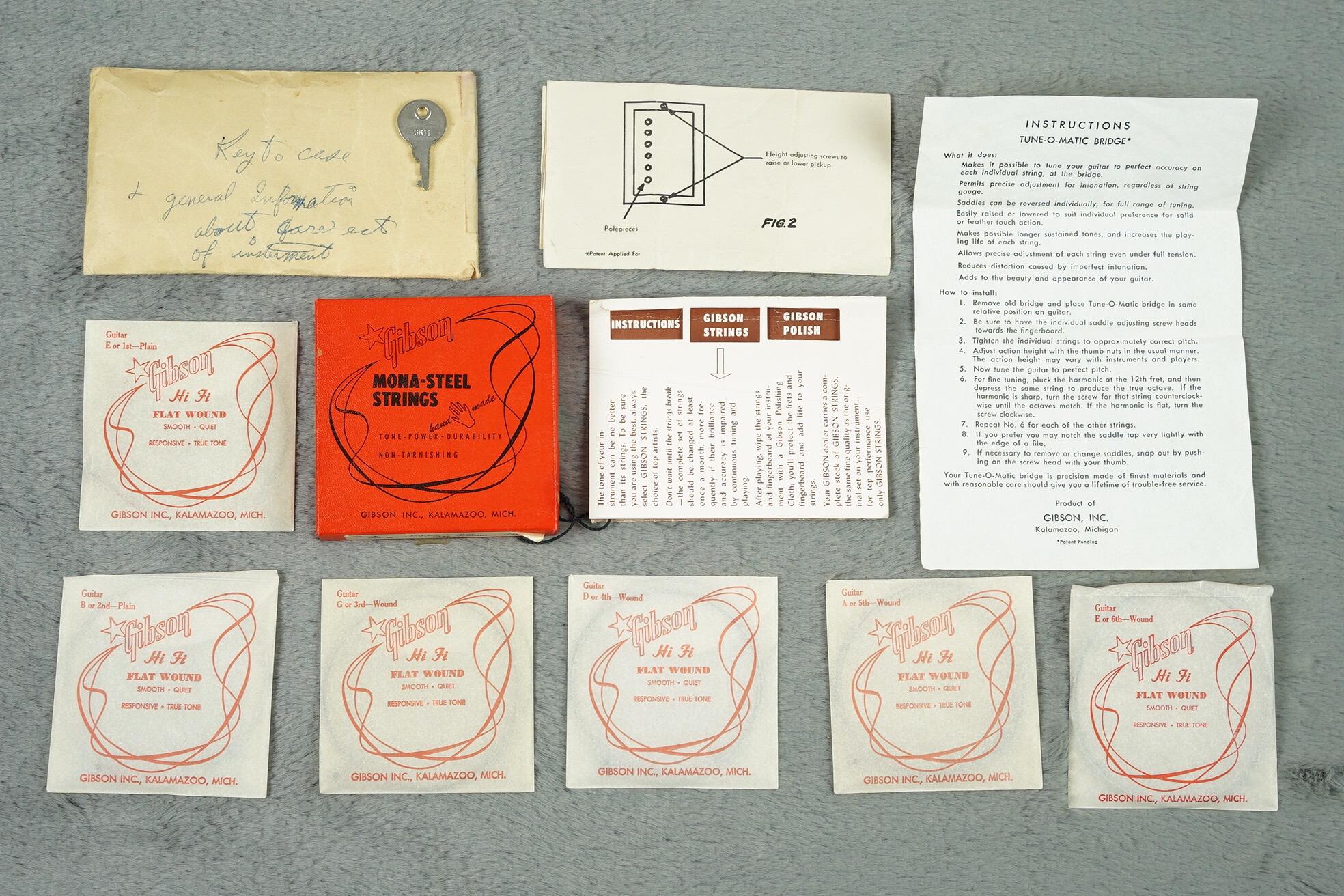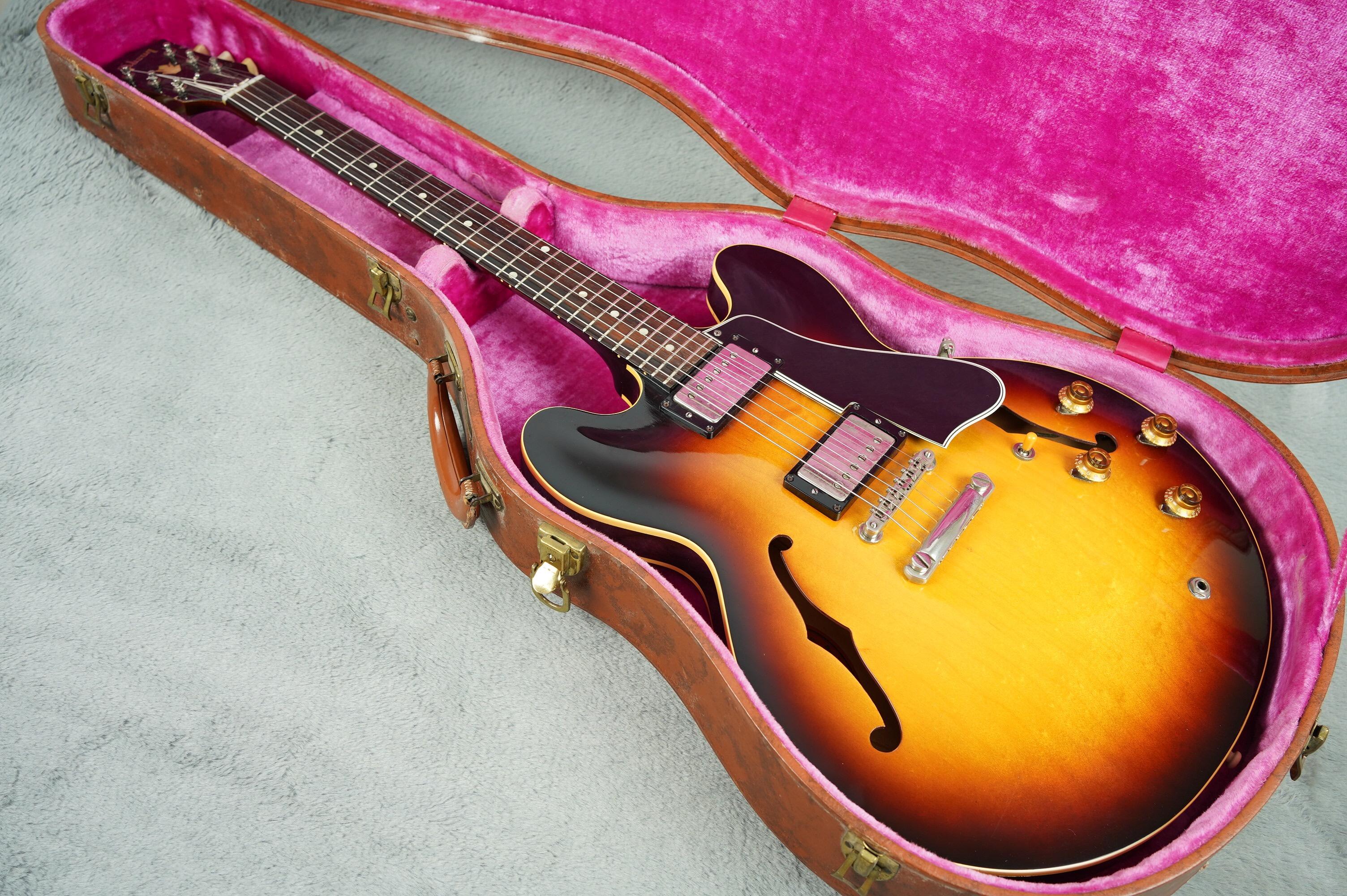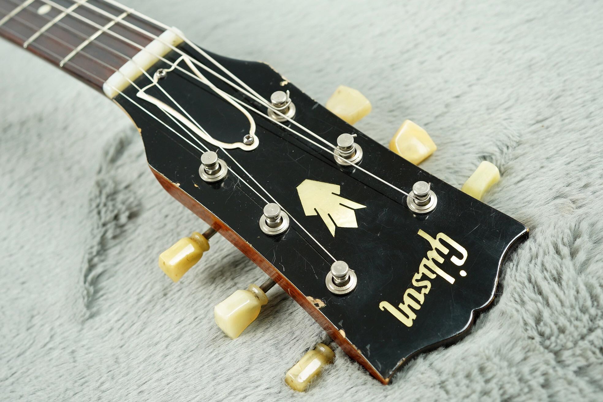 It is serial number A28098 with a FON number of T 4893 26 and has a brown Lifton 5 latch case with pink lining plus all the lovely case candy you see pictured. Both (double black) PAF pickups have never been opened and all solder we can see on the pots etc is totally undisturbed. It has a very good neck angle with a full height ABR-1 bridge and a really nice action just as it is.