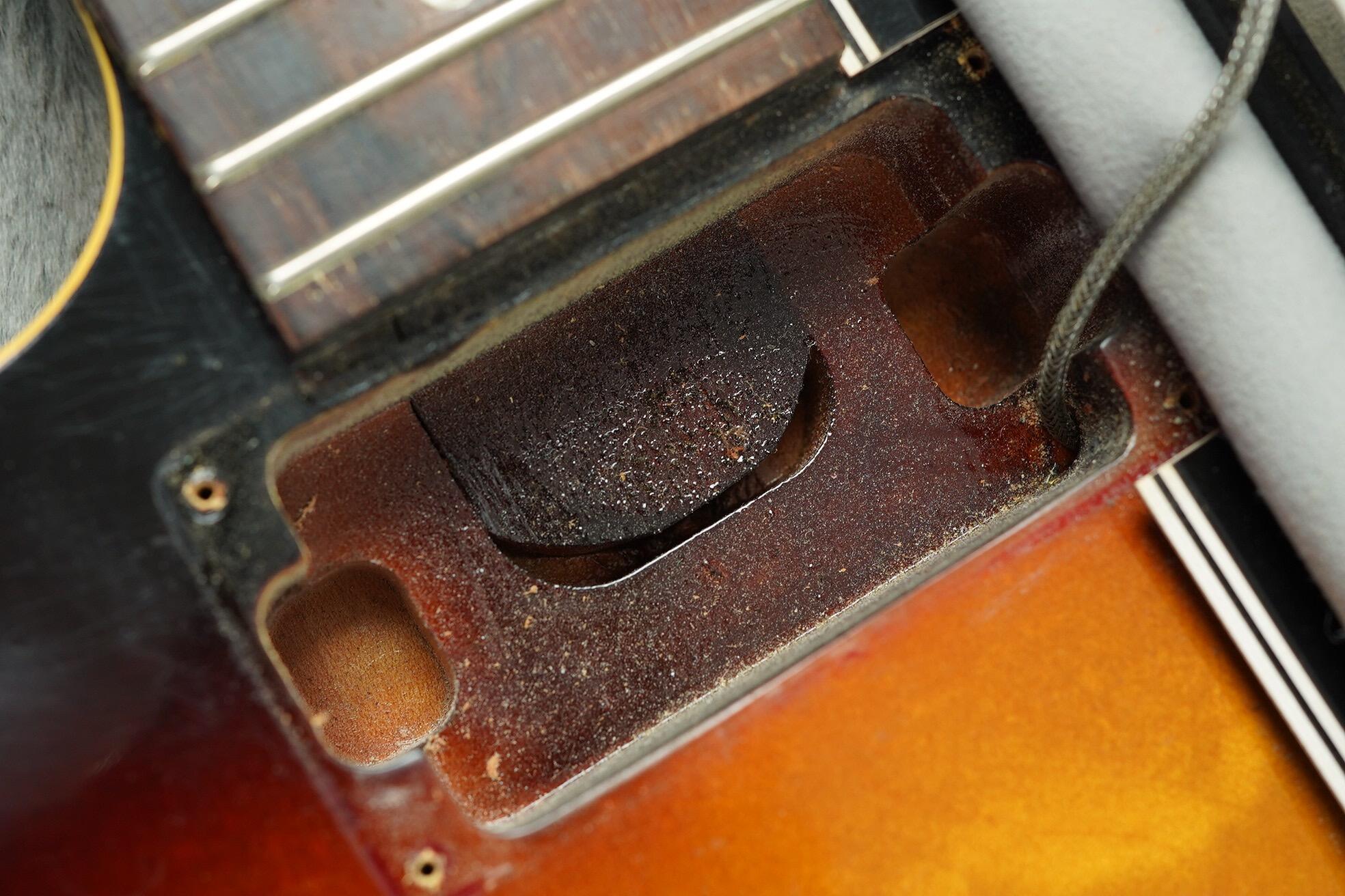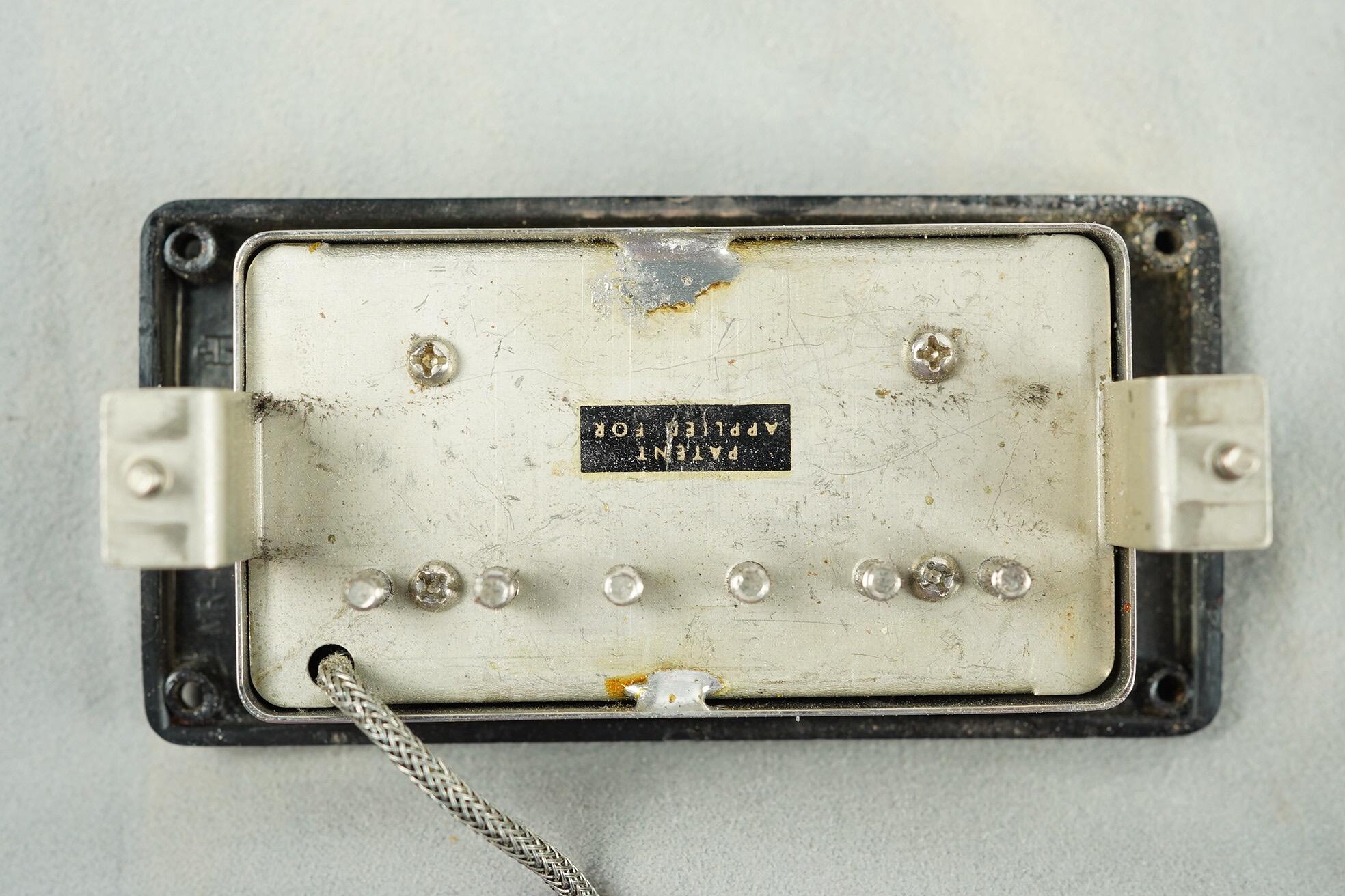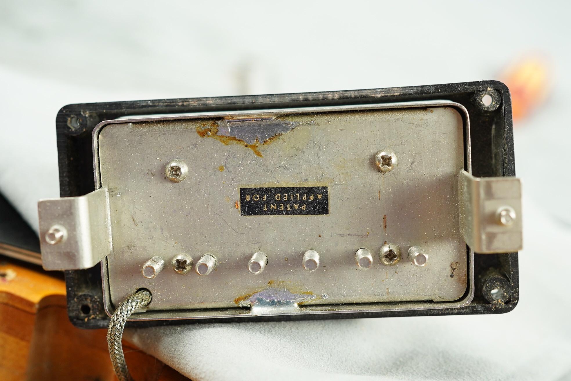 All hardware is correct, including the long guard, single line Kluson tuners with tips in perfect shape (they did not start to rot until a year later) and the short seam tailpiece. The PAF’s have been unopened and are both strong and balanced with readings at 7.6k and 7.8k. The pots are the correct style Centralab 500k with bumble bee caps and all plastic, rings, knobs switch tip are correct.