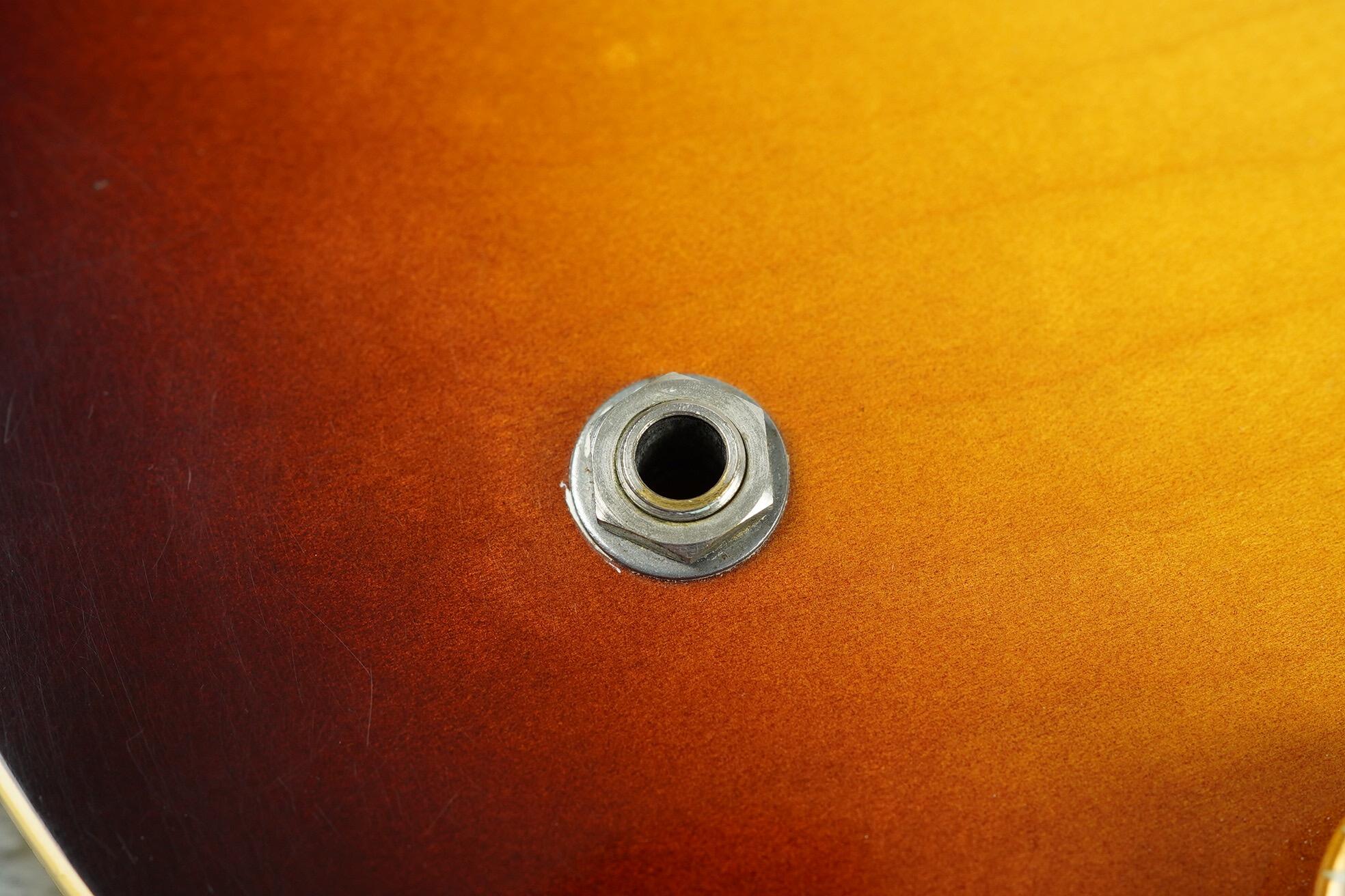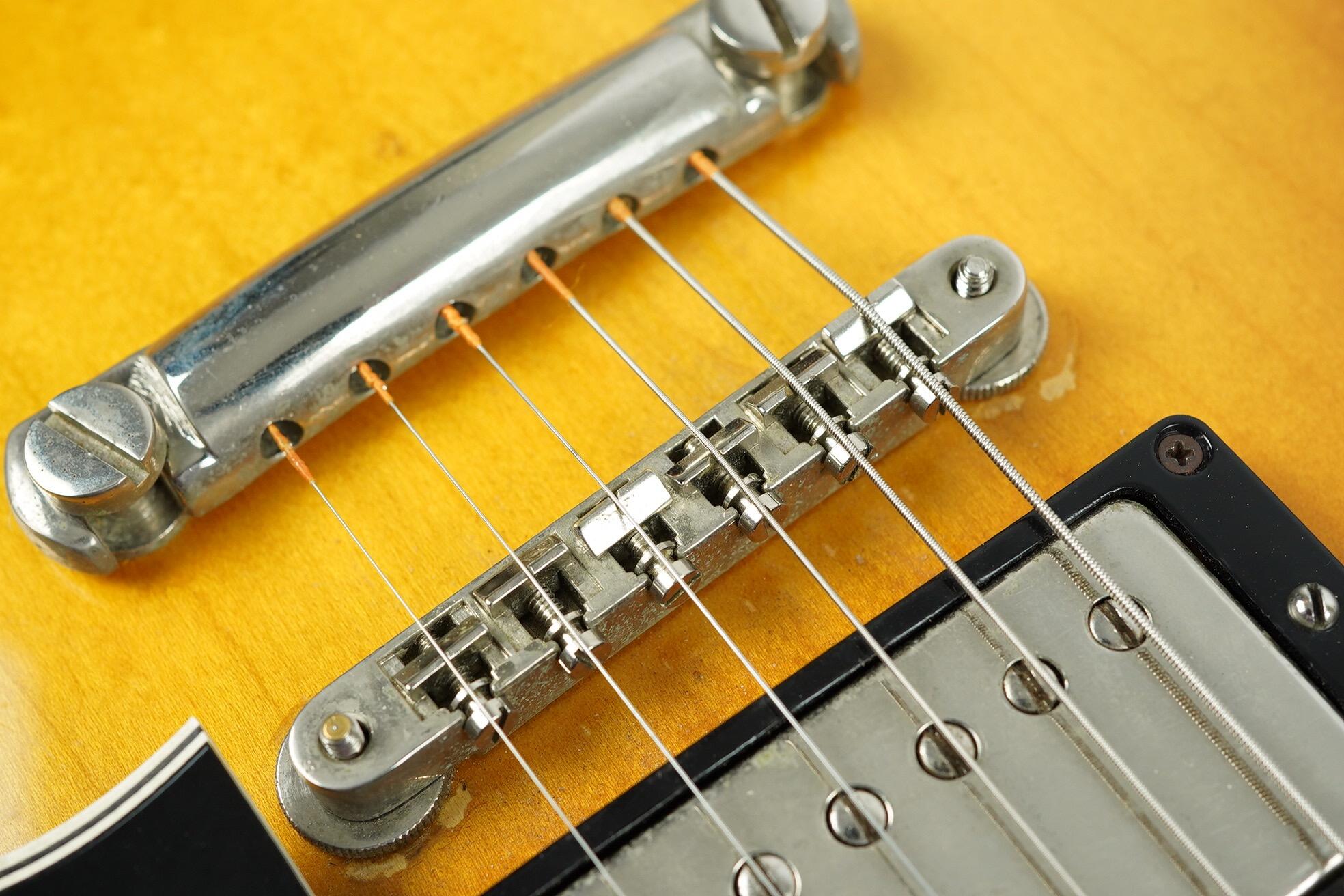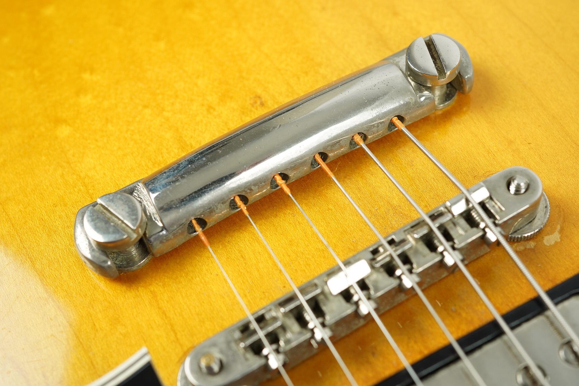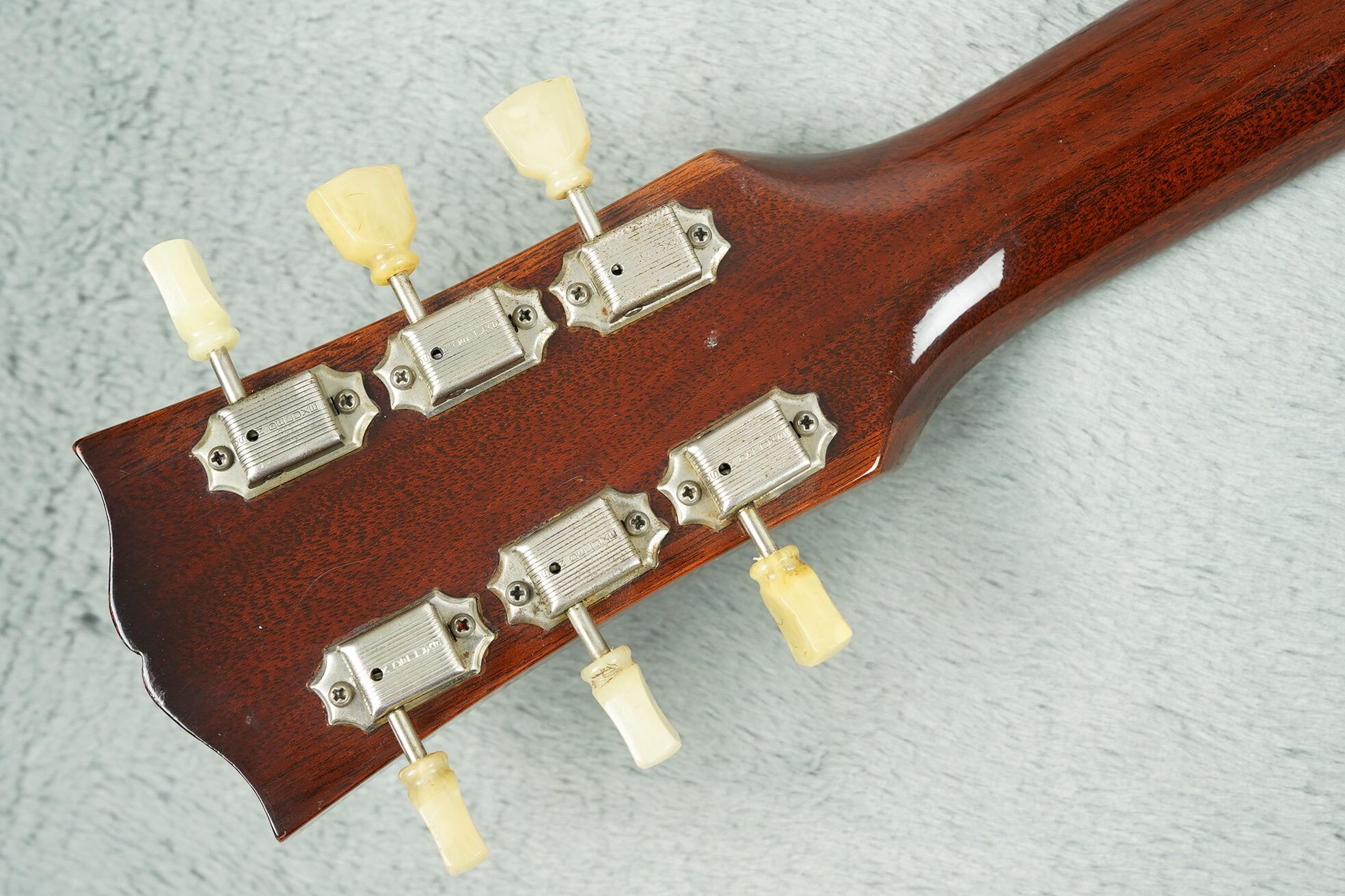 All hardware is correct, including the long guard, single line Kluson tuners with tips in perfect shape (they did not start to rot until a year later) and the short seam tailpiece. The PAF’s have been unopened and are both strong and balanced with readings at 7.6k and 7.8k. The pots are the correct style Centralab 500k with bumble bee caps and all plastic, rings, knobs switch tip are correct.