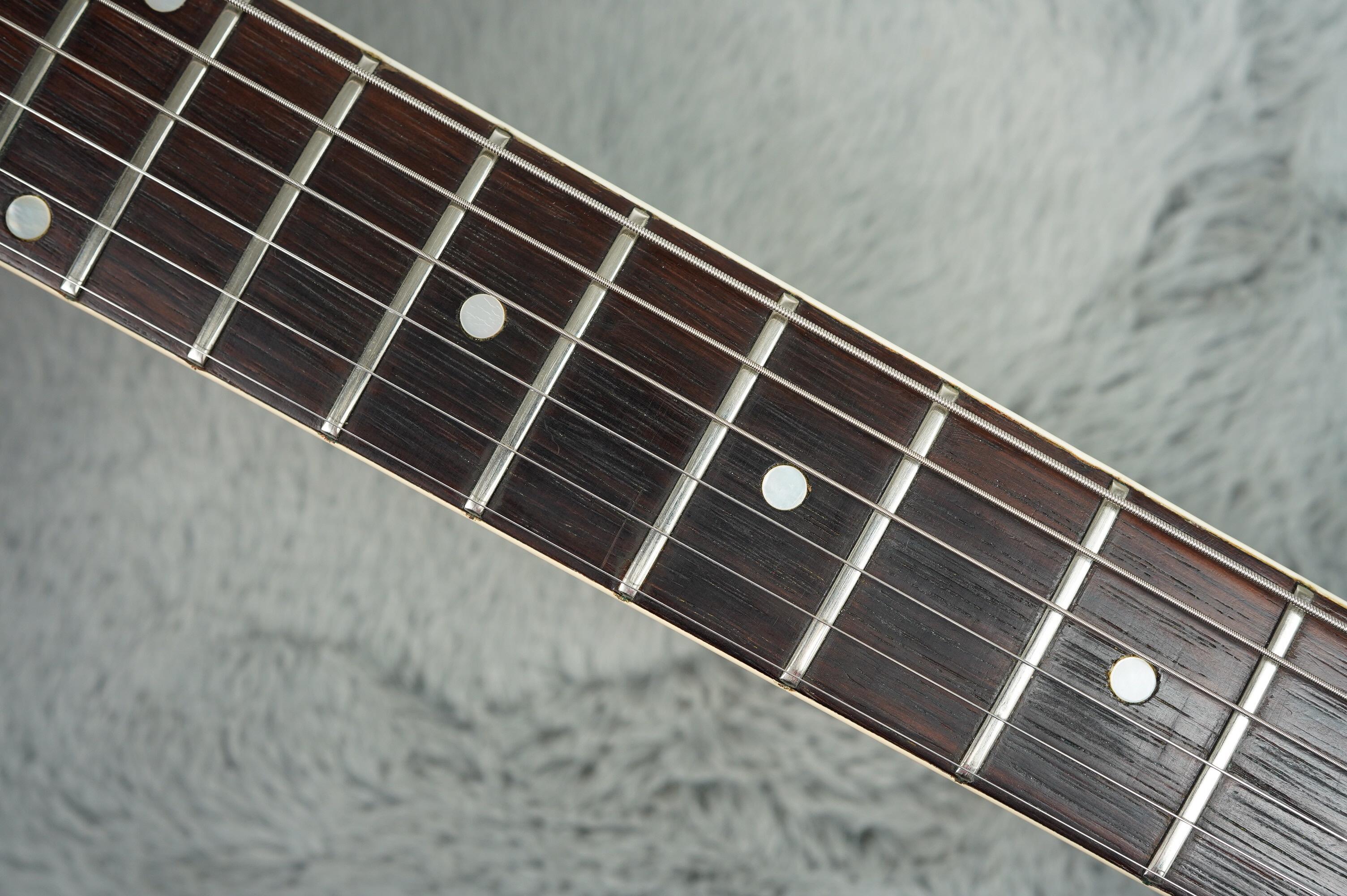 The fretboard is mark free and the frets have plenty of life left in them.The binding has also been painted which has obscured the dots though they are still present.