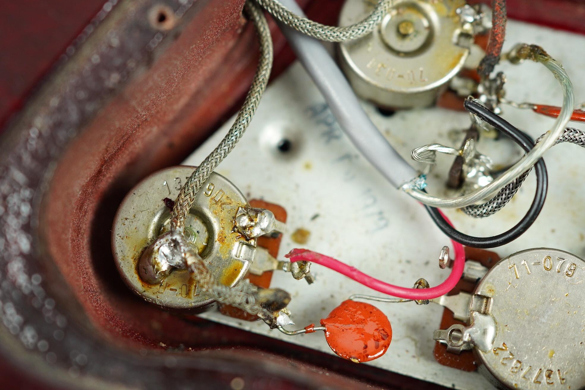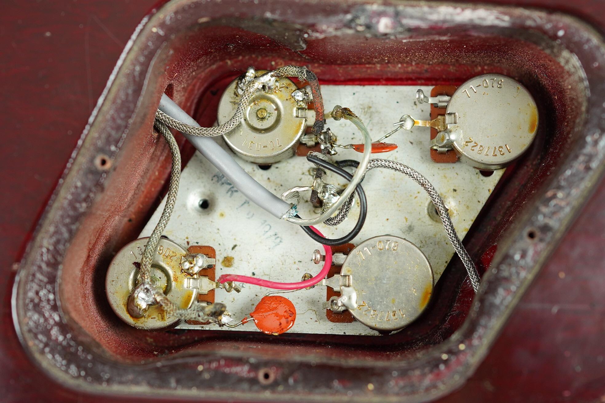 Electronically we have a pair of Tim Shaw Humbucking pickups married to some CTS pots, dated from 1978 and 79. All solder is untouched and cavity has date stamp of April 1979.
