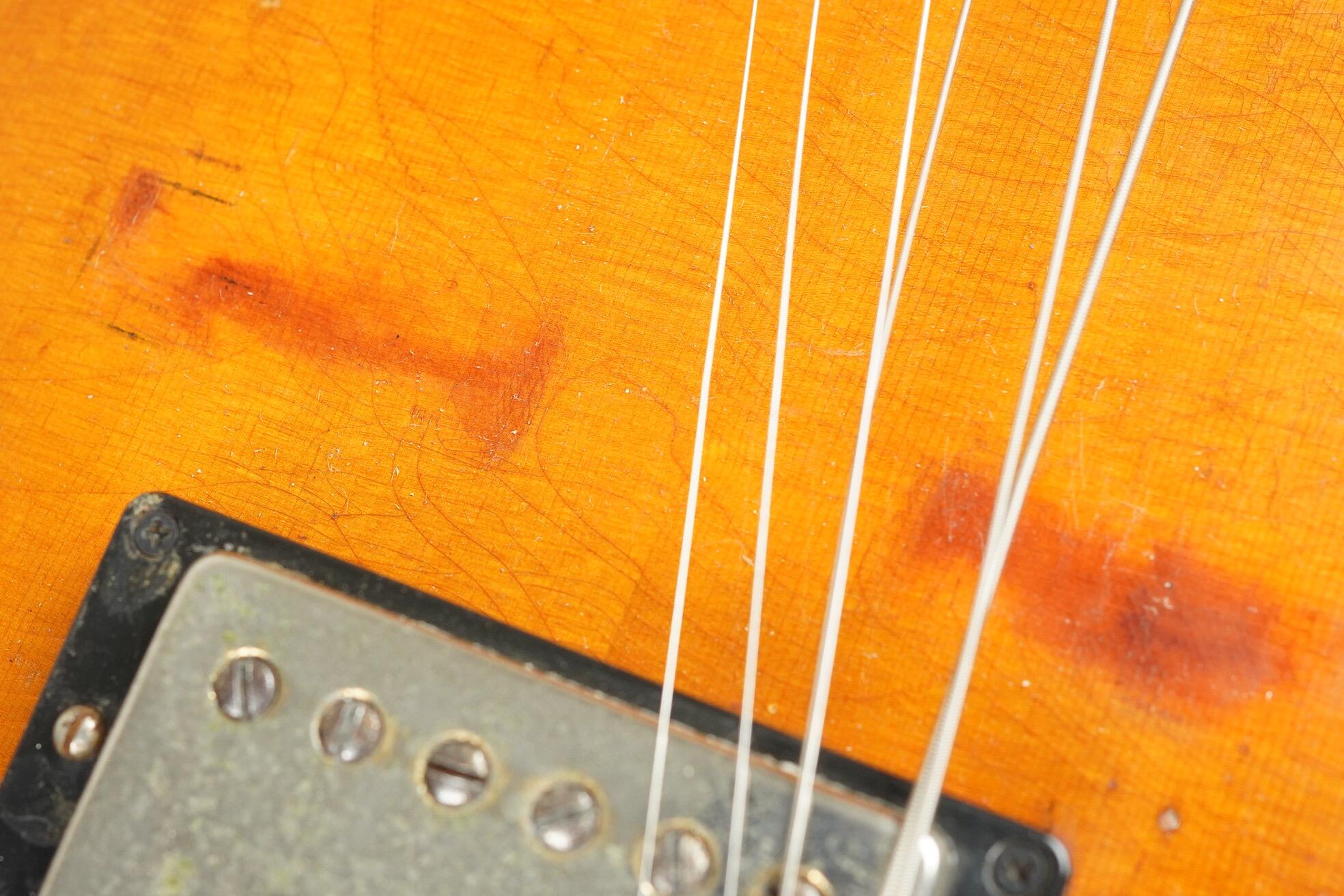Plastics and hardware are in good shape with the inevitable tarnishing. The correct tune-o-matic bridge is in the case. The guitar currently has a rosewood bridge fitted. The pickguard is a good reproduction.