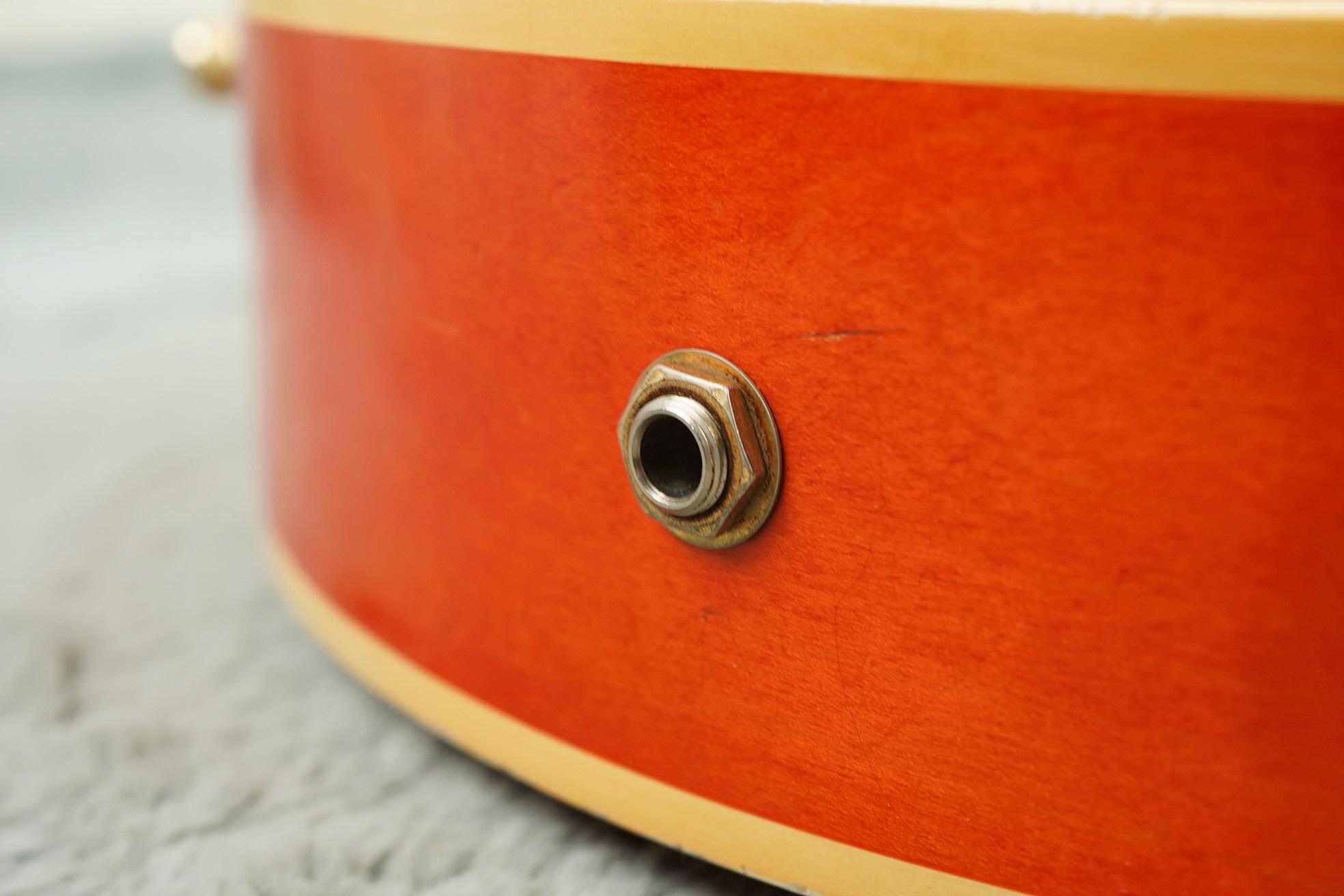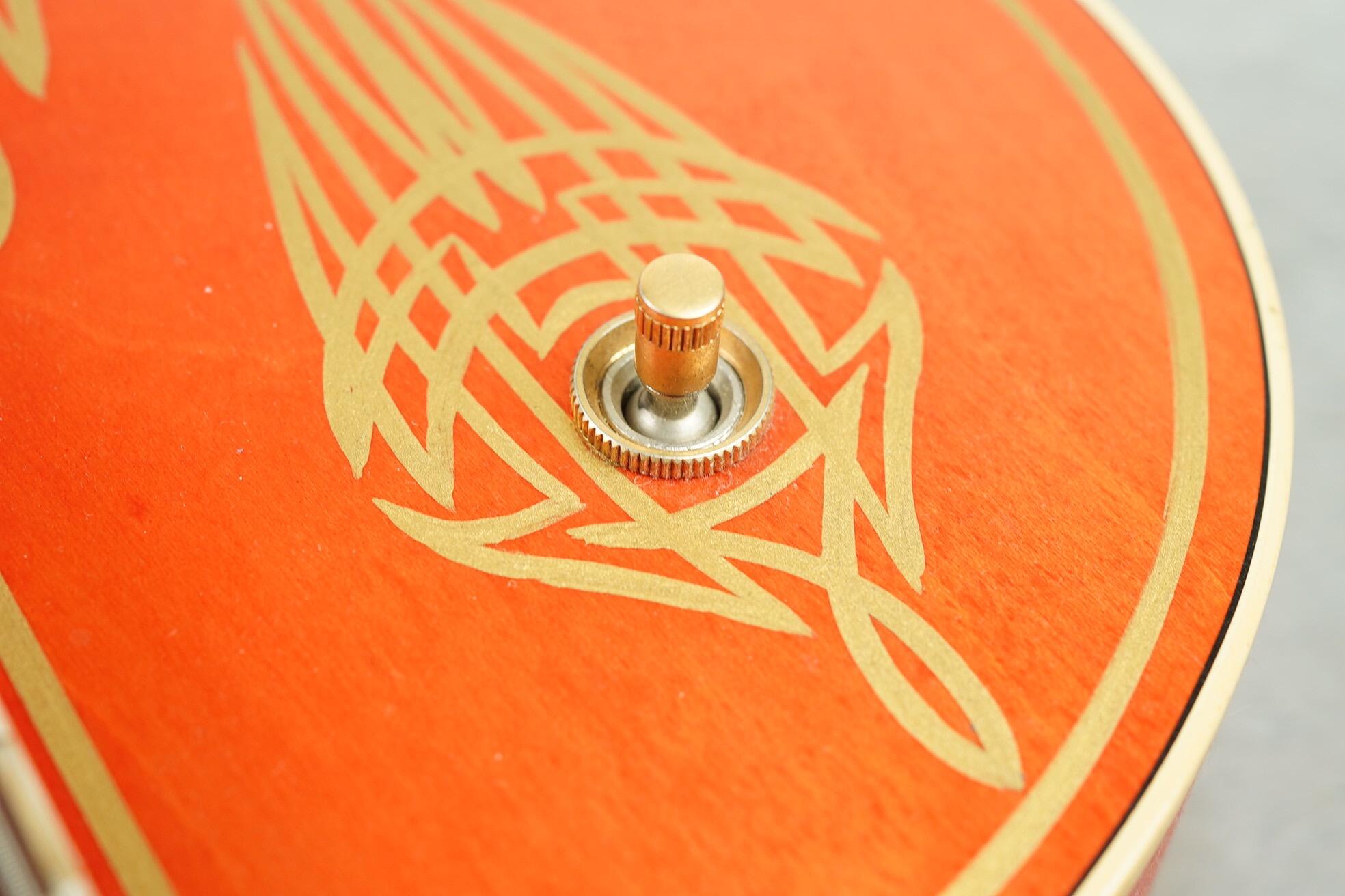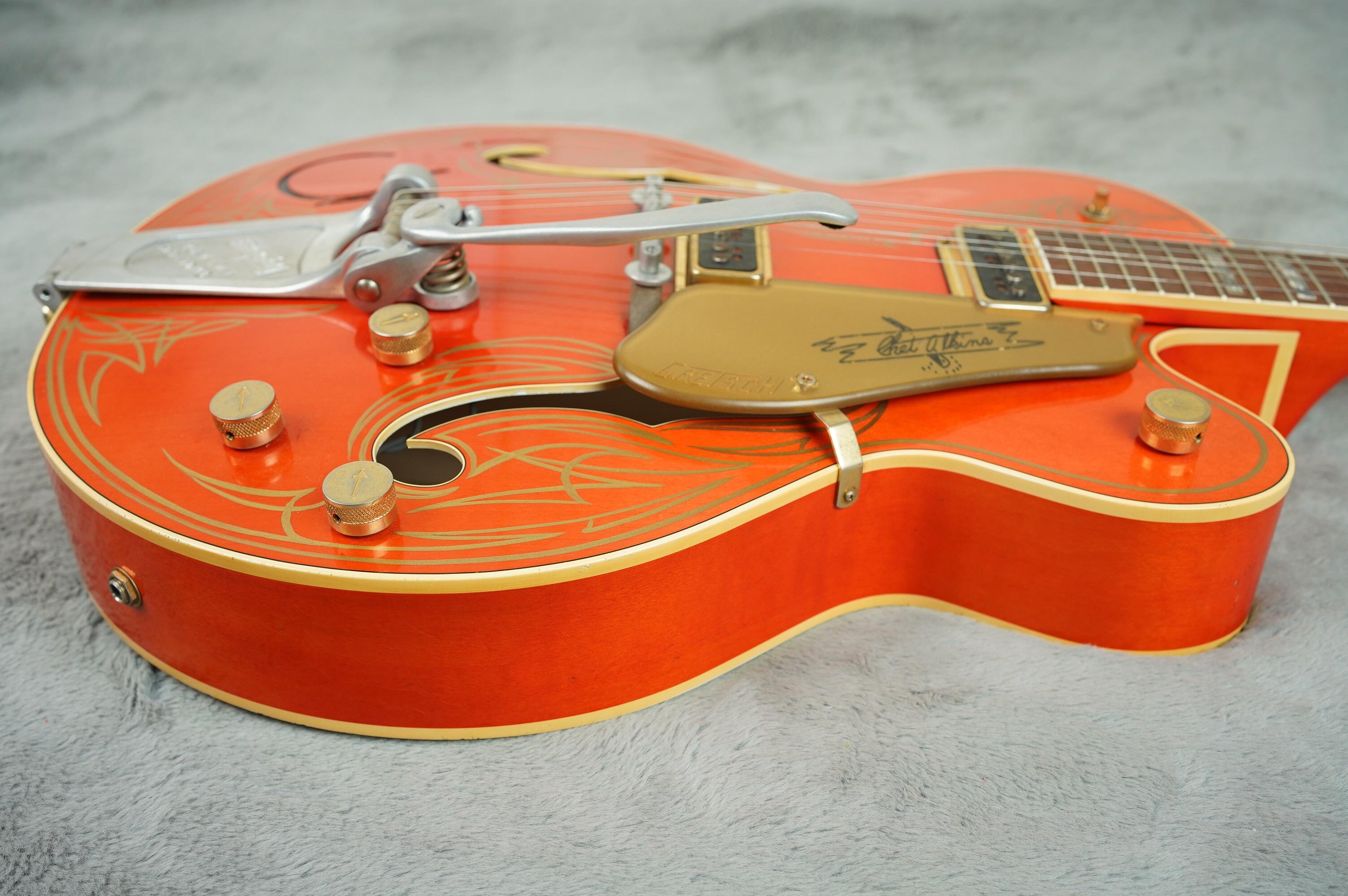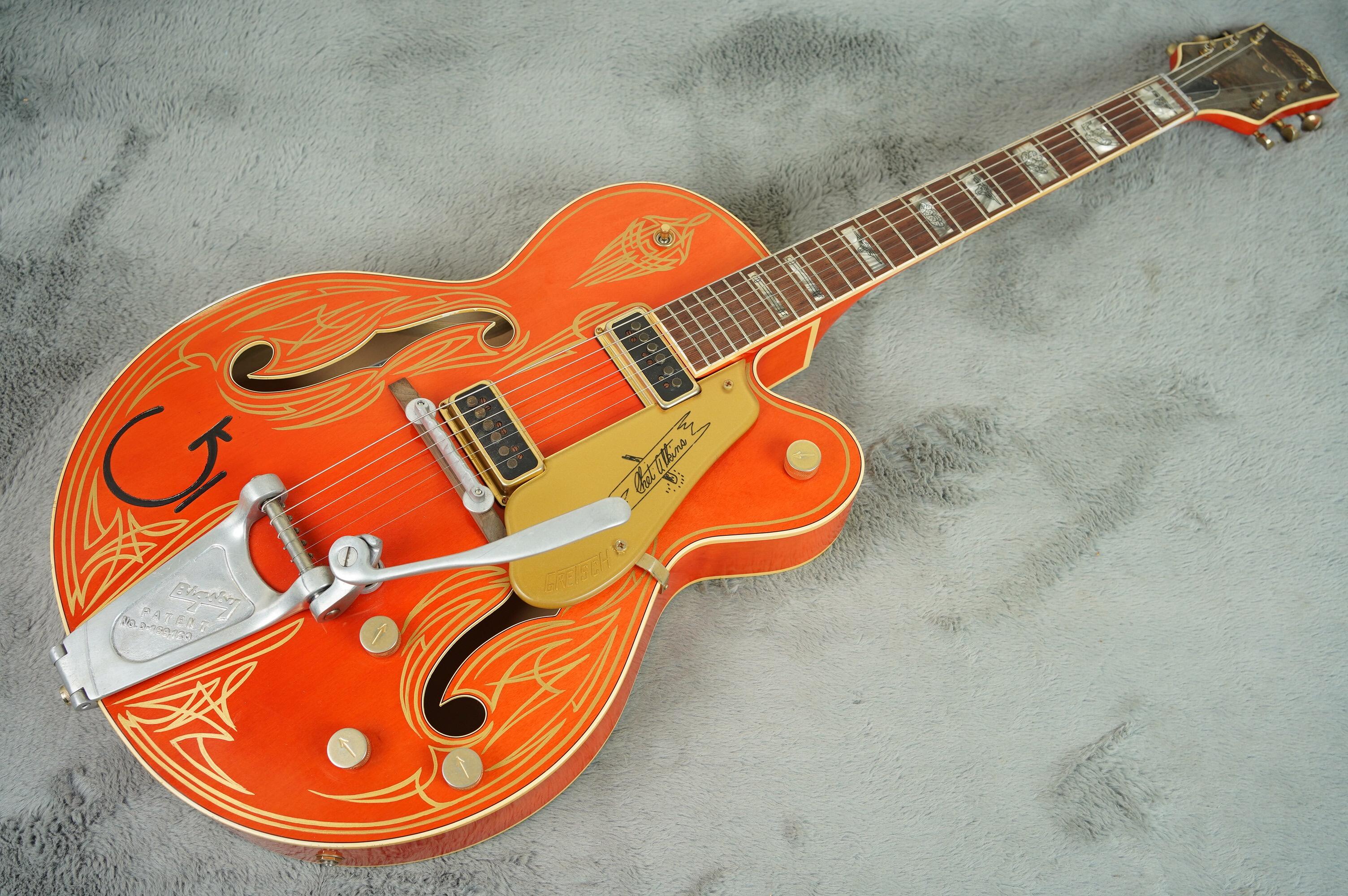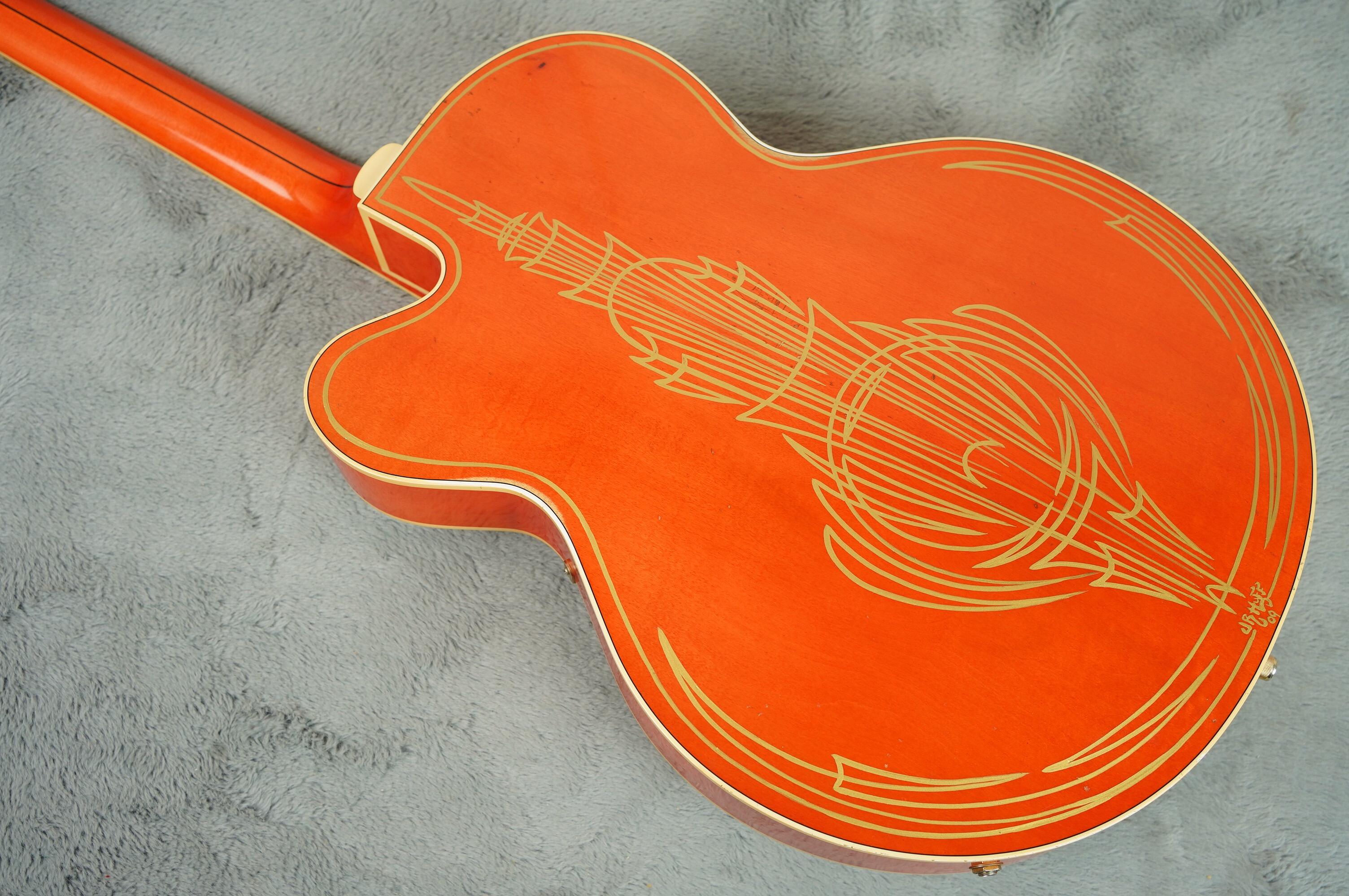 The hardware on this one is exceptional and this too has been lightly aged by Stephen Stern. One clasp of the case has broken off during moving at some stage (not by us) but is in the case pocket Included is also the original Gretsch cardboard shipping carton.