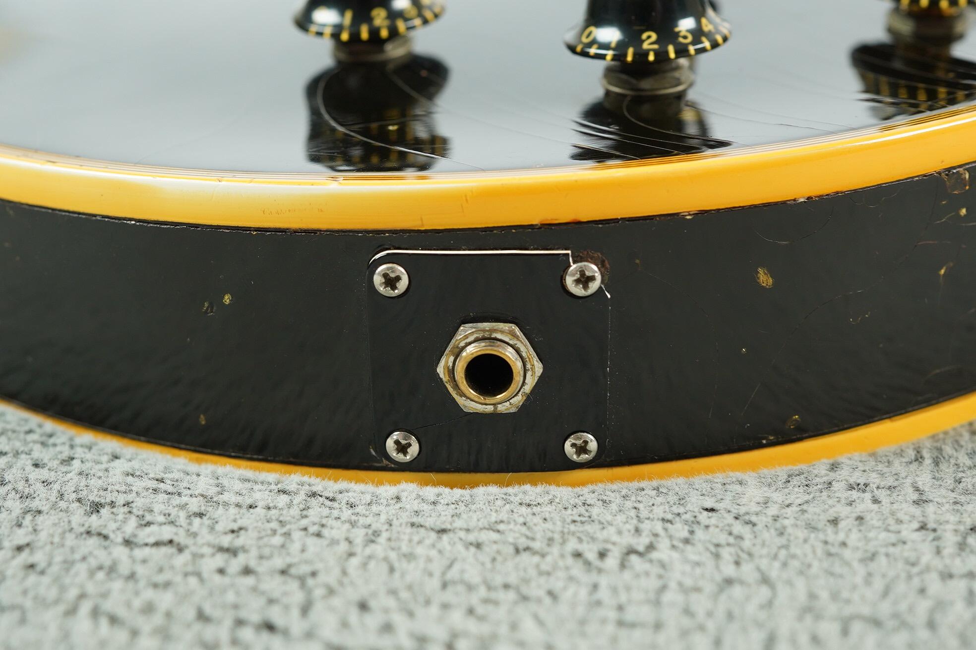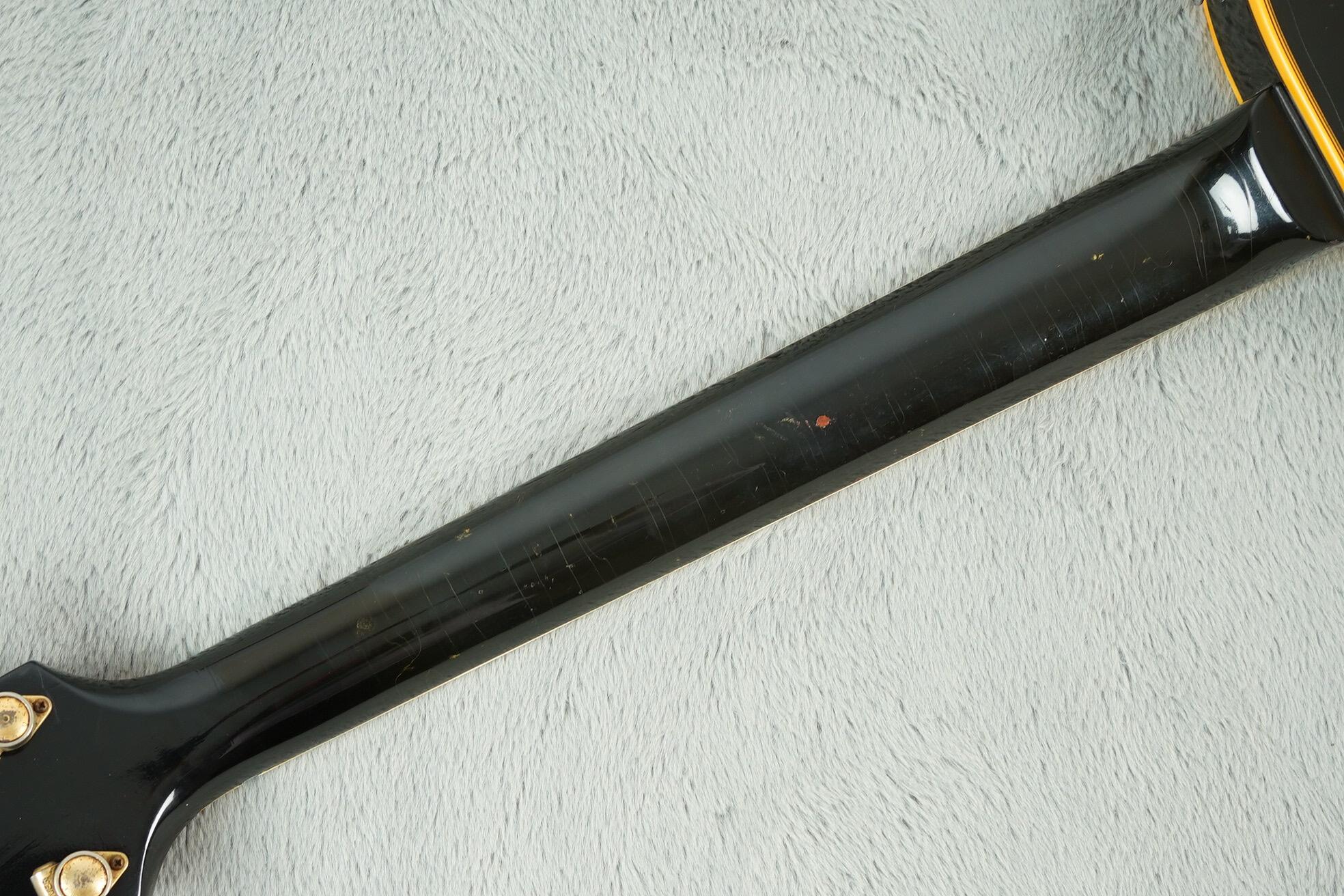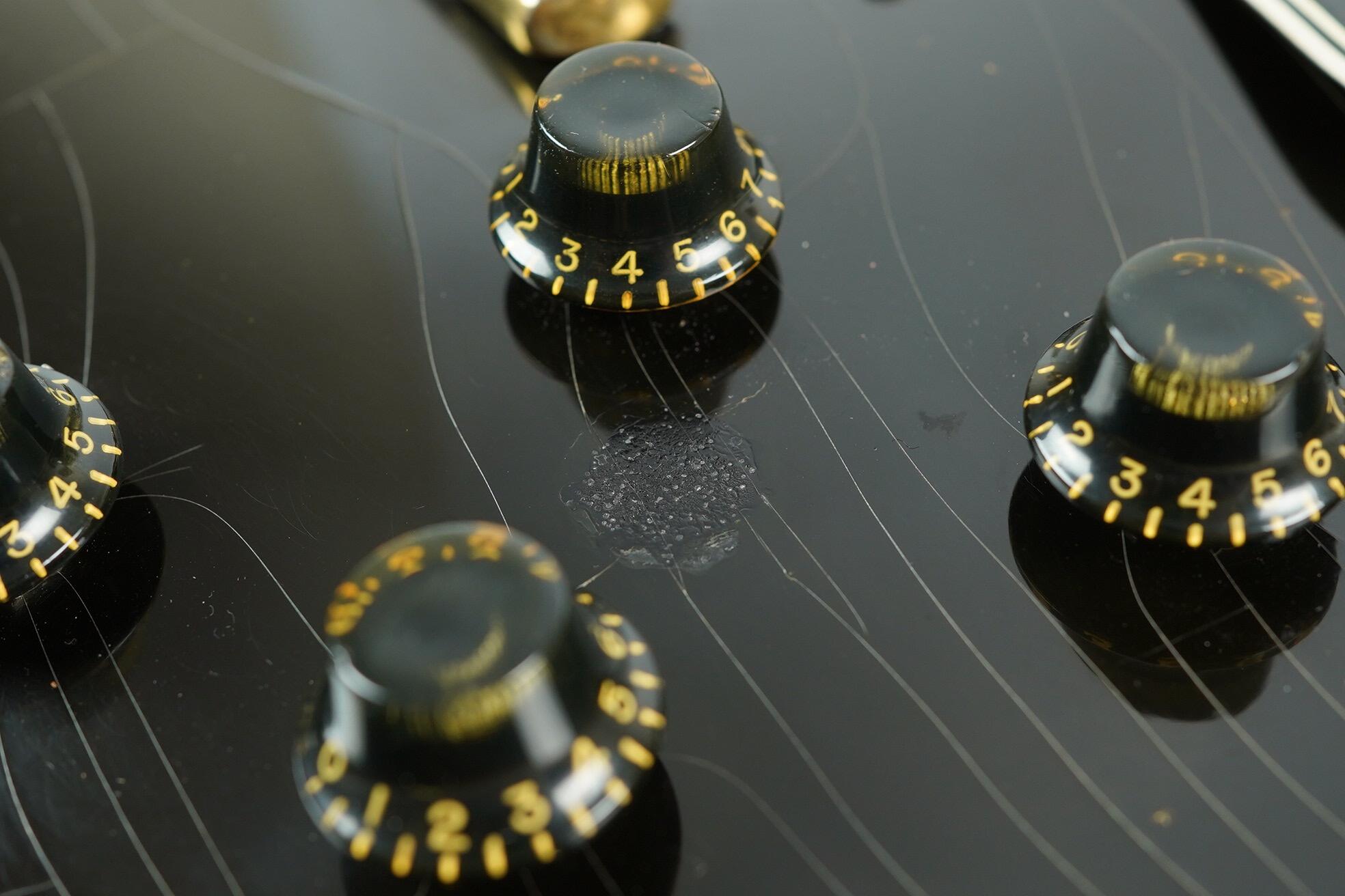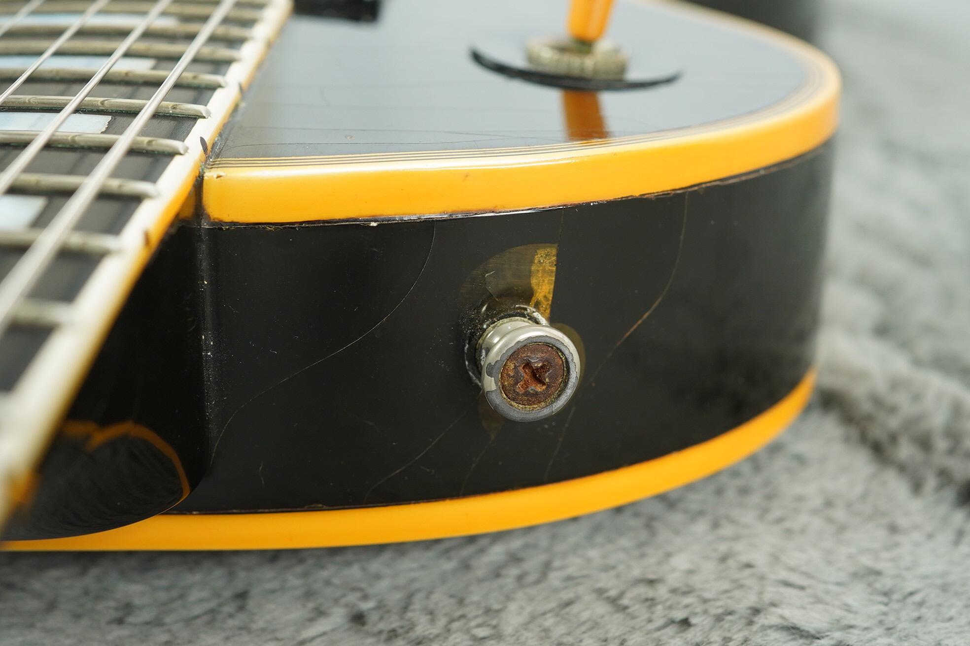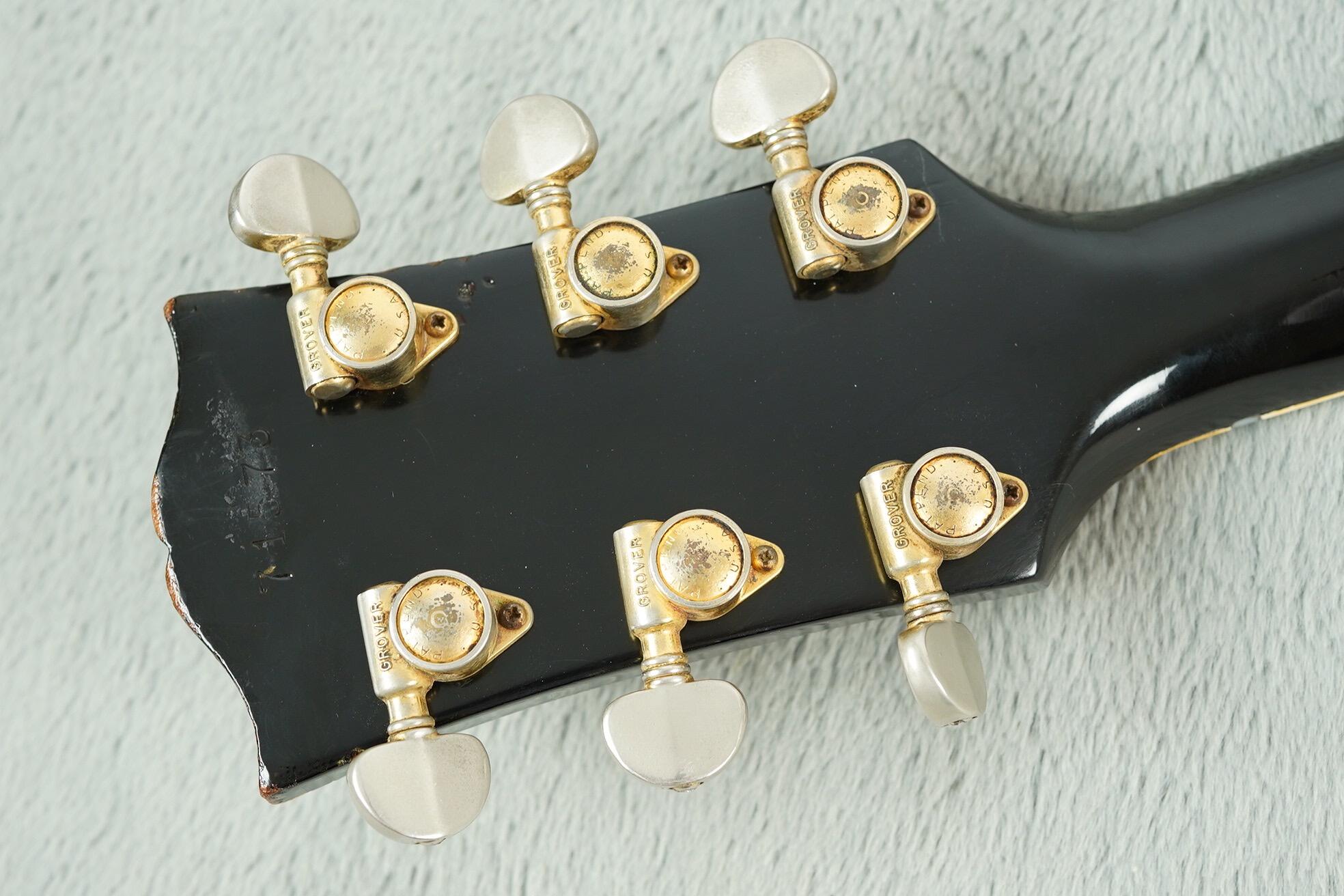 Starting from the top you have the Custom split diamond headstock inlay below the '50s open "b" open "o" dotted pearl Gibson logo. Tuners are period correct, gold plated Pat. Pend. Grovers that give really good stability and tuning. The serial number has been restamped to the back of the headstock. There is what appears to be a well repaired headstock crack beneath the black refinish. Under blacklight there is no fluorescence to the headstock until you get beyond the first fret, the rest of the guitar fluorescing as expected of a Nitro finish with a few years under it's belt.