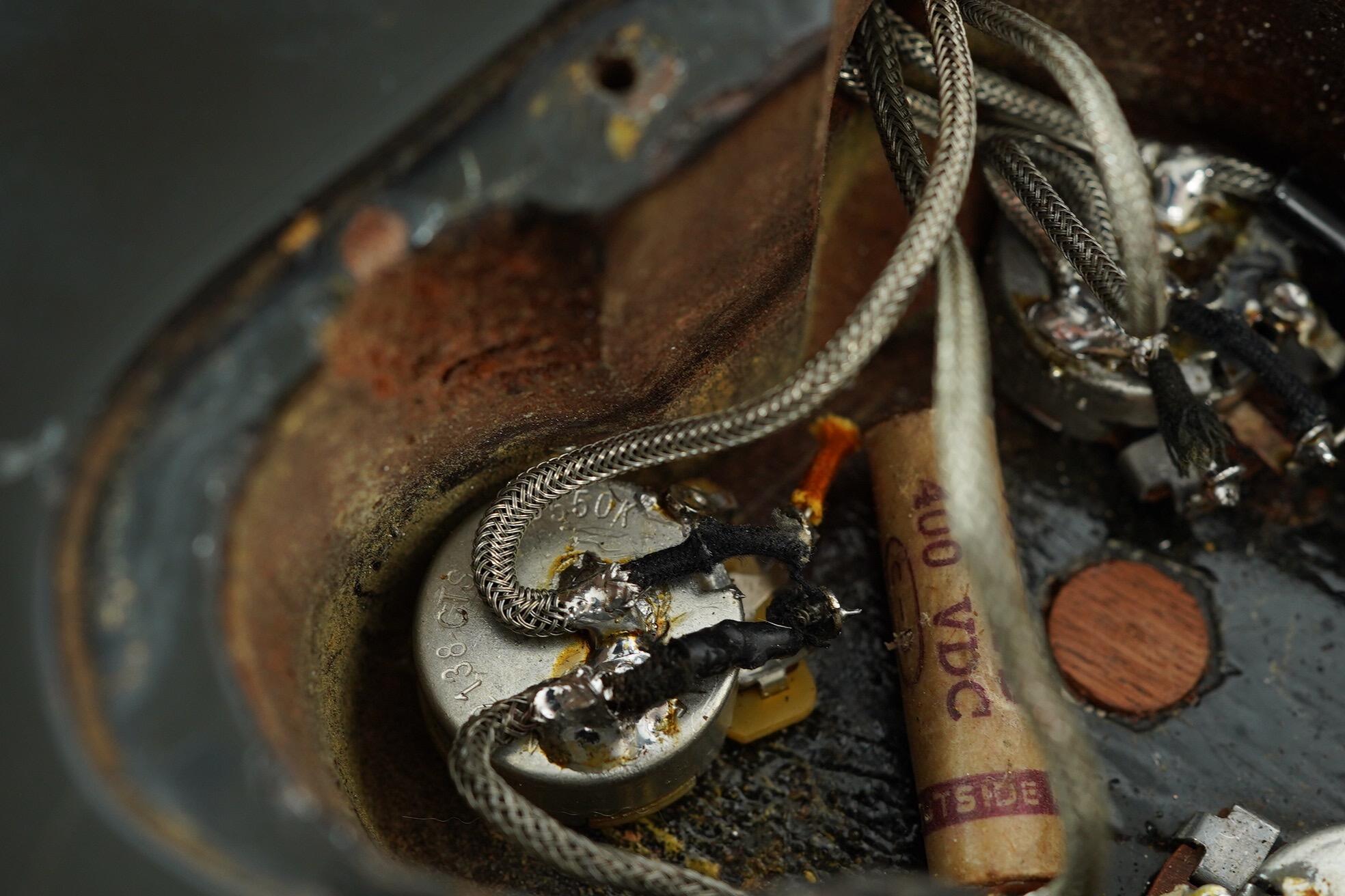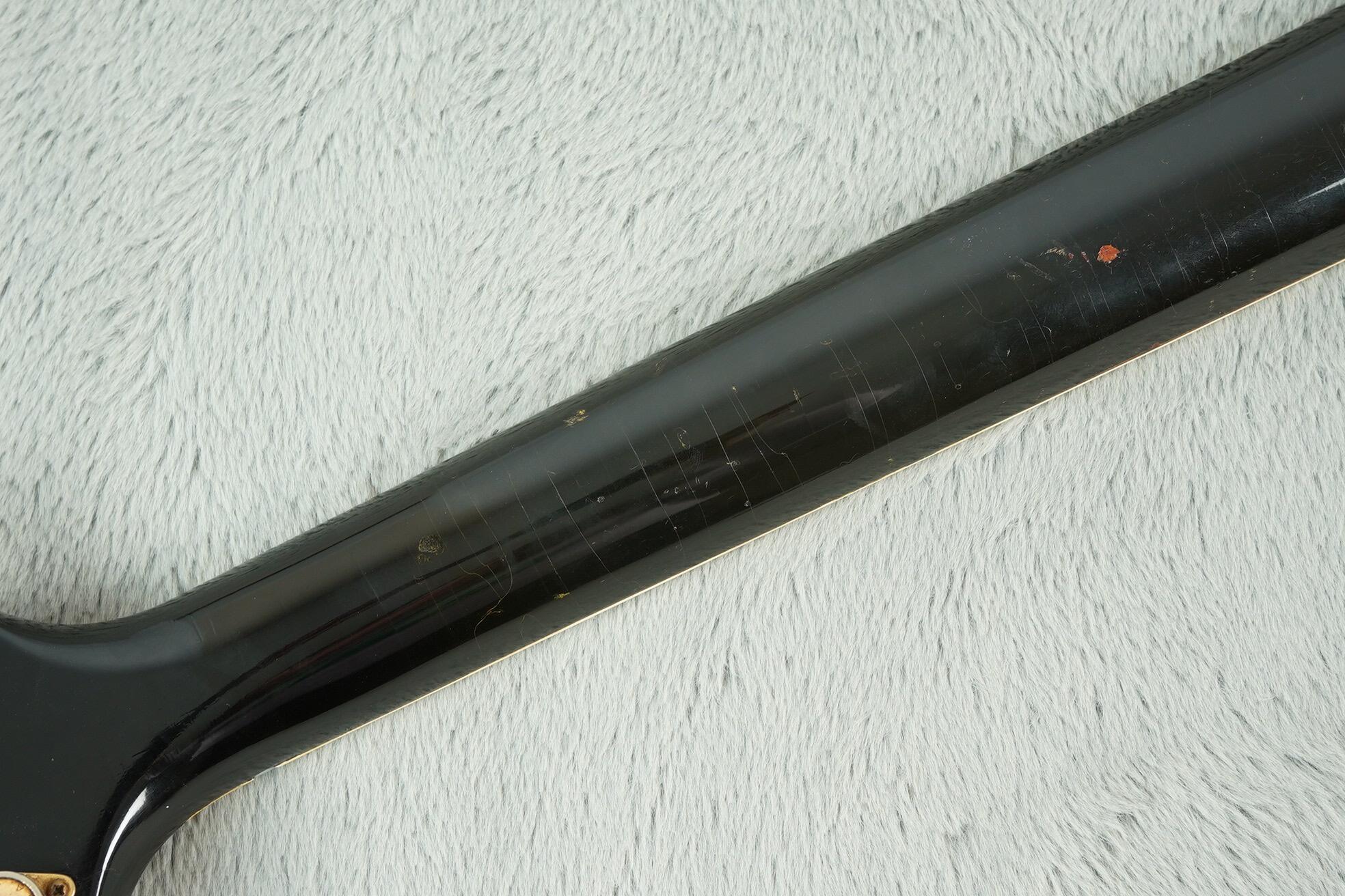 Modifications: Refinished, changed pickups, later pots & wiring, nut, frets, pickguard, pickups, switch tip, poker chip