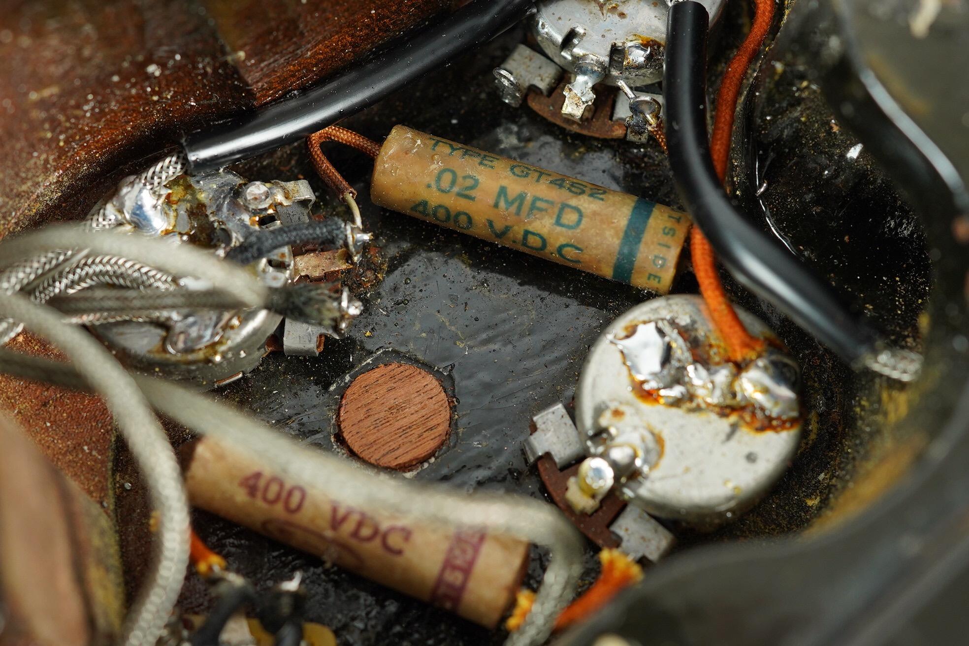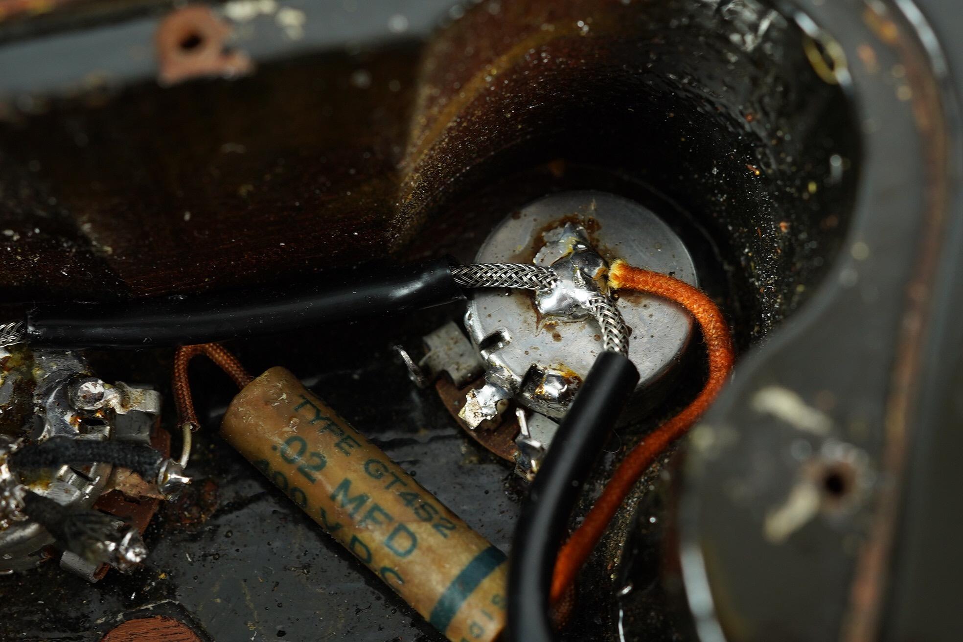 The ABR-1 no-wire bridge and stoptail are correct, the poker ship, pickguard and switch tip are repro parts. The knobs are correct black bonnet style and in between them is a filled hole likely from a previously added switch.
