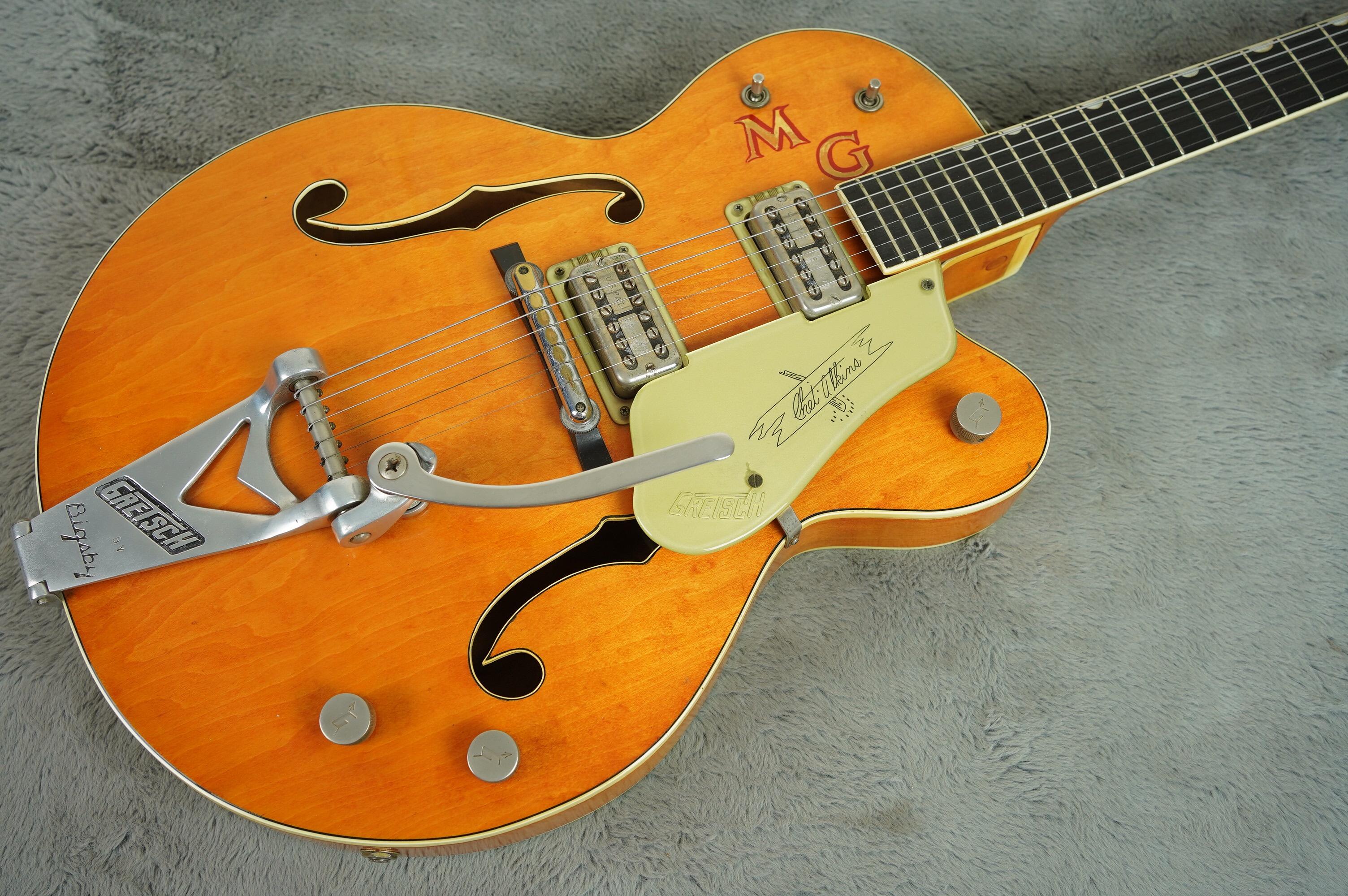 This guitar is in great condition considering its long years of faithful service. The top has faded a little which brings out the grain nicely. There are a few marks here and there and the initials MG have been hand painted onto the top. The binding, always a point of contention with Gretsches, is remarkably intact.