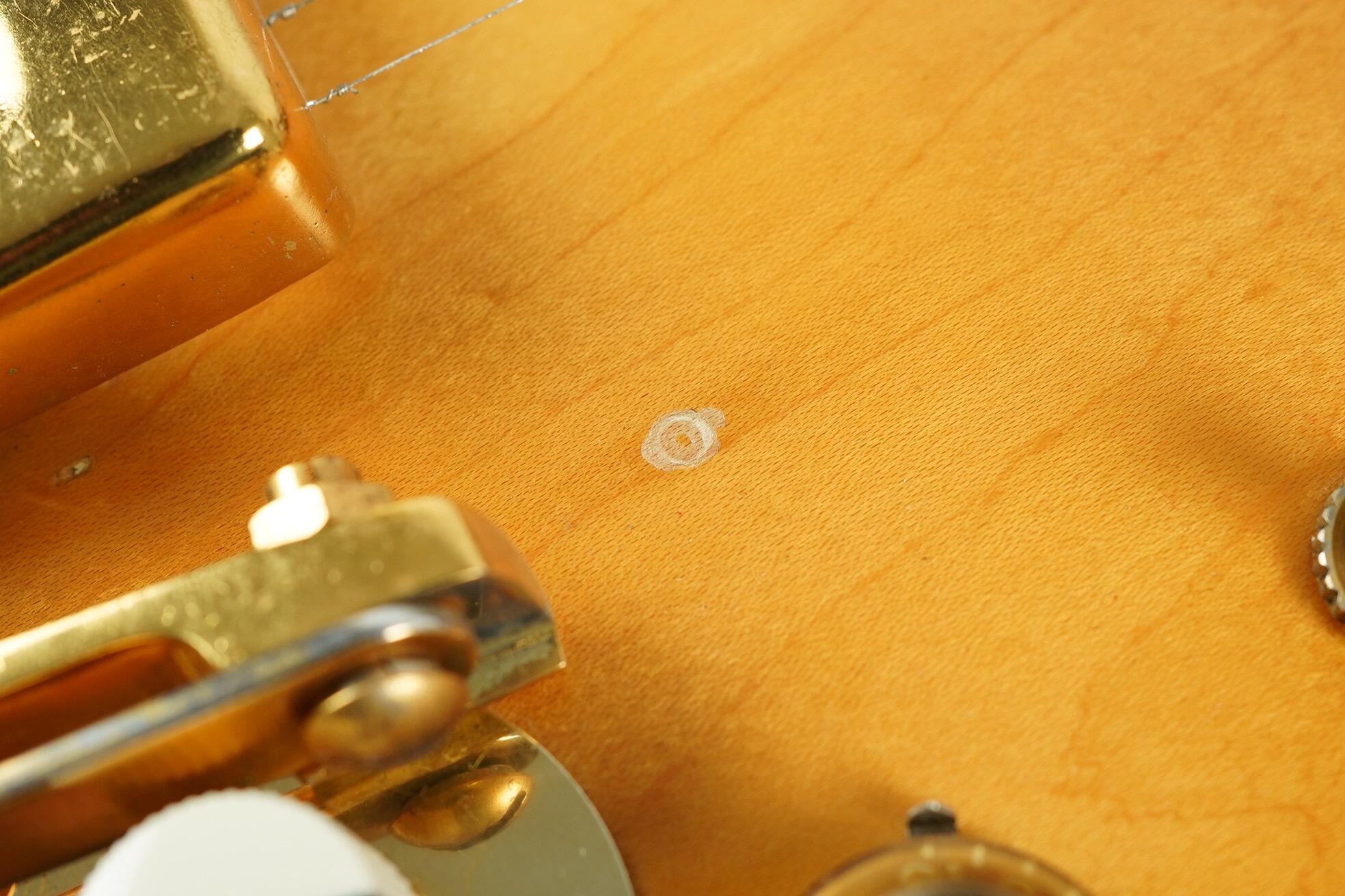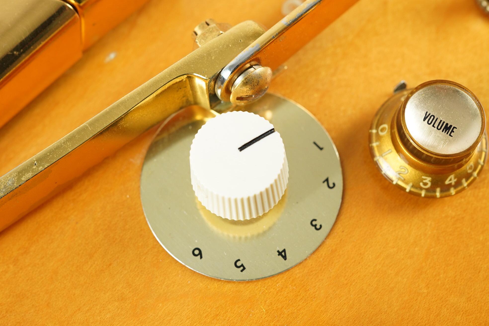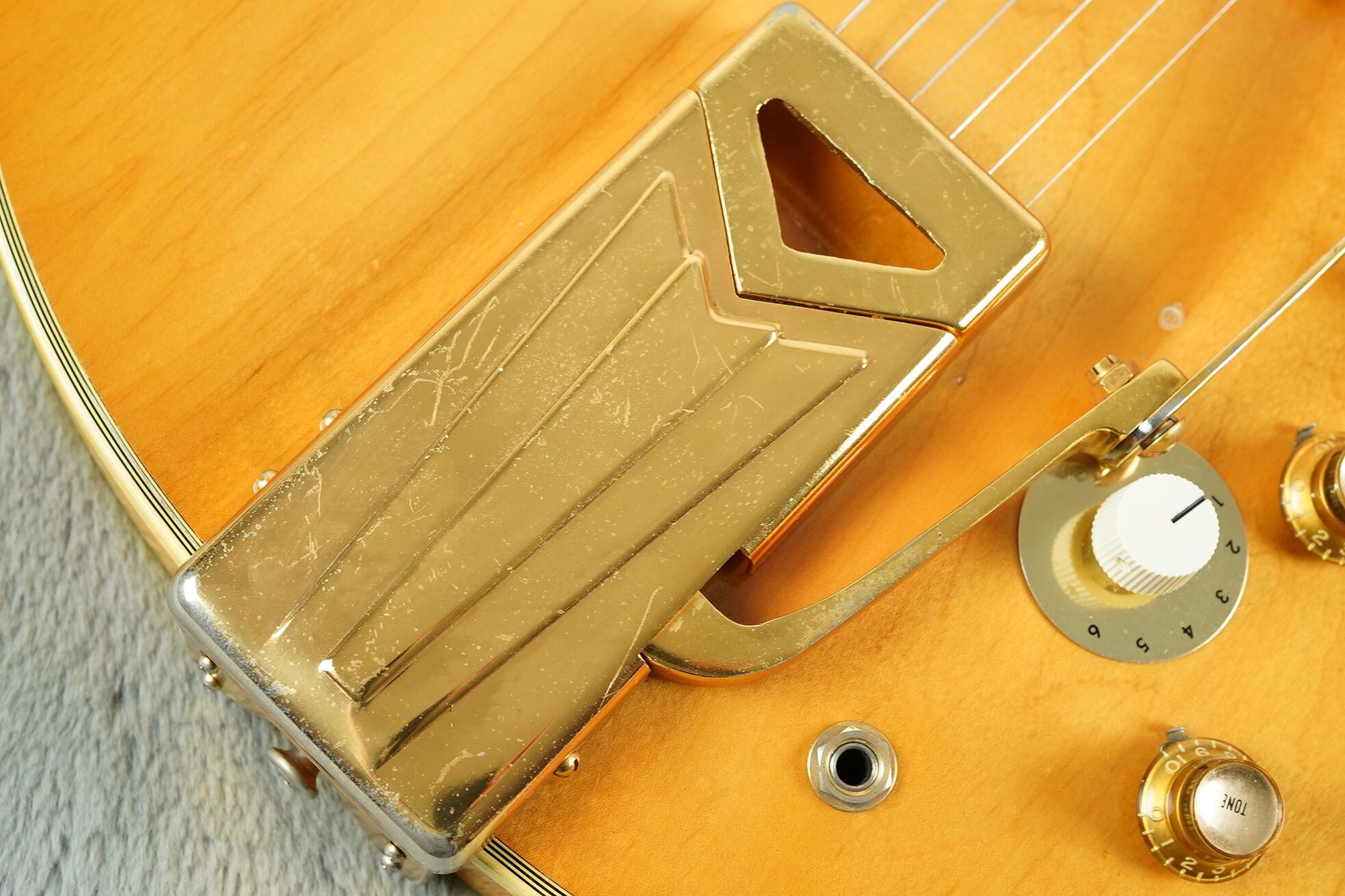 It also appears a Maestro trem was fitted at some stage due to the presence of filled extra screw holes by the strap button however what is more than likely the original Vibrola trem has now been fitted. and there are no extra holes visible on the top, however two are visible under the Vibrola. The Varitone knob has also probably been changed but there is a chicken head black knob in the case however the trem arm will not work properly if this is fitted under the current string tension (.010's).