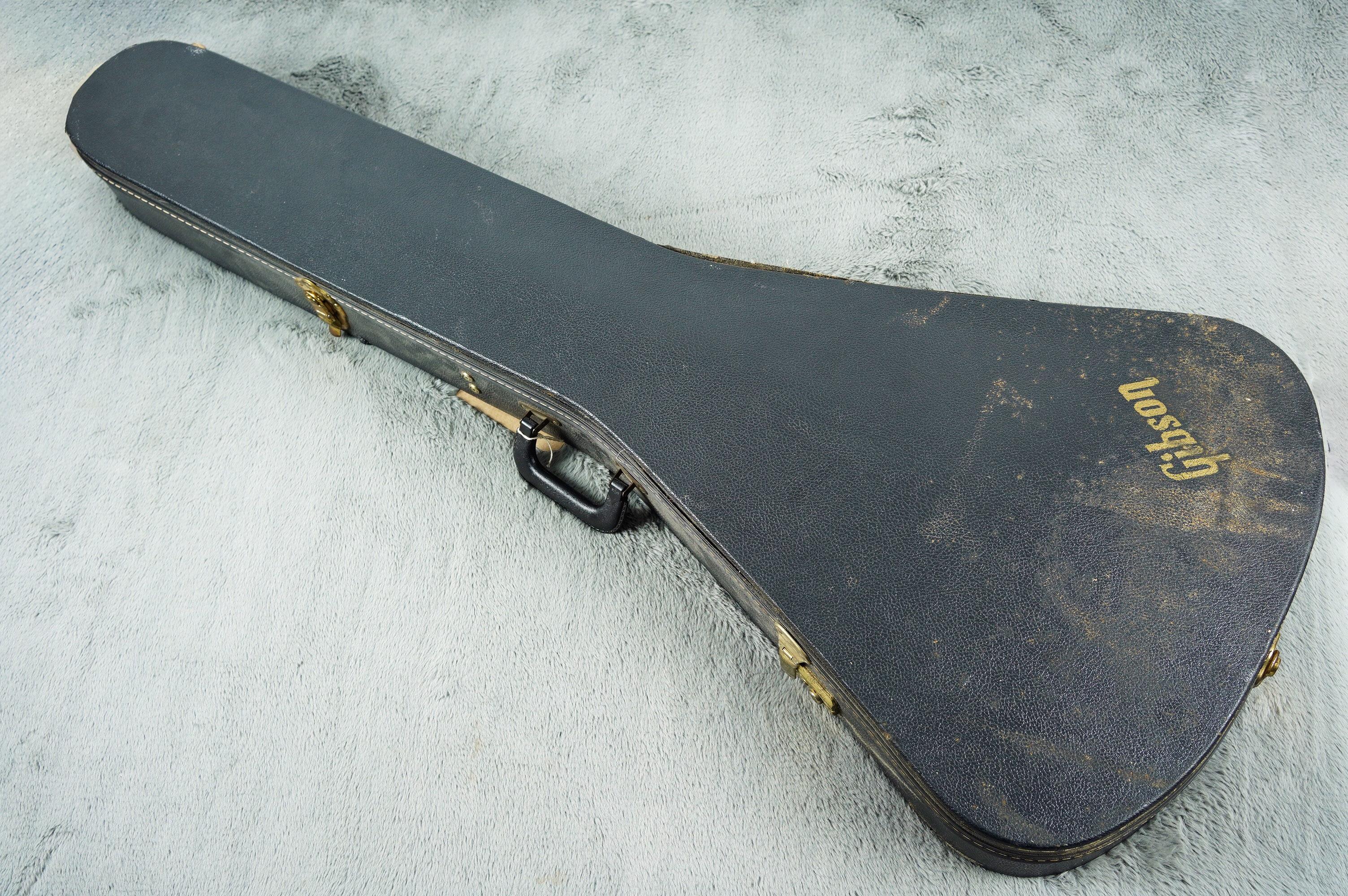 Plastics are in equally good condition with the black, wide bevel pickguard, truss rod cover and bonnet knobs mirroring the type used in ’58. The pickups are a pair of Tim Shaw Humbuckers with 153 and 154 ink codes. Described in the Gibson Publicity sheet as Pat. Appl. For humbucking pickups these highly regarded pickups were Gibsons earliest attempt at reissuing the original 50’s PAF designed by pickup guru Tim Shaw. Pot source codes are solder obscured but everything looks clean and untouched under the hood.The guitar is a great player, featherweight at 6.5lbs with a lively resonant acoustic voice. The V shape and Korina wood combination offer something different tonally with a sweet, high end sparkle to the acoustic and amplified voice. The pickups measure 7.05k in the neck and 7.13K in the bridge, an addictive guitar to play it offers great tones wether clean, edge-of-break-up of fully broke up. The neck is a medium C profile with unrestricted access to the fret board. The nut measures a comfortable 43.33mm with 1st and 12th fret depth measurements at 22.15 and 25.44mm. A rare instrument that ticks all the boxes wether for player or collector alike. The guitar comes with its original Gibson branded black case.