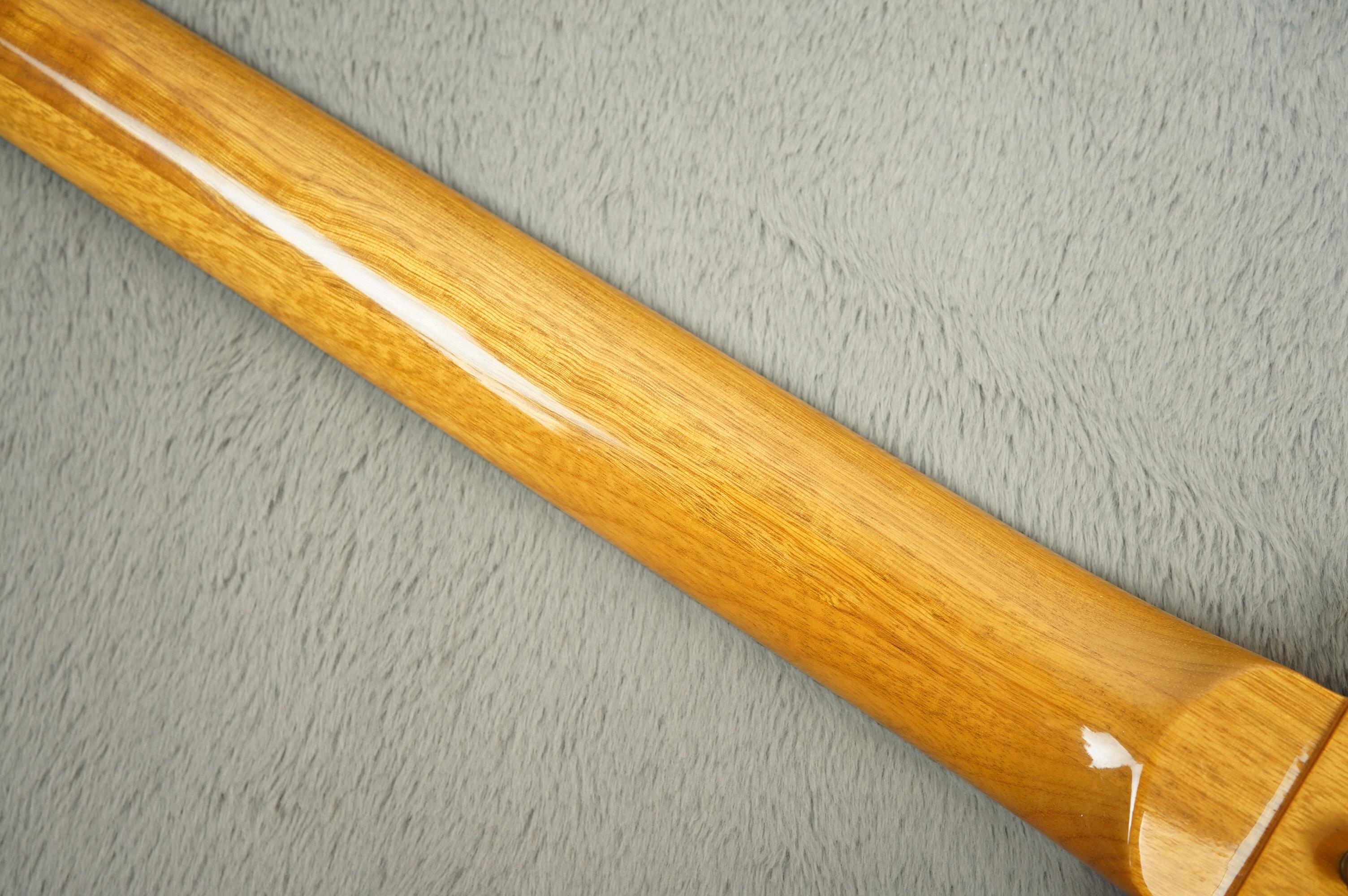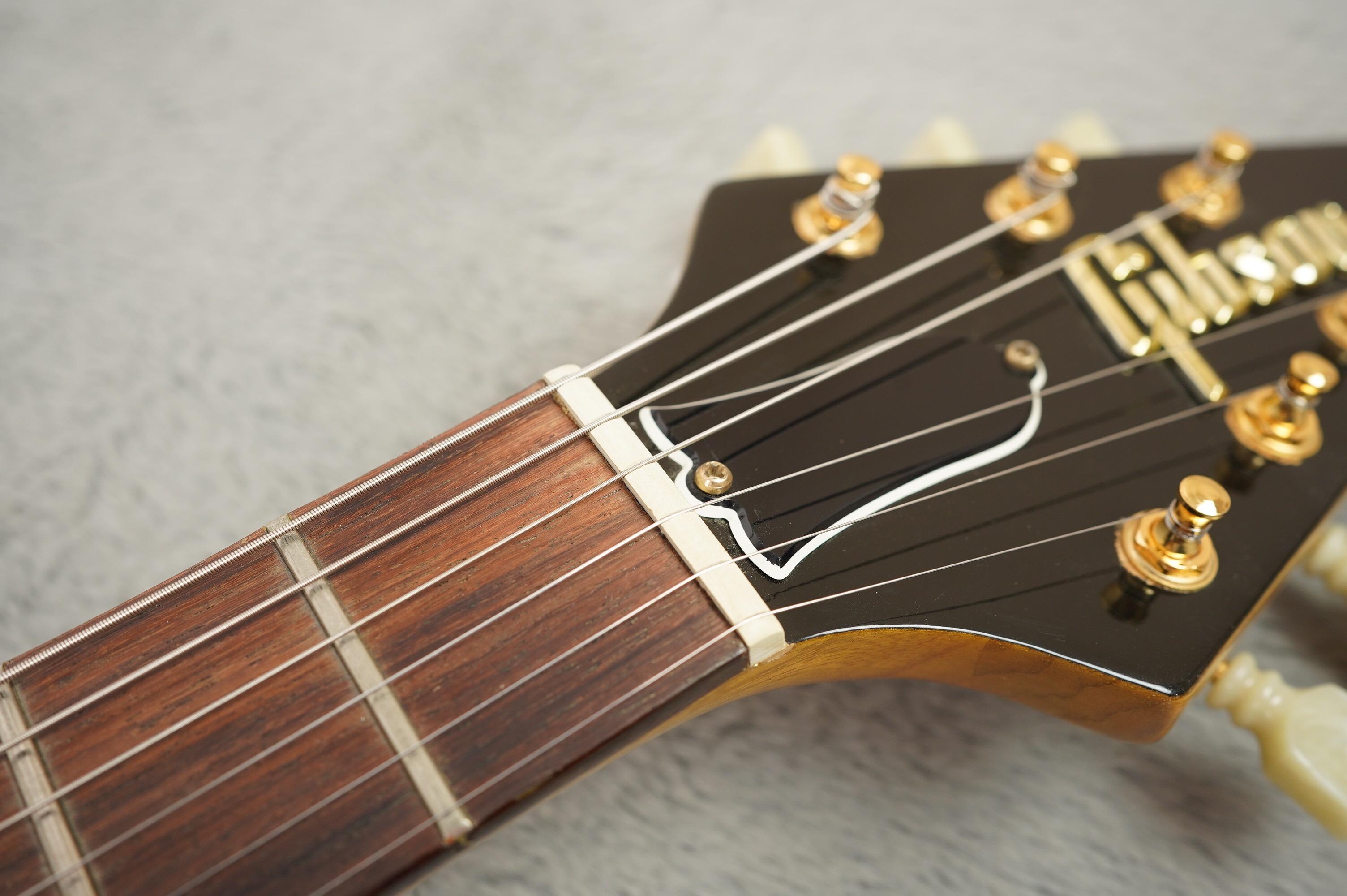 The three piece Korina neck meets the body at the 21st fret just like the original guitars from ’58 and is topped with an unbound Rosewood fingerboard with dot position markers. The guitar retains its original nut and frets. The hardware is gold plated, plating is still bright throughout and shows very little rub through or wear. Tuners are Kluson Deluxe Style with keystone buttons. The Bridge is a no-wire Patent Tune-o-Matic with plated saddles.