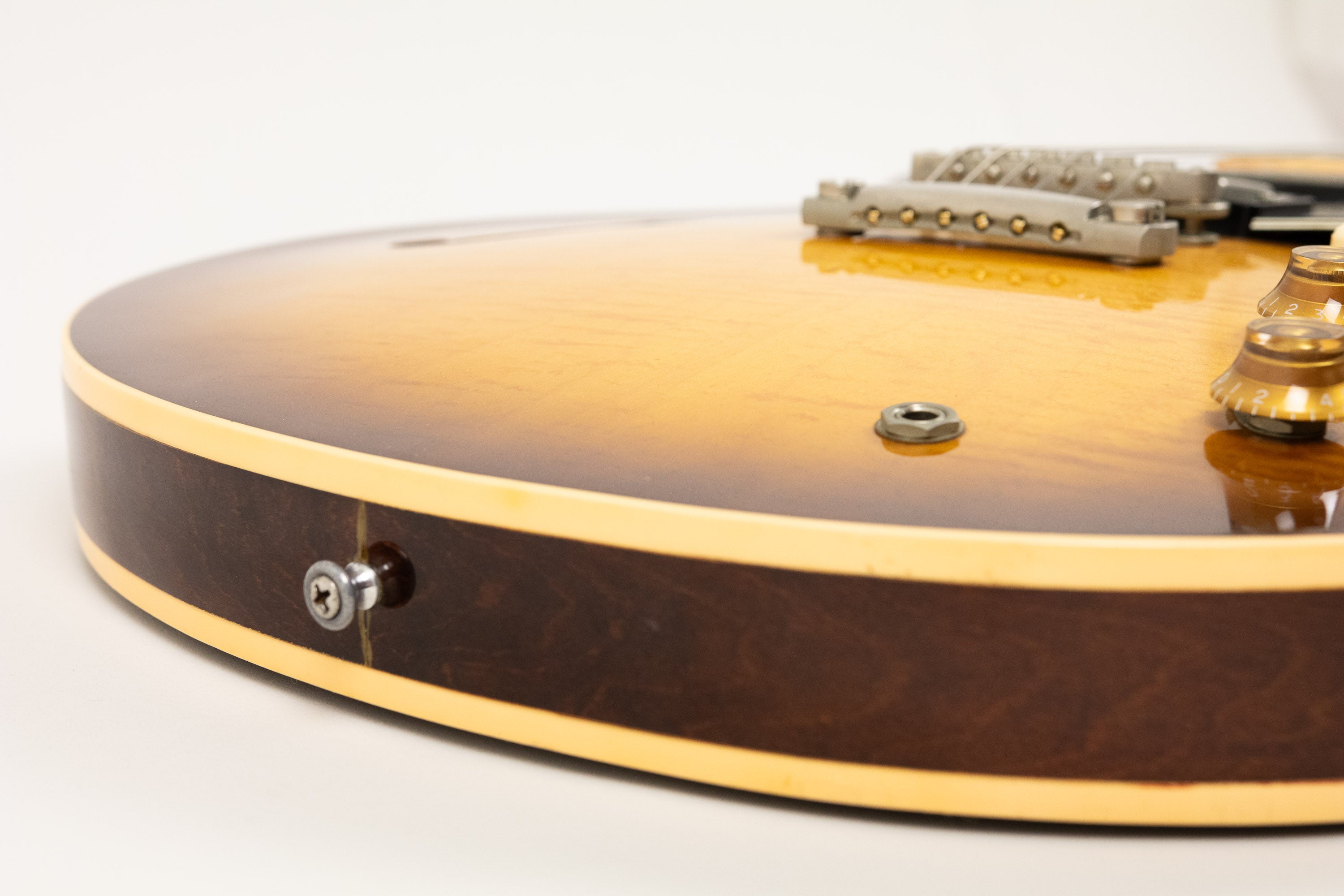 The neck sits in that comfortable slim-to-medium C profile that Gibson were favouring at the time, which is fast without feeling insubstantial. With a 43.5mm nut width and a nicely balanced carve (21.1mm at the 1st fret, 24.4mm at the 12th), it feels immediately familiar in the hand. The original frets and nut are retained and still have plenty of life, contributing to a very nice overall playing feel. The guitar is currently fitted with amber bonnet knobs, while 3 black speed knobs are included in the case.