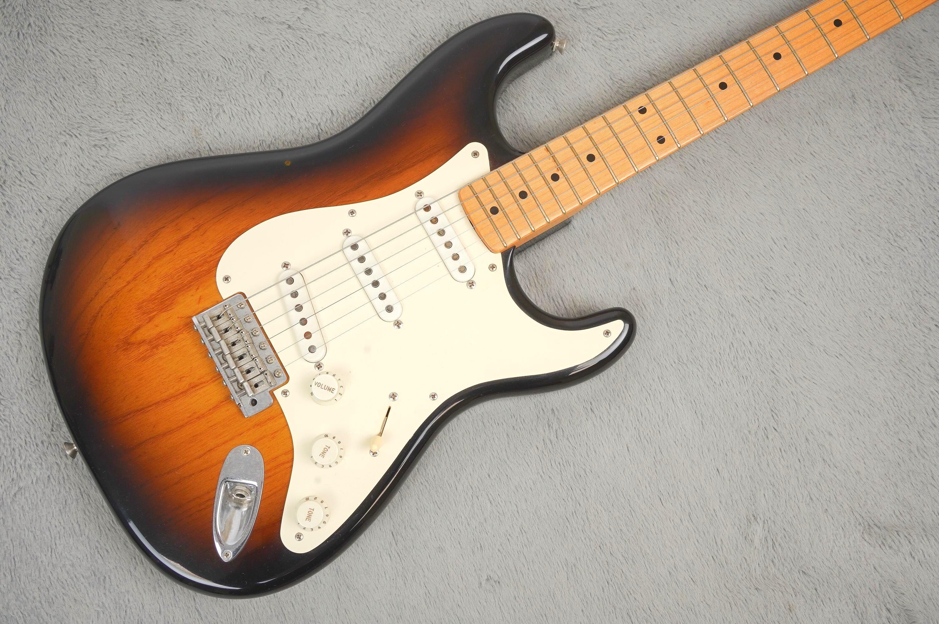 Wonderful Fender Custom Shop 1954 Stratocaster from 2004. Released in celebration of the 50th Anniversary of the Stratocaster, these faithful replicas were be made with the same exacting detail as the original instruments, using many of the same machines and manufacturing methods used back in 1954. Each guitar was built by a Custom Shop Master Builder and featured and a nitro-cellulose lacquered, two-piece ash body with offset glue seam and one-piece ‘U’ shape maple neck. Three Custom Shop Vintage 1954 pickups, an original synchronised tremolo with bridge cover, bone nut, serialised round-hole Tremolo cover plate, special documentation and an original form fit brown case.