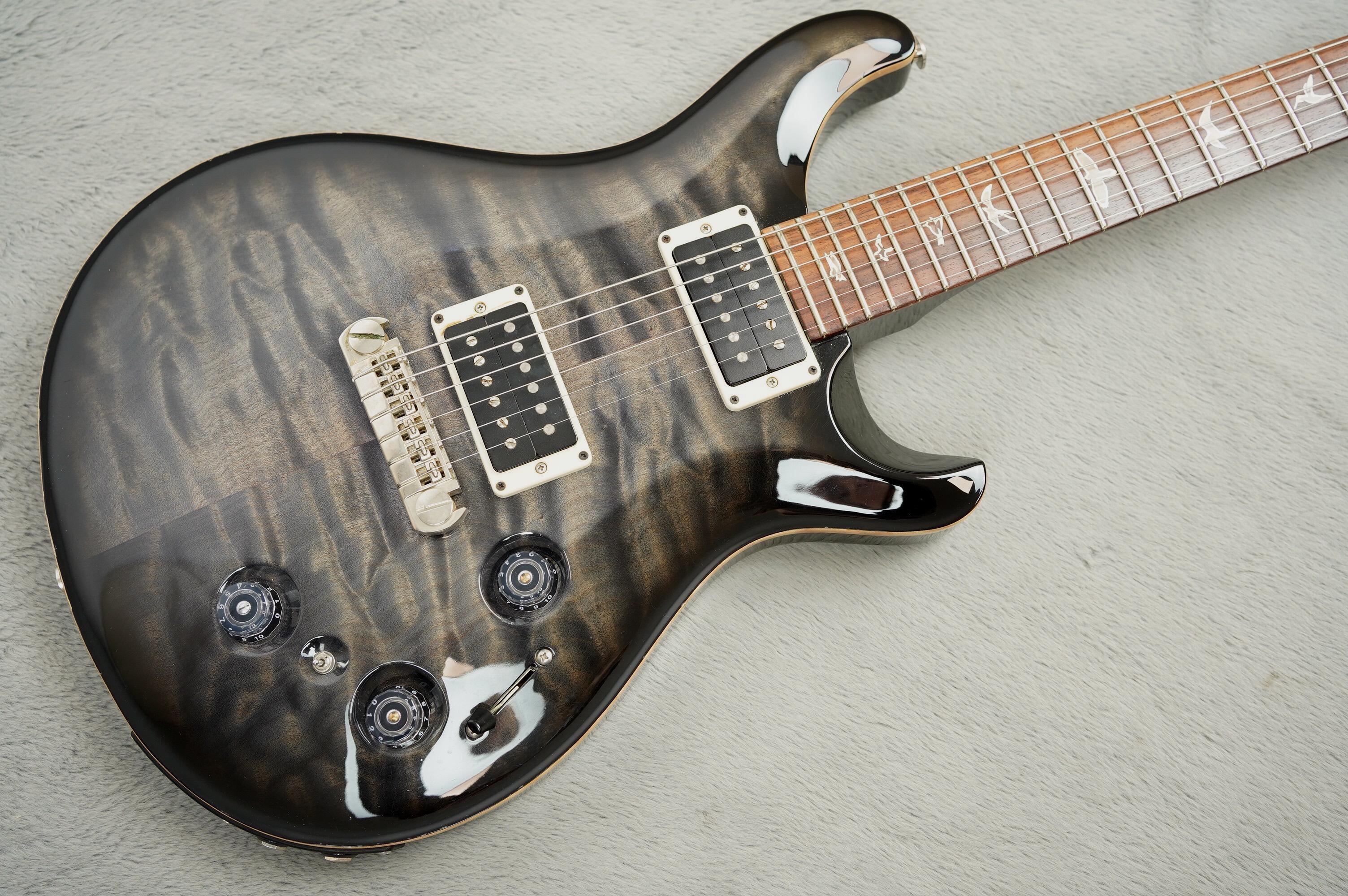 The body is made from Mahogany with a carved figured Maple top, finished in a striking Grey/Black that highlights the natural flame of the maple. The Mahogany neck is carved into the comfortable Pattern Regular profile and paired with a Rosewood fingerboard adorned with PRS’s signature bird inlays. The 25” scale length and 22 frets make it a familiar feel for PRS players, offering smooth playability across the neck.