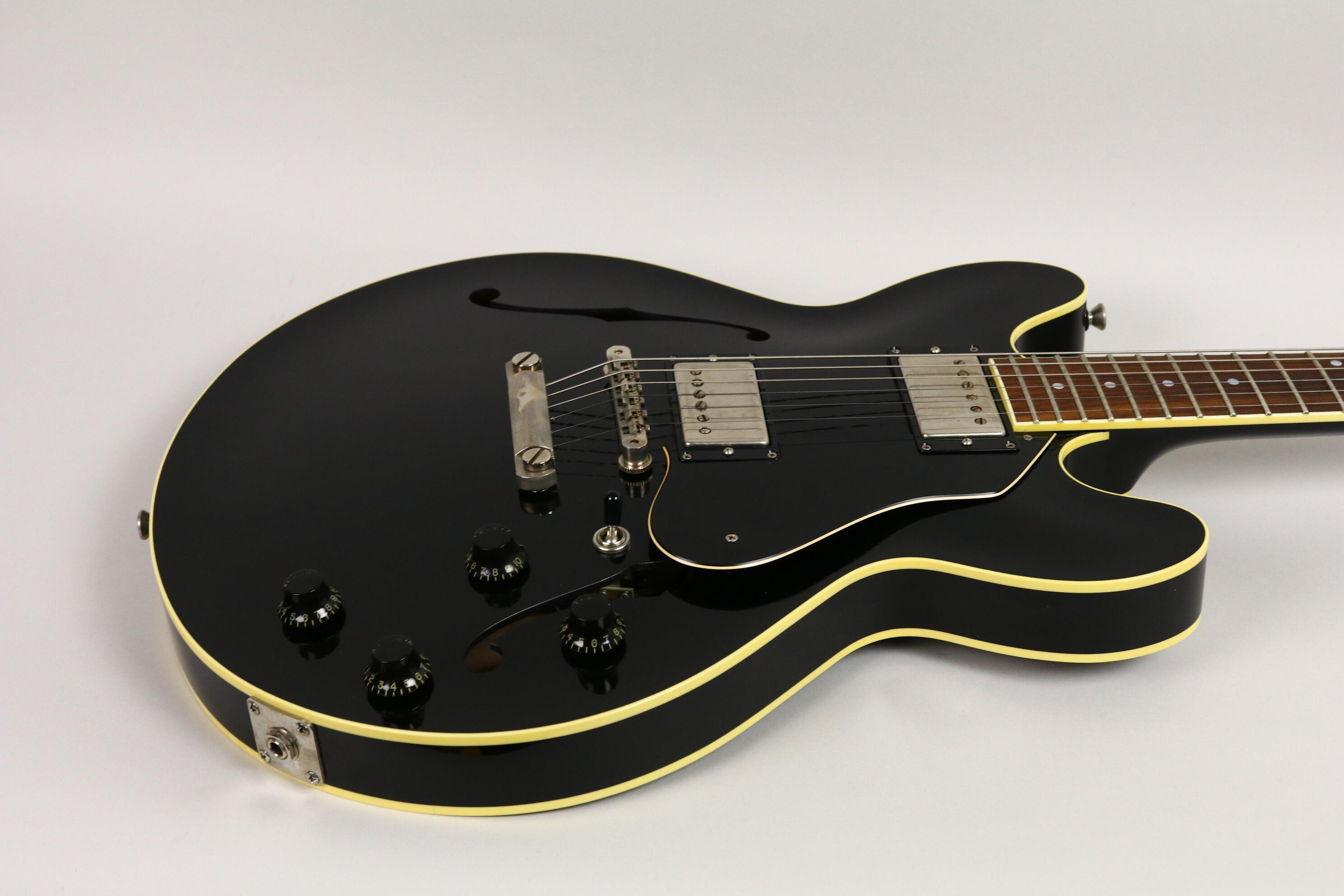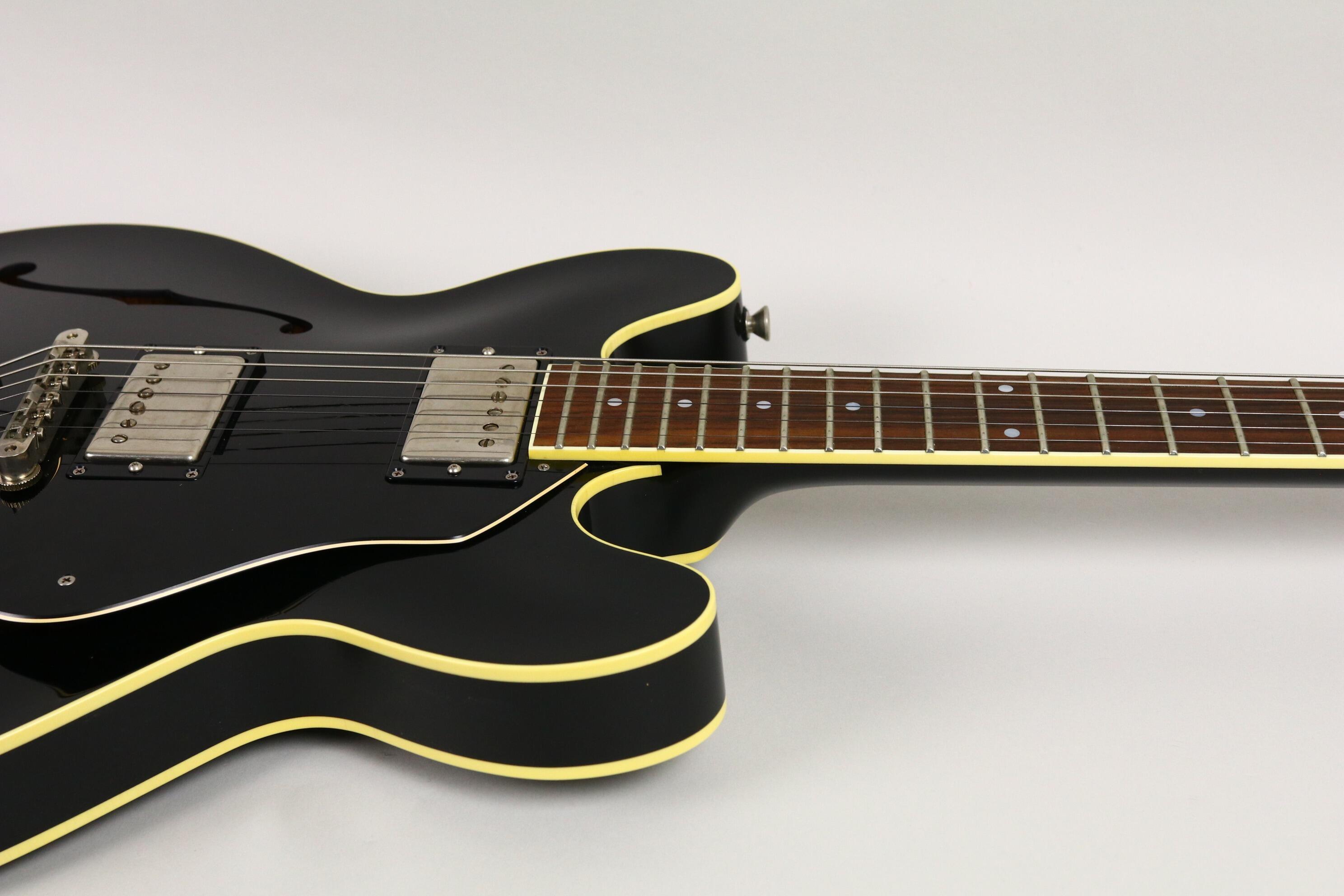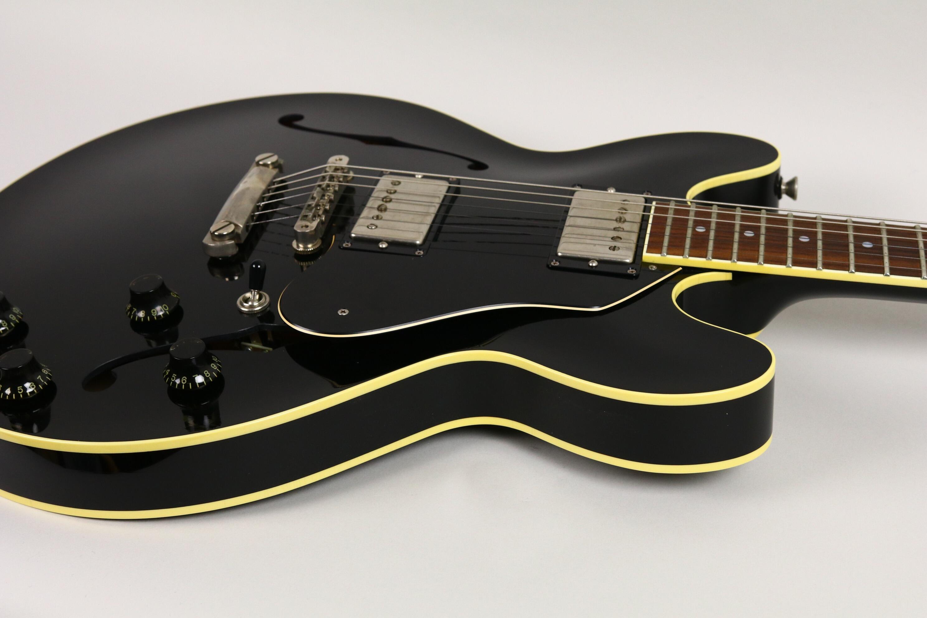 The laminated maple body and solid maple center block provide exceptional resonance and sustain while controlling feedback — striking the ideal balance between airy semi-hollow tone and solidbody focus. The aged nitrocellulose lacquer finish gives it the look and feel of a well-loved vintage instrument, with subtle checking and patina that make it feel instantly familiar.
