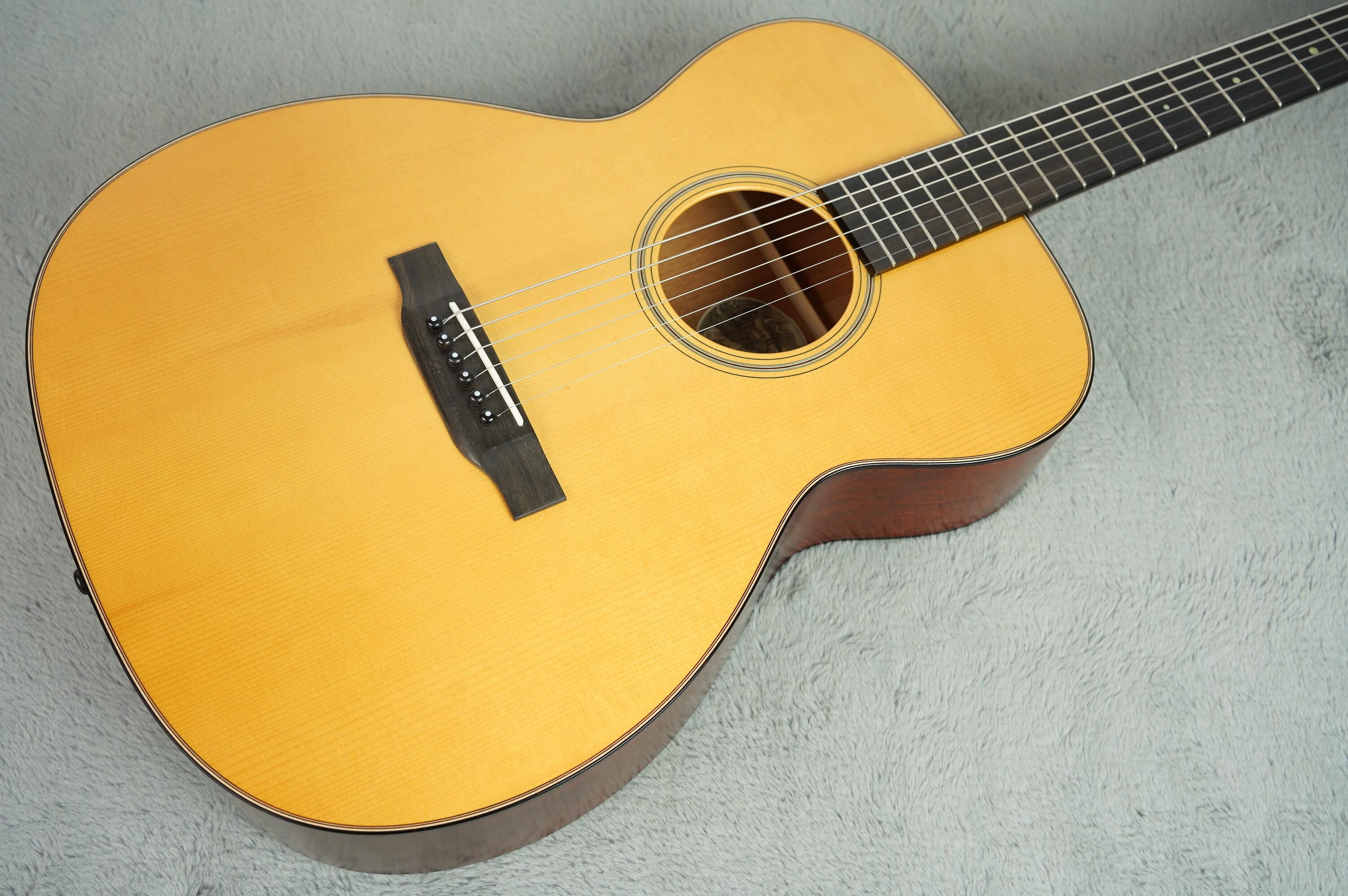 The Honduran Mahogany neck has an Ebony fingerboard modeled after Lage's 1939 Martin 000-18. It features a 25.5" scale length, a 14"-26" compound radius, medium nickel-silver frets, a 1 11/16" nut width, and gold mother-of-pearl dot inlays. It's comfortable to play, well-balanced, and of incredibly high quality.