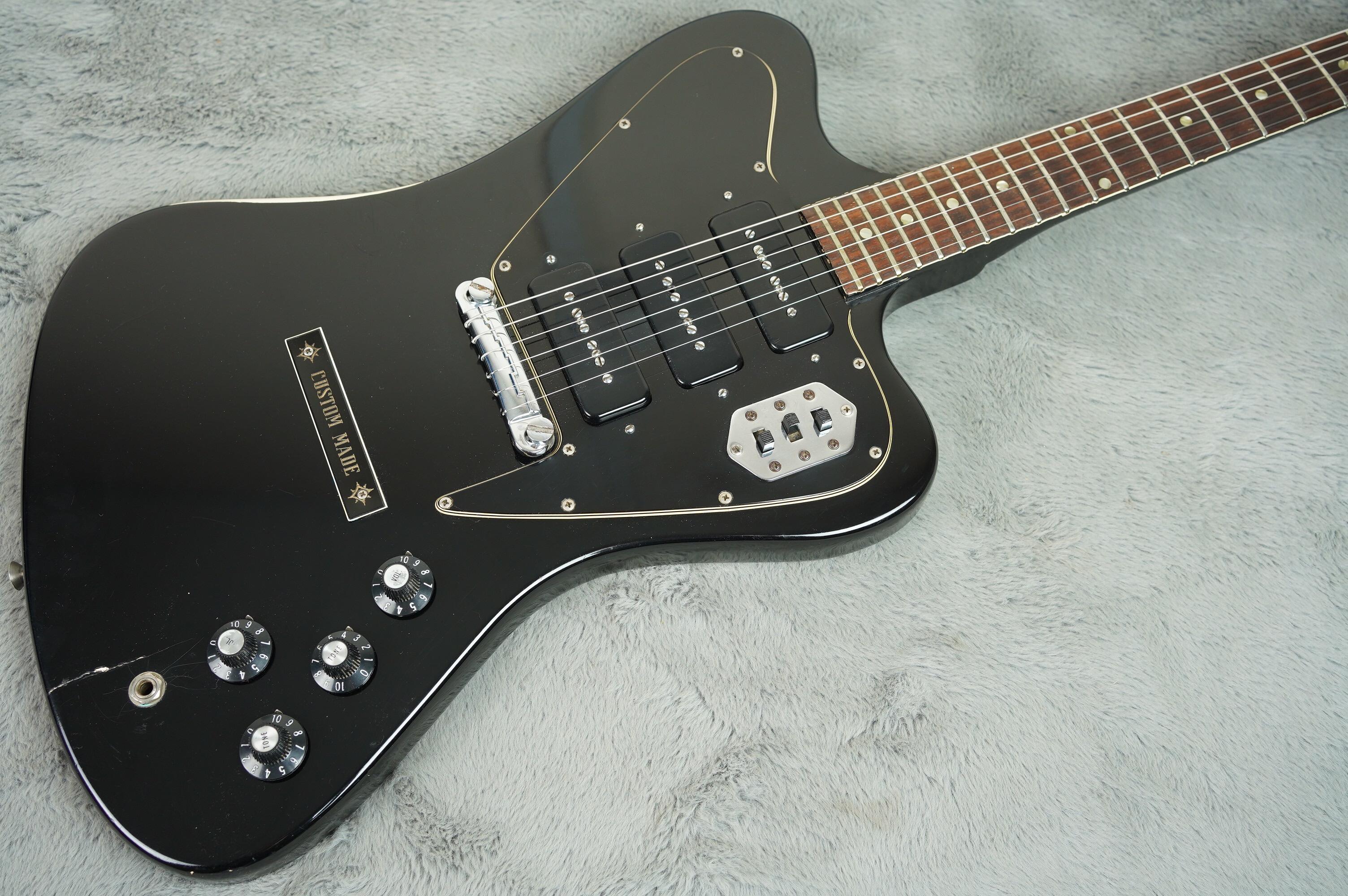 This is a 1969 (last year) Gibson Firebird III that Jimmy Page bought from Mike Ladd's Guitar City in Memphis TN along with a purple Les Paul. It has been modified with Jaguar style pickup switching, painted black, replaced pickguard and has the 'Custom Made' plaque on the body probably to cover the old short Vibrola holes (see pics).